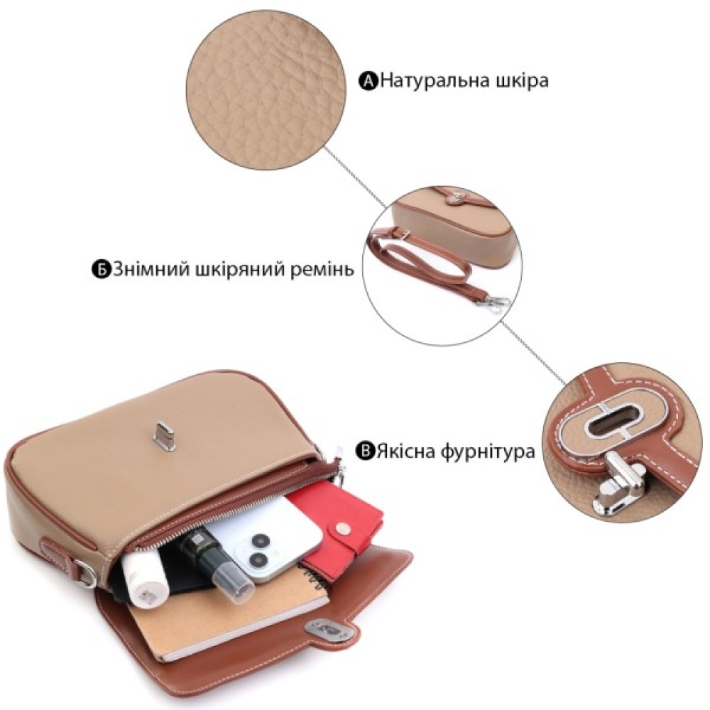 Стильная каркасная женская сумка из натуральной кожи. В изделии использована кожа бежевого и коричневого цвета. Притягує погляд у виробі фактурний клапан із тисненням під змію та витончена механічна клямка. Аксесуар складається з основного відділення, кишені-перегородки на блискавці, потайної кишені на блискавці та кишені відкритого типу, а також ще однієї кишені зовні, на тильній стороні. Носити сумку можна в руці, під рукою, на плечі і через плече, для цього є шкіряний ремінь, що знімається. В аксесуарі використано якісну фурнітуру кольору срібла. Універсальний варіант сумки на вечір, на щодня, а також буде відмінно поєднуватиметься з діловим стилем.