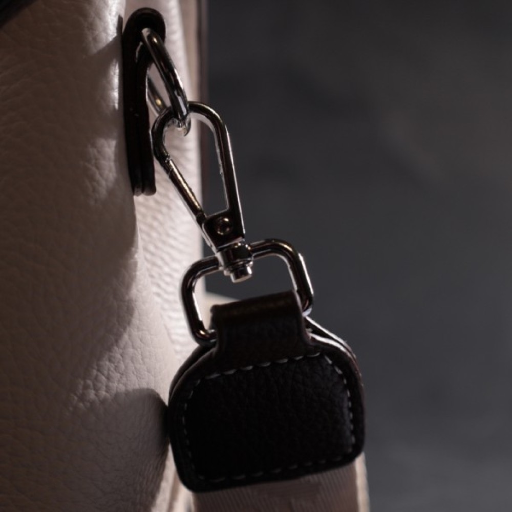 Носити сумку можна в руці, під рукою, на плечі та через плече — для цього є шкіряна ручка та знімний текстильний ремінь у колір виробу. В аксесуарі використано якісну фурнітуру кольору срібла.
