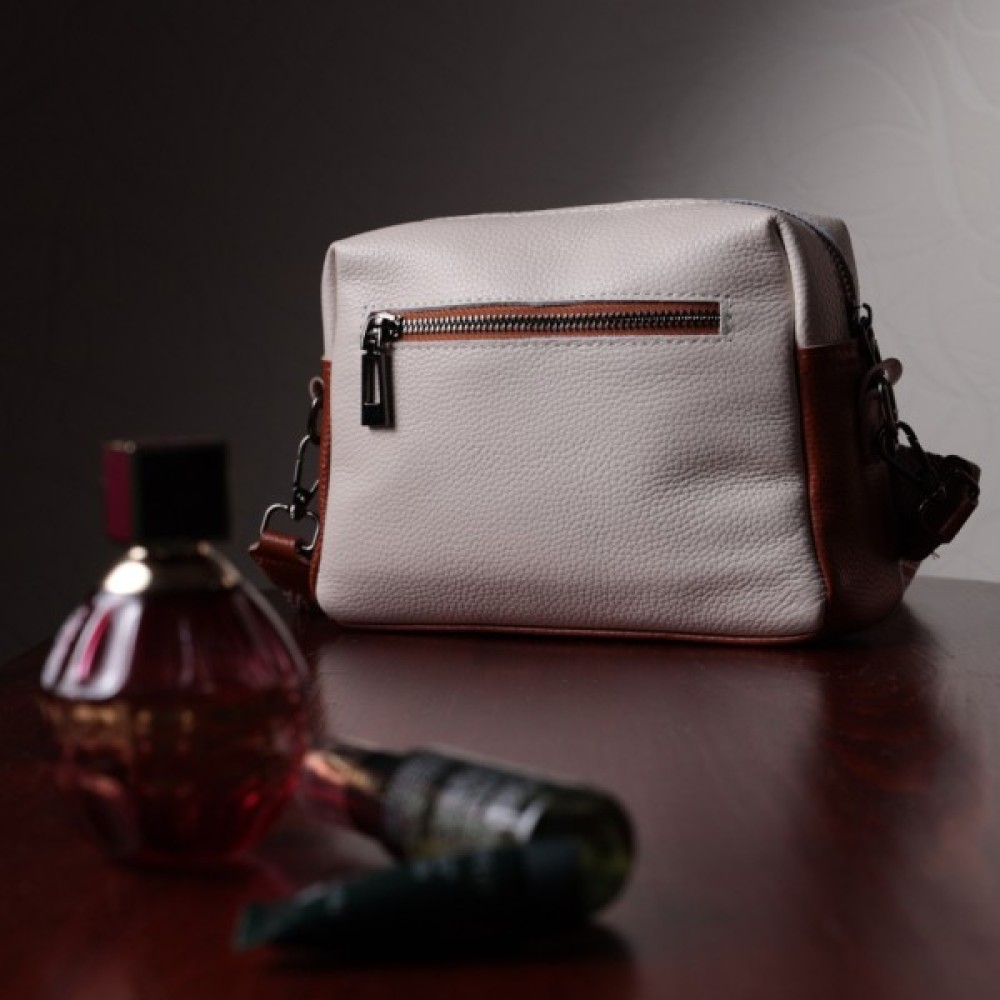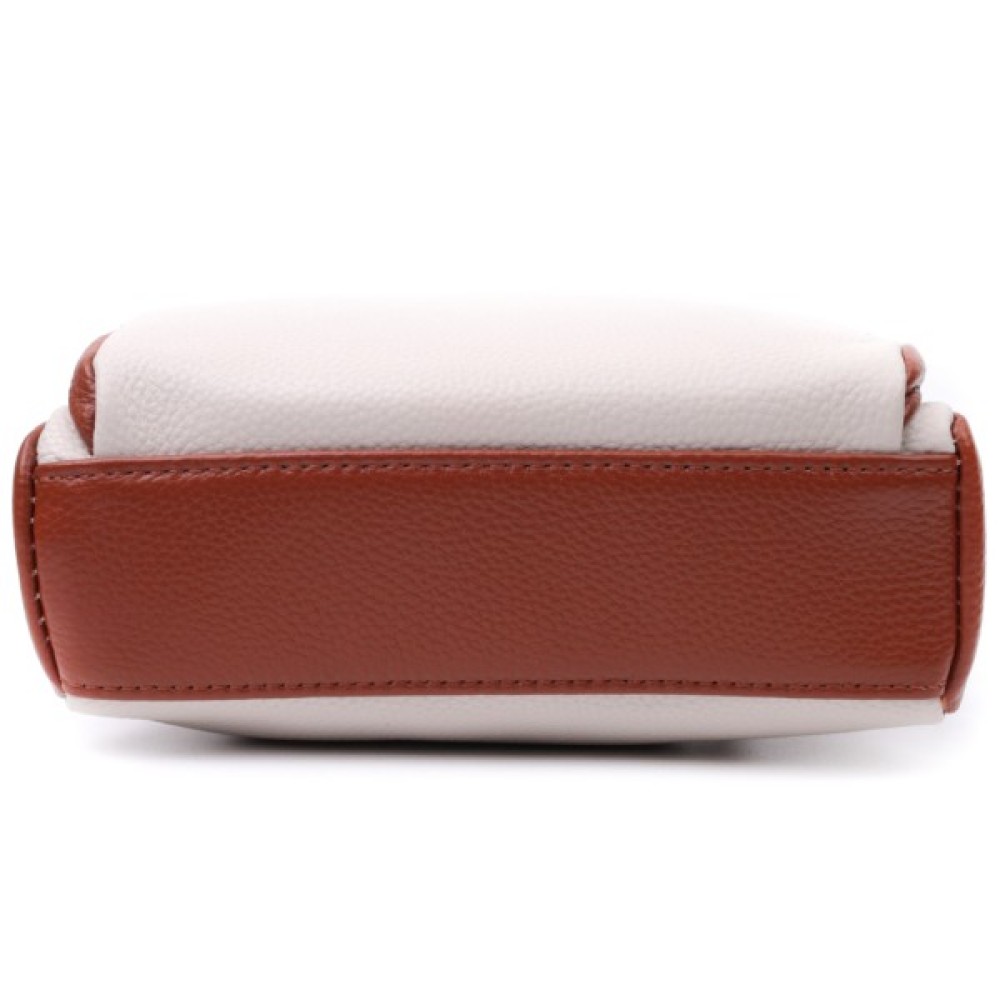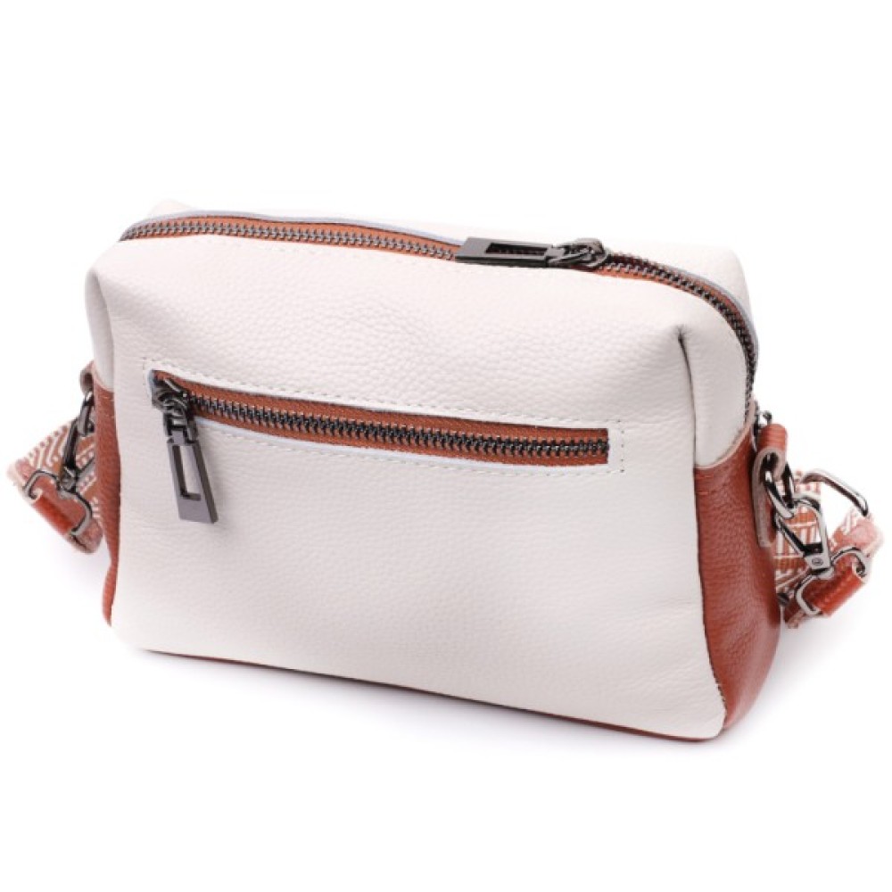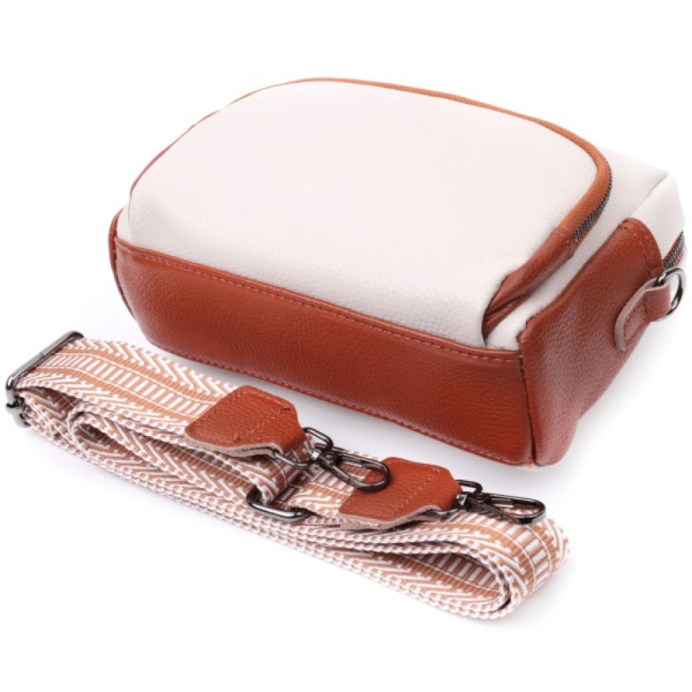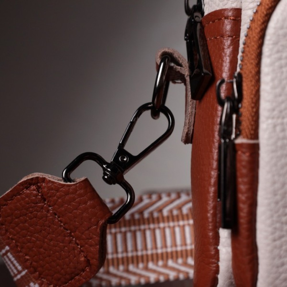 Відмінна жіноча сумка на кожен день із натуральної шкіри. У виробі використана шкіра білого та коричневого кольору. Притягує погляд у виробі текстильний ремінь із гарним малюнком. Аксесуар складається з основного відділення, потайної кишені на блискавці та кишені відкритого типу, а також двох кишень зовні на лицьовій та тильній стороні. Носити сумку можна в руці, під рукою, на плечі і через плече, для цього є текстильний ремінь, що знімається. В аксесуарі використано якісну фурнітуру кольору темного срібла. Відмінний варіант для подарунка близьким та дорогим дівчатам та жінкам.