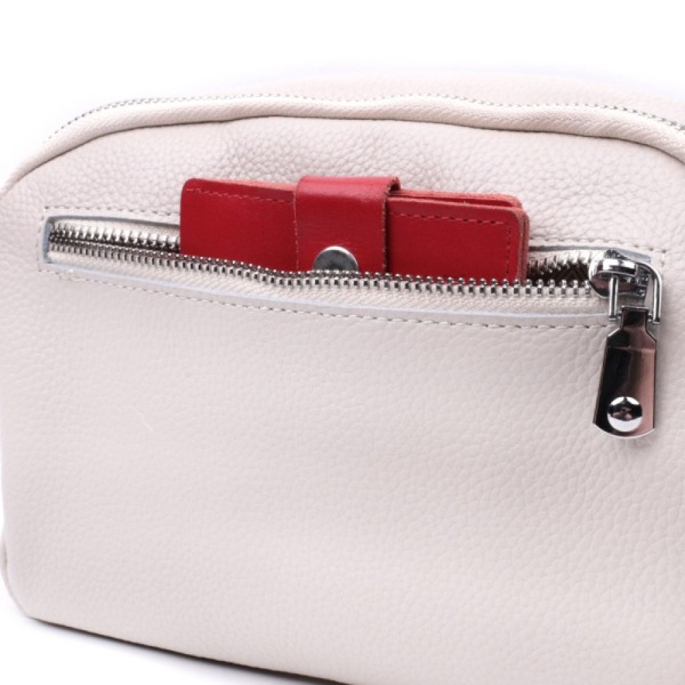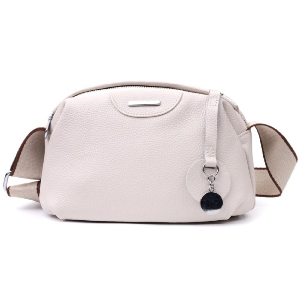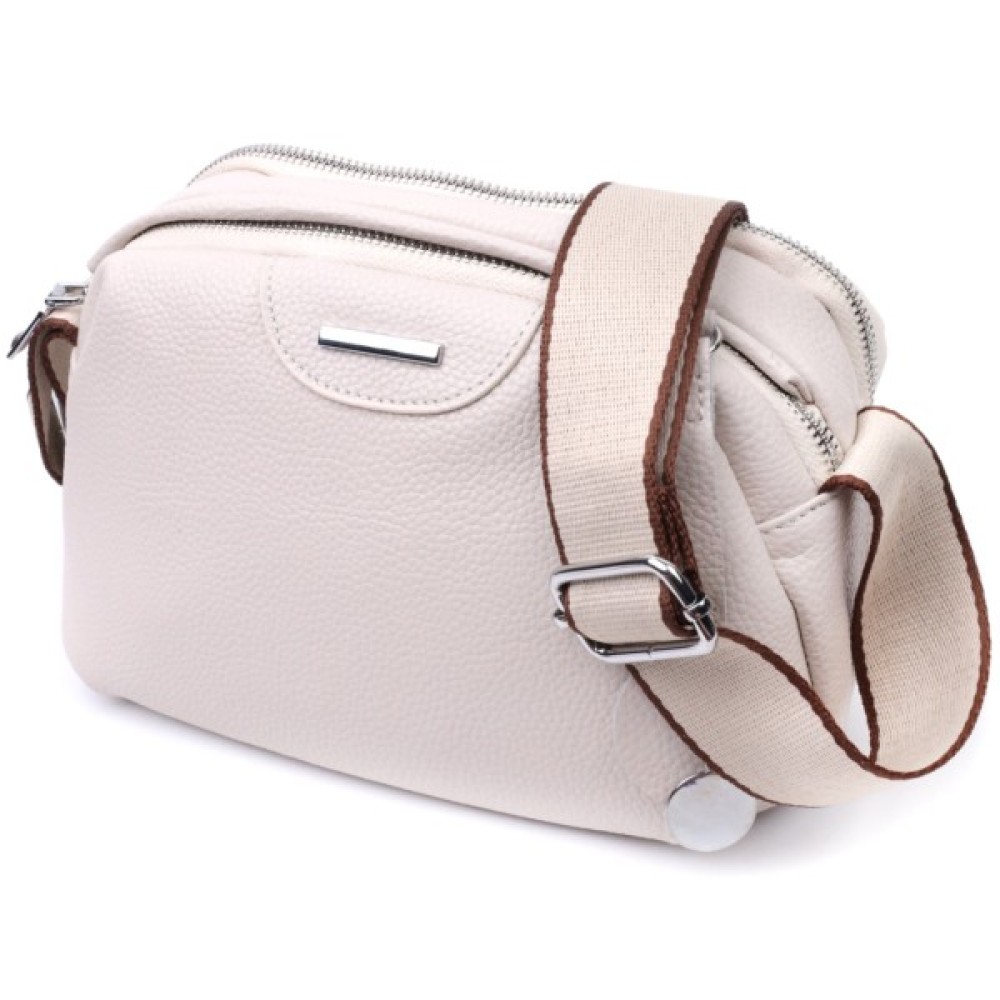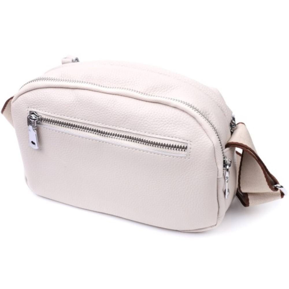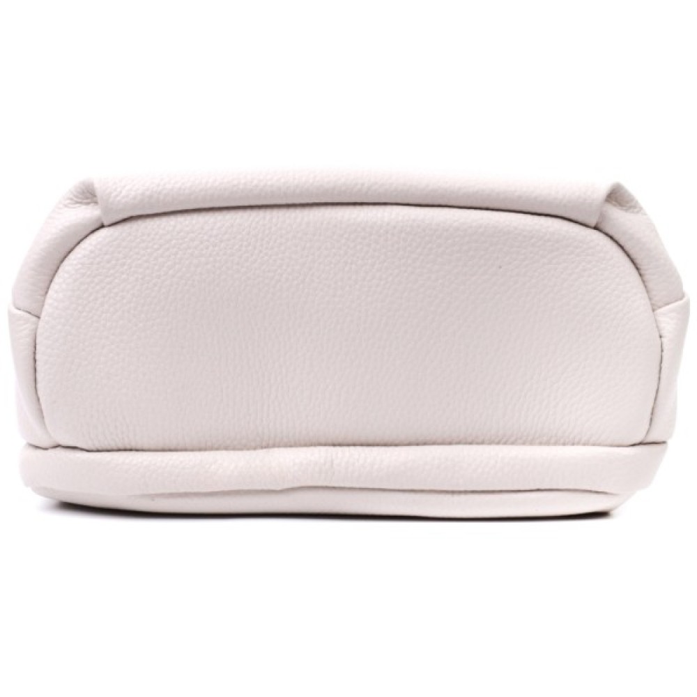 Елегантна сумка для жінок із натуральної шкіри флотар, яка має зернисту фактуру. У виробі використано шкіру білого кольору. Аксесуар складається з двох відділень, які закриваються на блискавці, потайної кишені на блискавці та кишені відкритого типу, а також кишені зовні на тильній стороні. Виріб має тверде дно, що дозволяє зберігати форму. Носити сумку можна в руці, під рукою, на плечі і через плече, для цього є текстильний ремінь, що не знімається. В аксесуарі використано якісну фурнітуру кольору срібла. Відмінний варіант для подарунка близьким та дорогим дівчатам та жінкам.