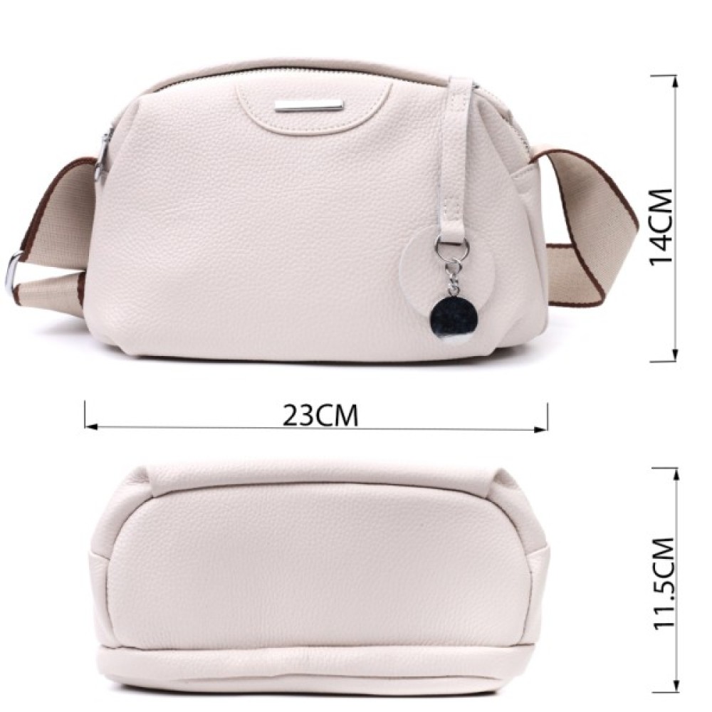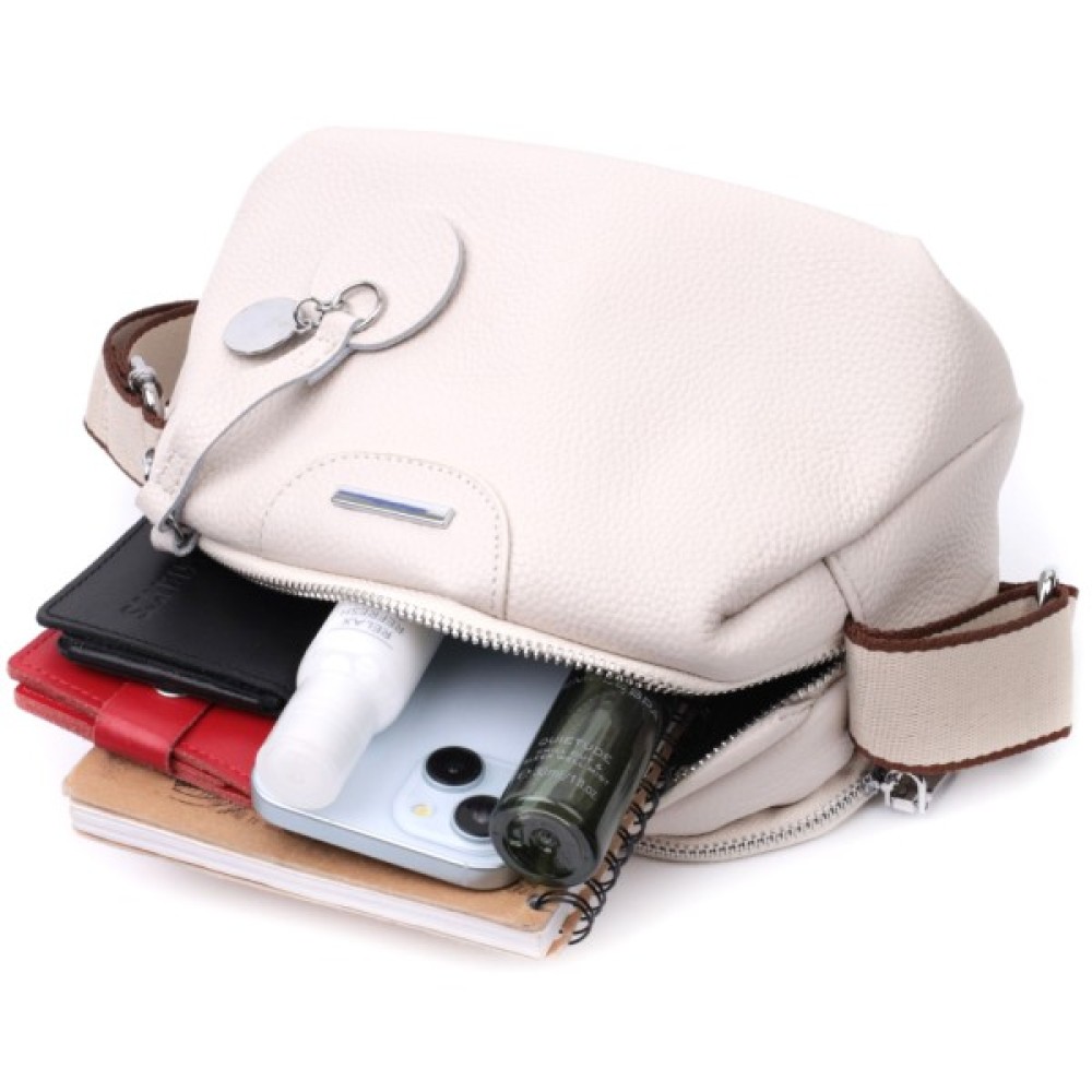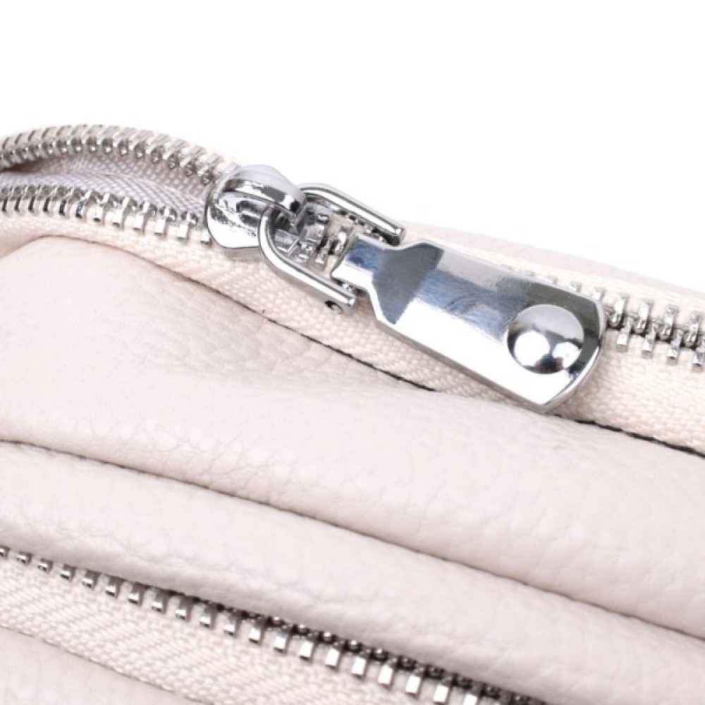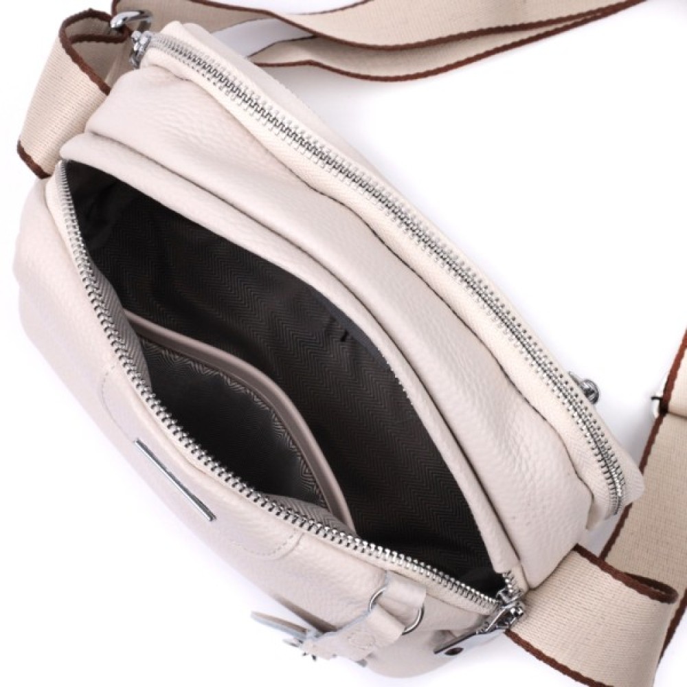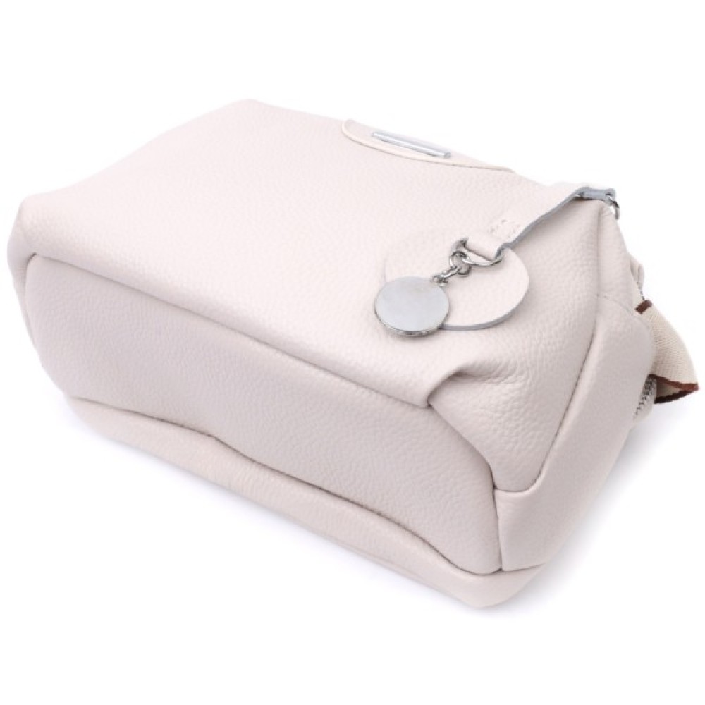 Елегантна сумка для жінок із натуральної шкіри флотар, яка має зернисту фактуру. У виробі використано шкіру білого кольору. Аксесуар складається з двох відділень, які закриваються на блискавці, потайної кишені на блискавці та кишені відкритого типу, а також кишені зовні на тильній стороні. Виріб має тверде дно, що дозволяє зберігати форму. Носити сумку можна в руці, під рукою, на плечі і через плече, для цього є текстильний ремінь, що не знімається. В аксесуарі використано якісну фурнітуру кольору срібла. Відмінний варіант для подарунка близьким та дорогим дівчатам та жінкам.