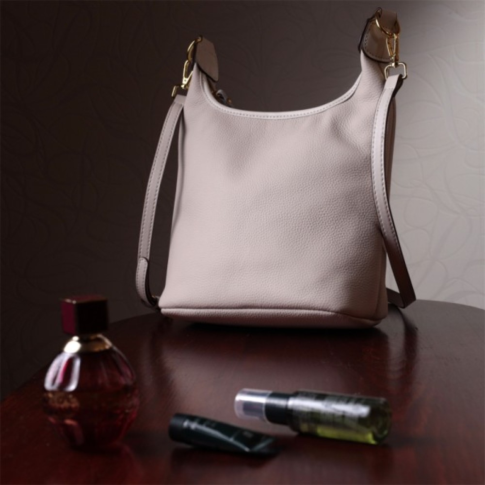 Жіноча сумка середнього розміру із натуральної якісної шкіри. Аксесуар складається з основного відділення, яке закривається на блискавку, потайної кишені на блискавці та кишені відкритого типу всередині, а також кишені на блискавці зовні на тильній стороні. Носити сумку можна в руці і на плечі, для цього є шкіряний ремінь, що знімається. В аксесуарі використано якісну фурнітуру кольору золота.