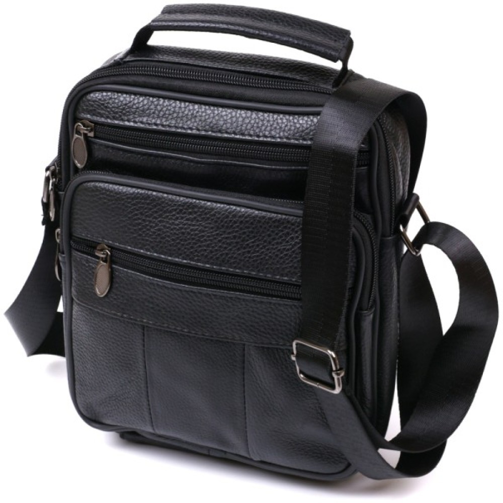 Невеликий чоловічий месенджер із високоякісної натуральної шкіри, яка стійка до різних пошкоджень та зносу. Має два місткі відділення та чотири додаткові кишені для різних аксесуарів. Ремінь виконаний із міцного текстилю та регулюється по довжині. Колір виробу - універсальний чорний, що дуже практично і зручно.