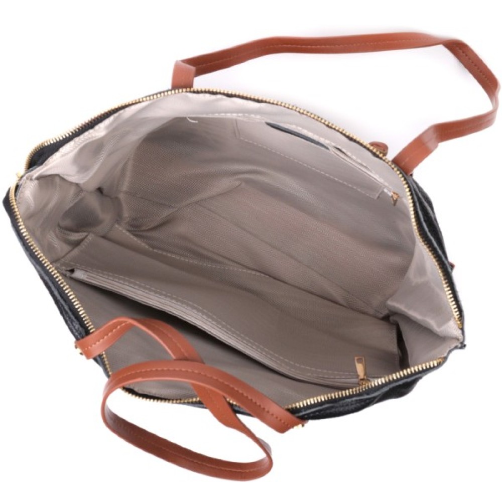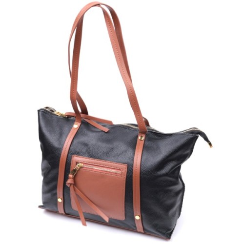 Жіноча велика сумка з натуральної шкіри флотар у поєднанні чорного та коричневого кольорів. Шкіра флотар невибаглива у догляді та довговічна у носінні. Аксесуар має два містких відділення та три кишені на блискавках різного розміру, що дозволяє зручно організувати простір. Сумку можна носити як у руках, так і на плечі, завдяки подовженим ручкам. Дно захищене металевими ніжками, що запобігає пошкодженням. У виробі використано фурнітуру кольору жовтого золота, що надає йому елегантного вигляду.