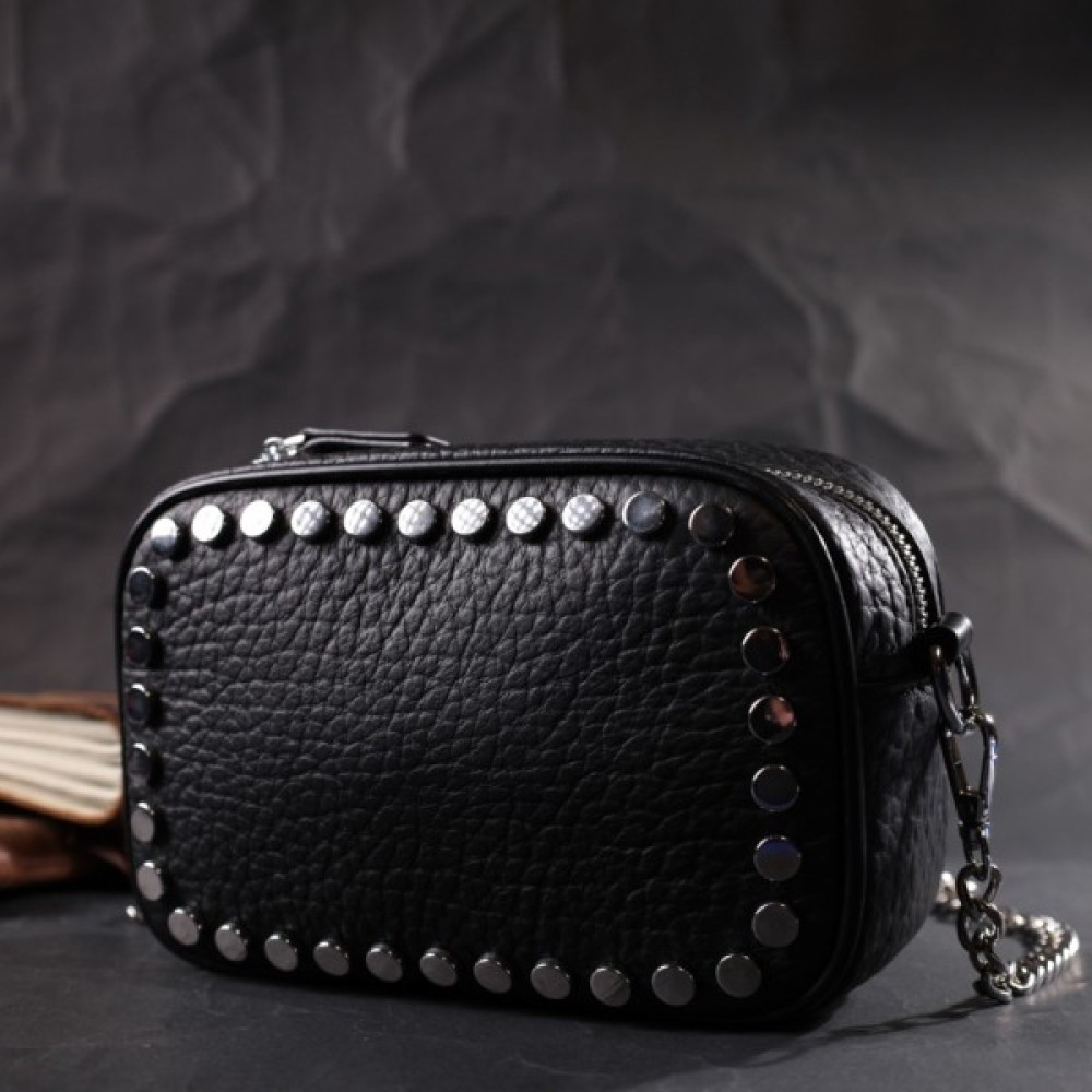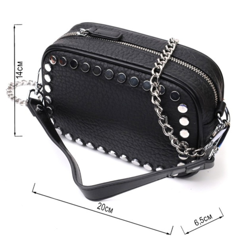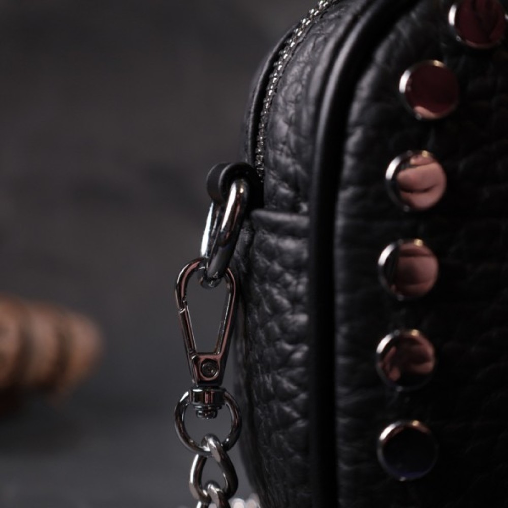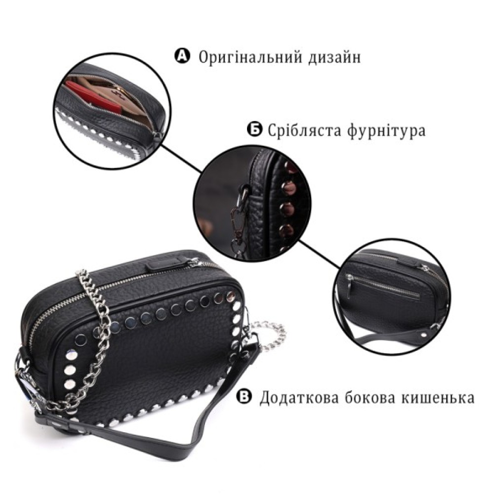 Стильна жіноча сумка з натуральної крупнозернистої шкіри, яка має декор у вигляді кнопок на лицьовій стороні, що надає аксесуару елегантності. Сумка складається з одного основного відділення, потайної кишені на блискавці і кишені відкритого типу всередині, а також кишені на блискавці зовні.