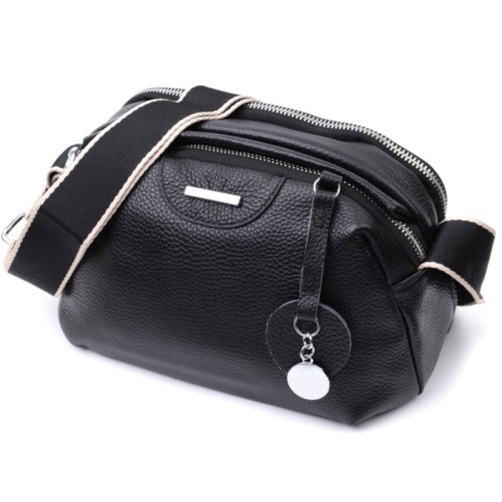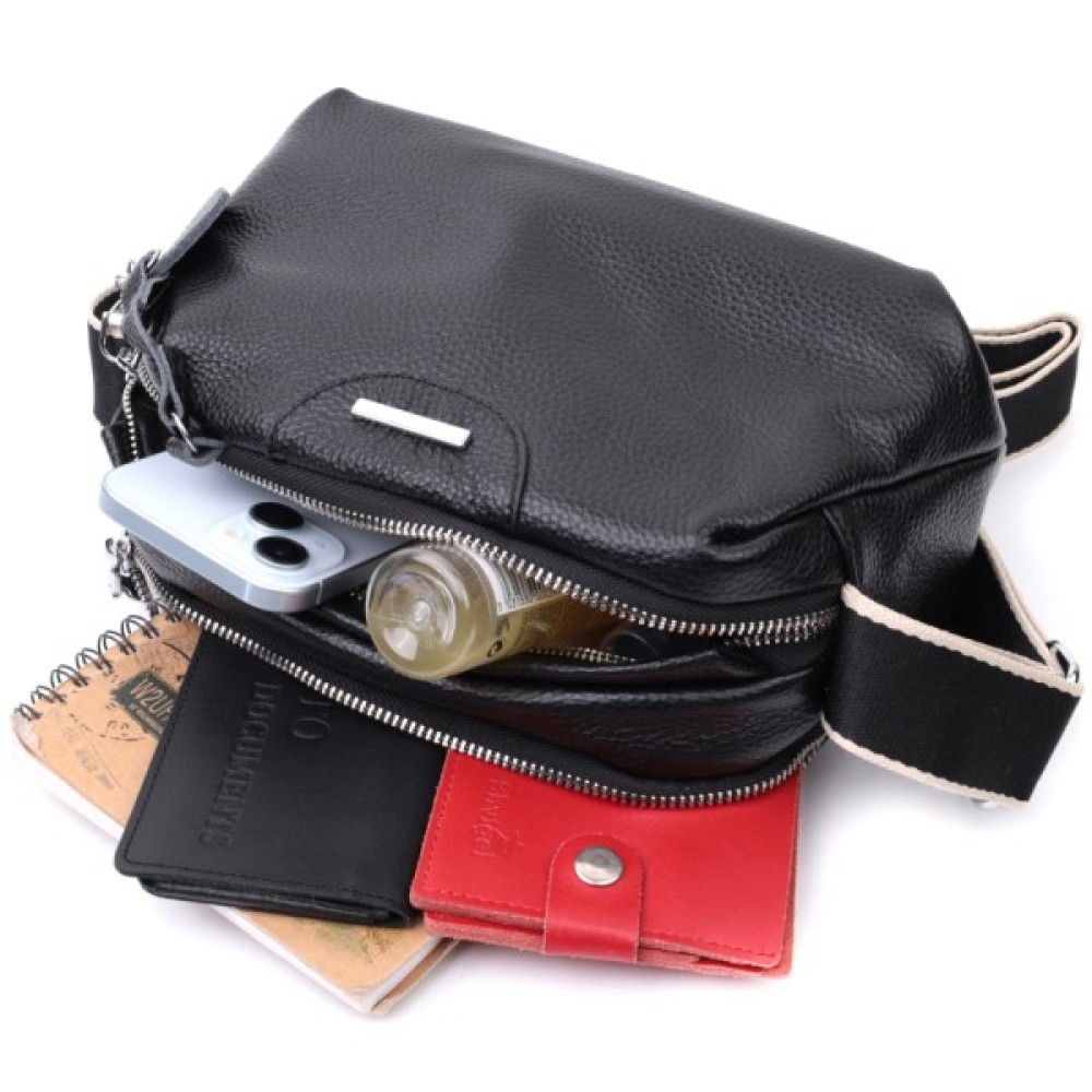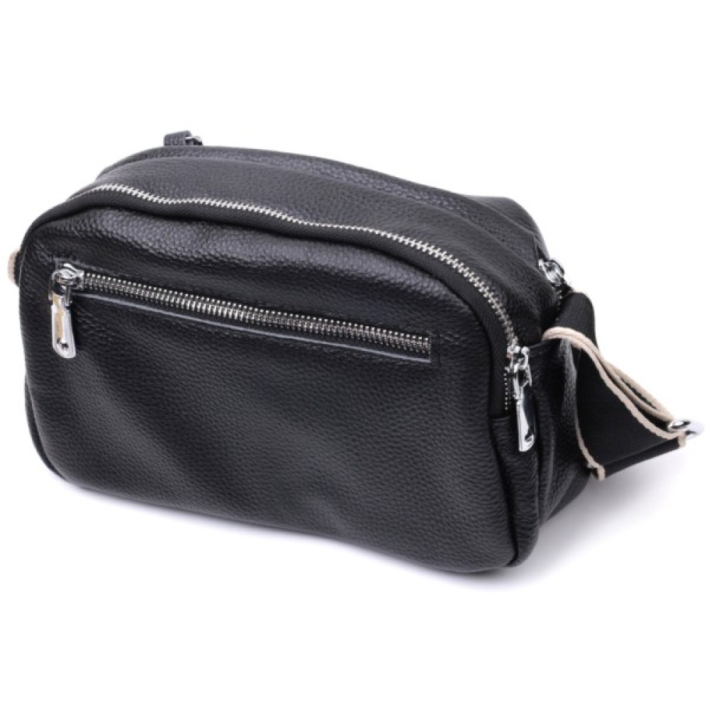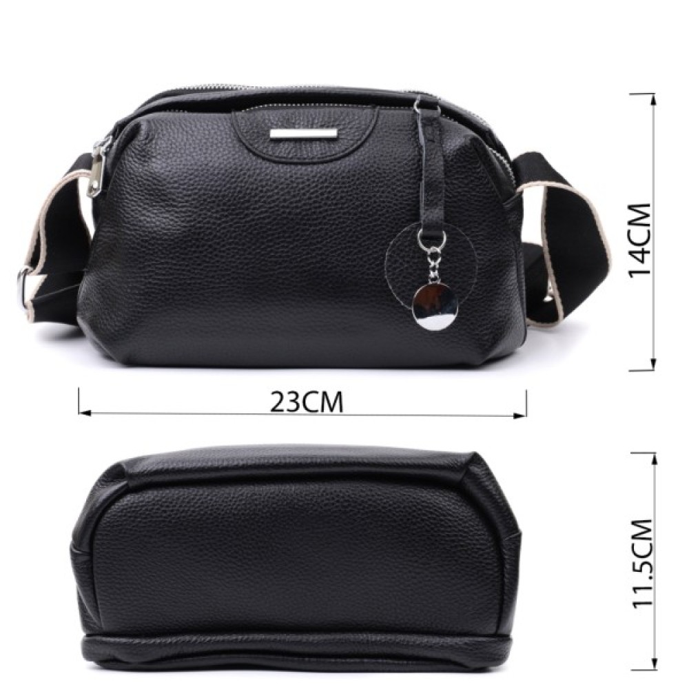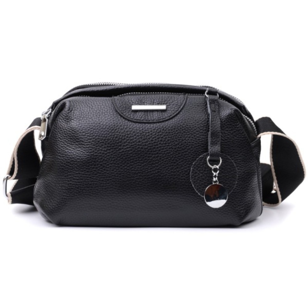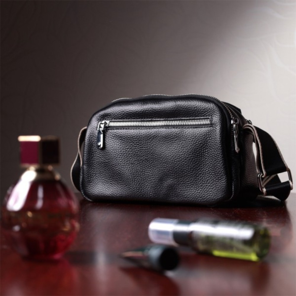 Містка сумка для жінок з натуральної шкіри флотар, яка має зернисту фактуру. У виробі використано шкіру класичного чорного кольору. Аксесуар складається з двох відділень на блискавці, потайної кишені на блискавці та кишені відкритого типу, а також зовнішньої кишені на тильній стороні. Тверде дно дозволяє сумці зберігати форму. Носити сумку можна в руці, під рукою, на плечі і через плече завдяки текстильному ременю, що не знімається. В аксесуарі використано якісну фурнітуру кольору срібла. Відмінний варіант для подарунка близьким та дорогим дівчатам і жінкам.