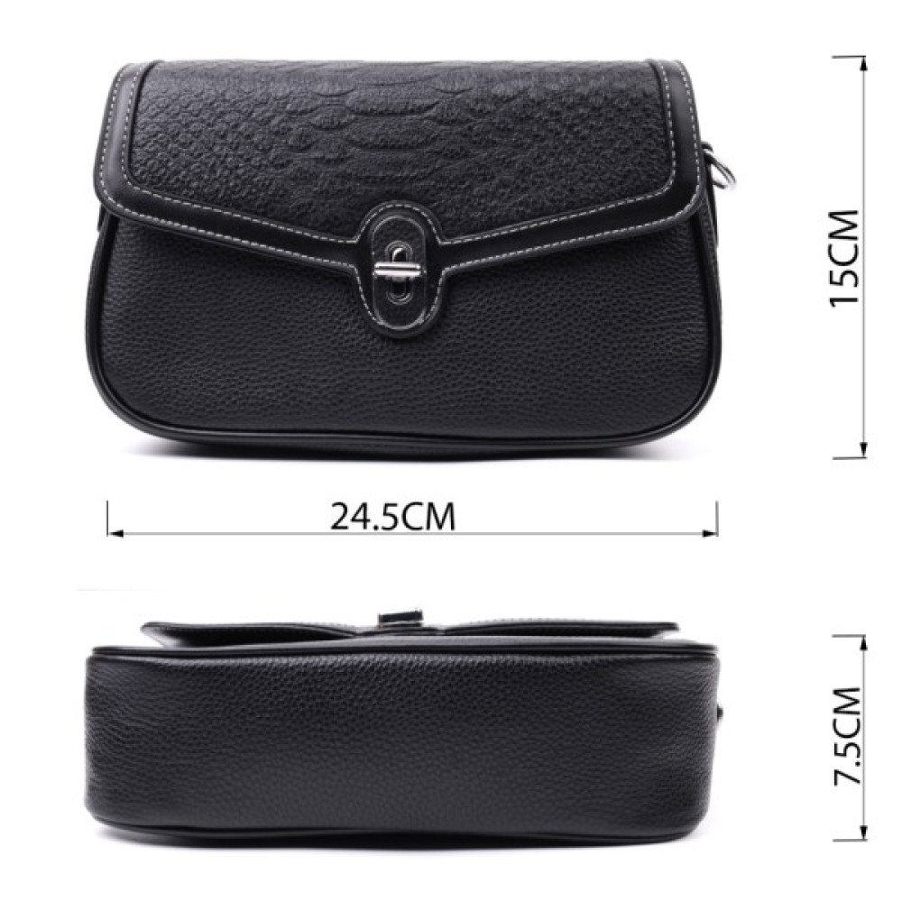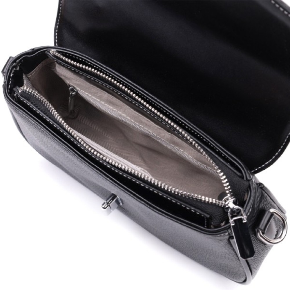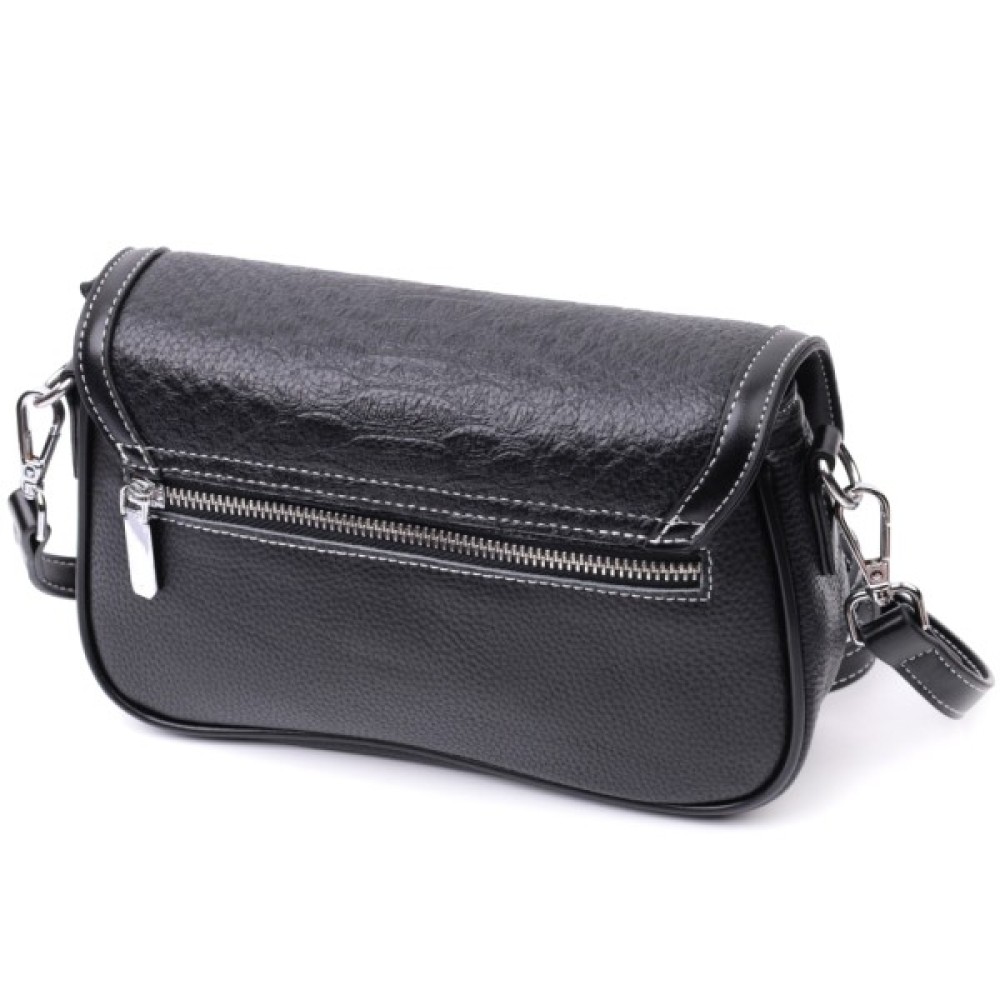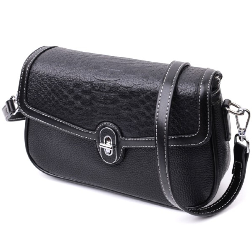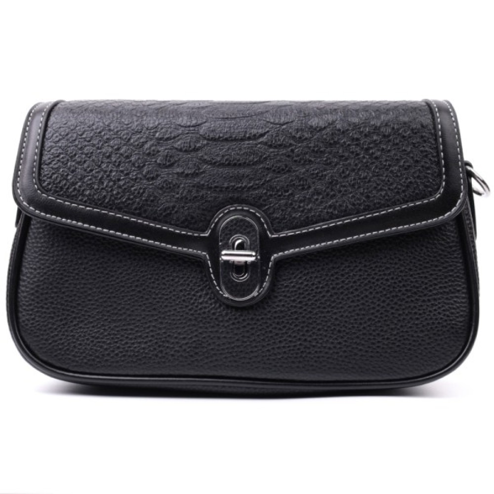 У виробі використано шкіру чорного кольору з білим рядком по краю клапана. Притягує погляд у виробі фактурний клапан із тисненням під змію та витончена механічна клямка.
