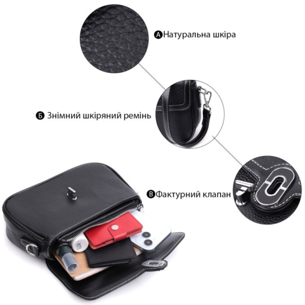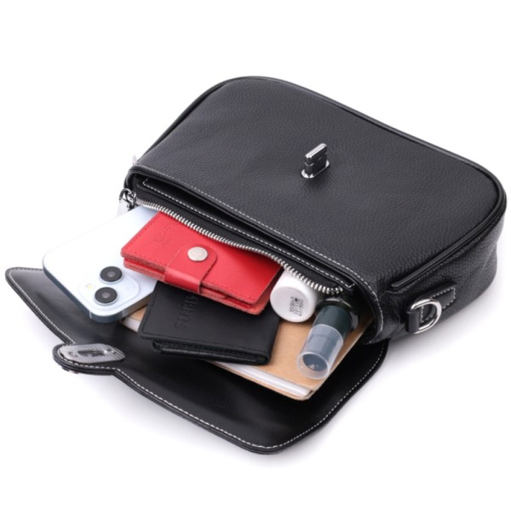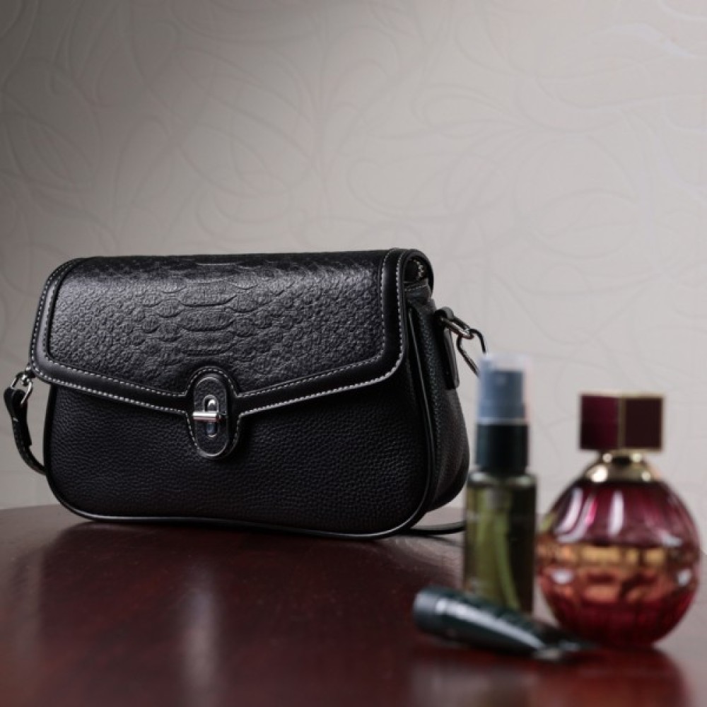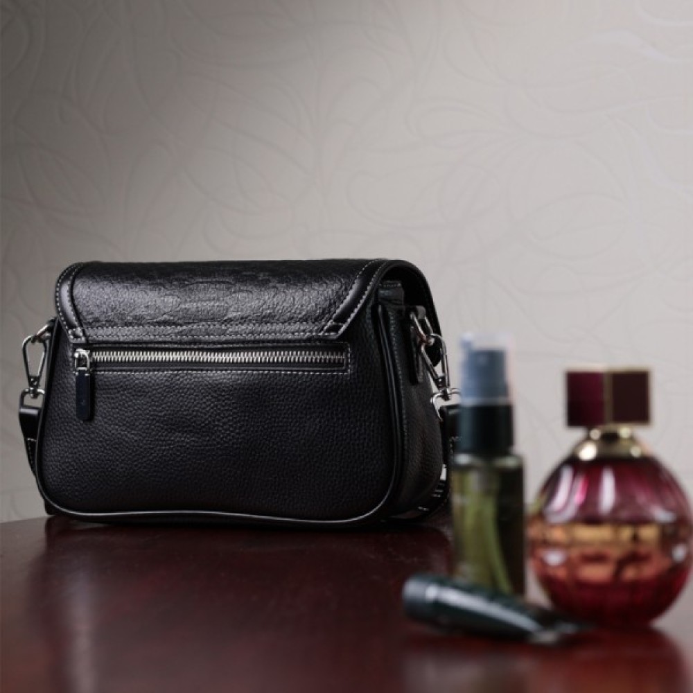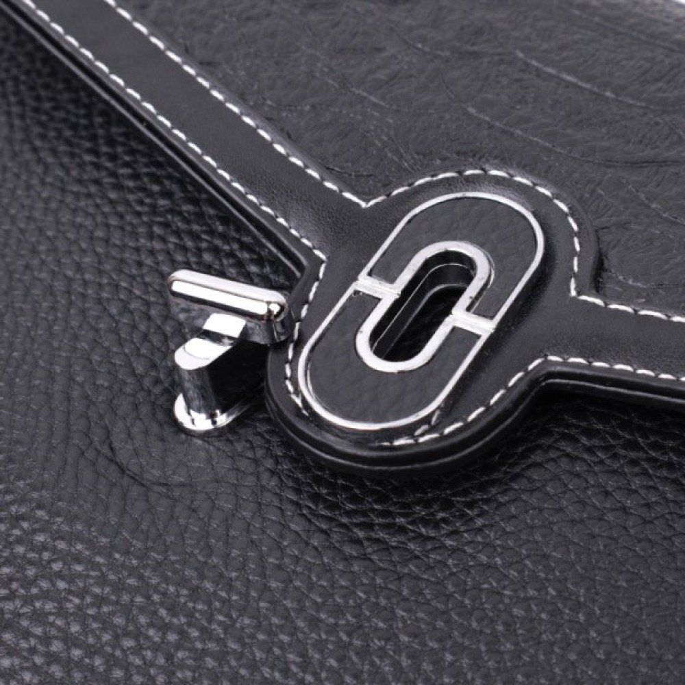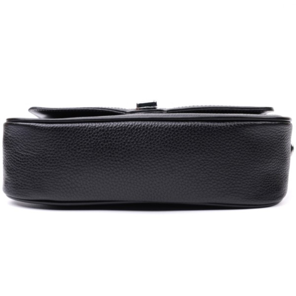 У виробі використано шкіру чорного кольору з білим рядком по краю клапана. Притягує погляд у виробі фактурний клапан із тисненням під змію та витончена механічна клямка.