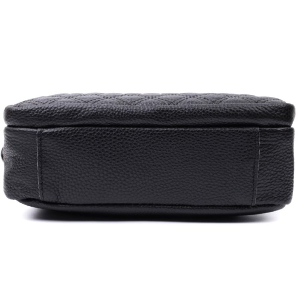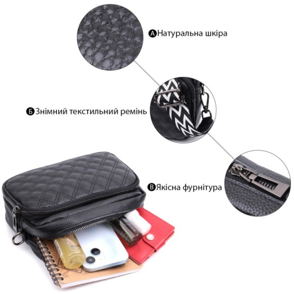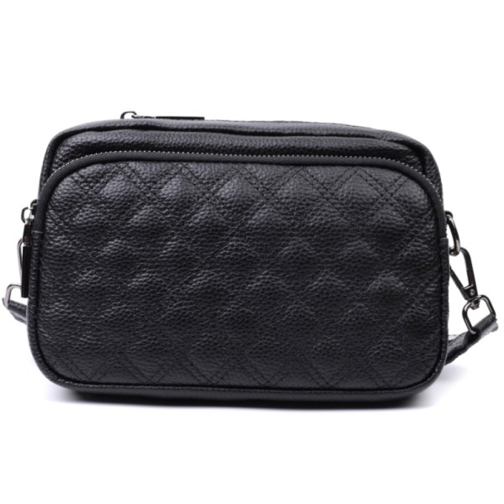 Стильна жіноча сумка з натуральної шкіри у класичному чорному кольорі. Модель декорована трендовим ромбовим прошиттям на лицьовій стороні, що додає їй вишуканого вигляду.