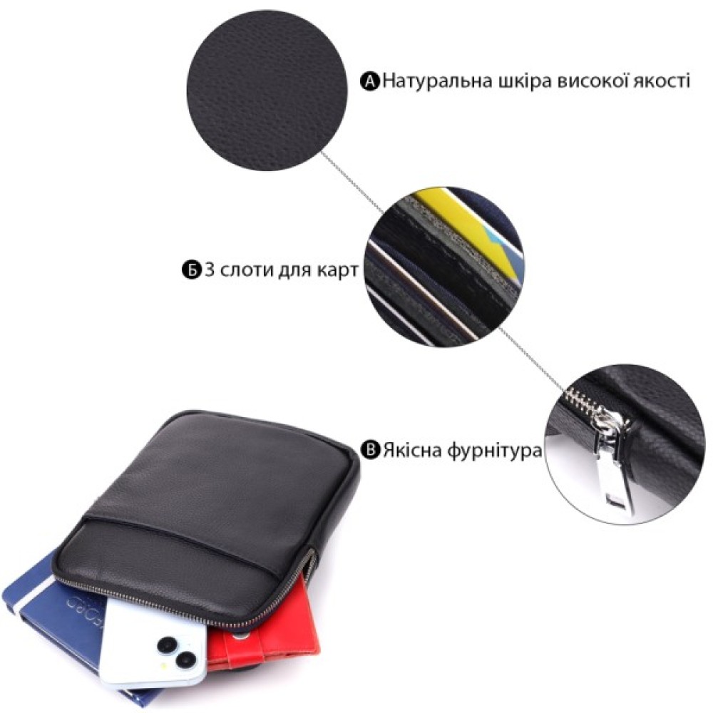 Особливості текстильний регульований незнімний ремінець на праве або ліве плече; кишеня відкритого типу на лицьовій стороні