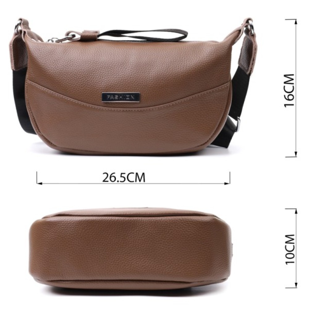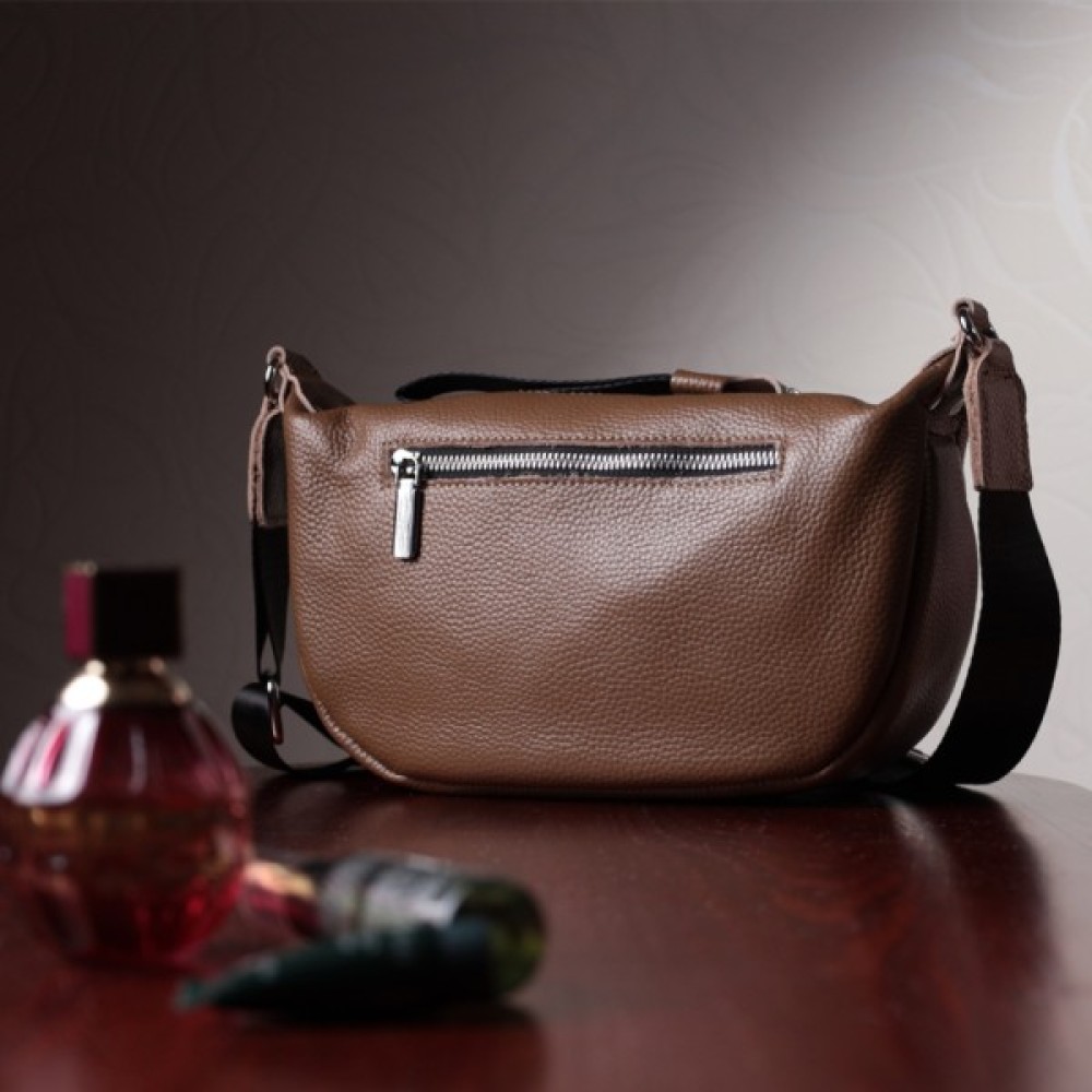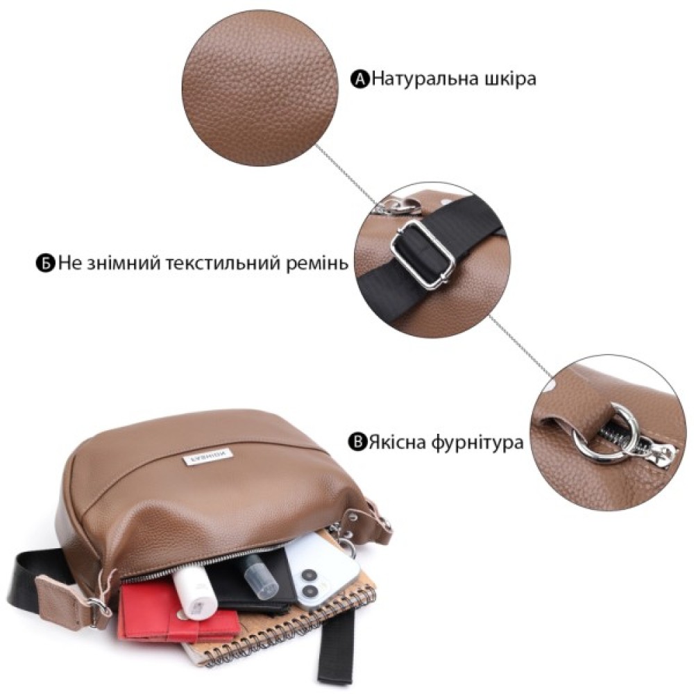 Модна сумка жіноча на плече з натуральної шкіри, яка дуже добре носиться і не втрачає свій первісний вигляд з часом. Аксесуар складається з основного відділення, потайної кишені на блискавці та кишені відкритого типу, а також кишені на блискавці зовні.