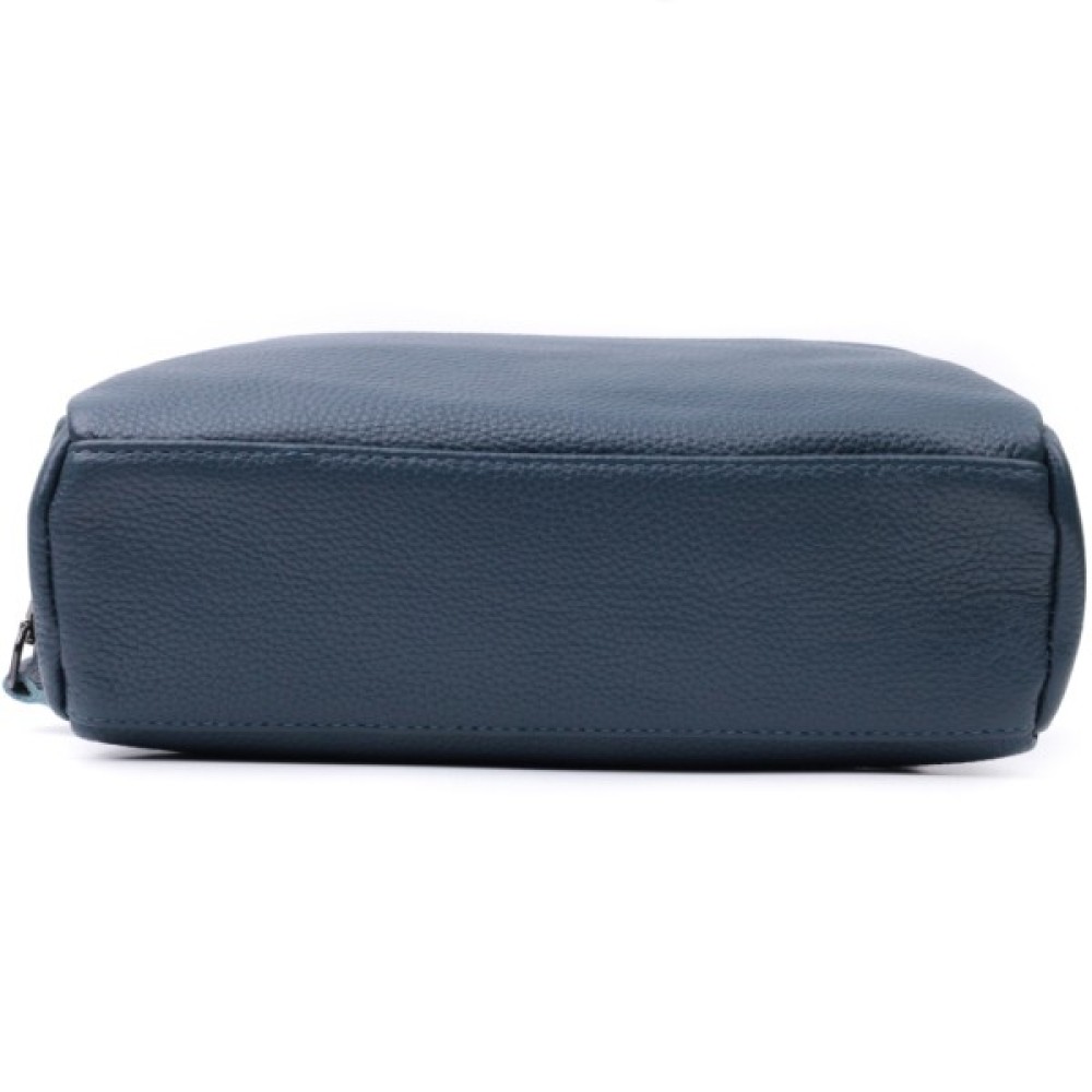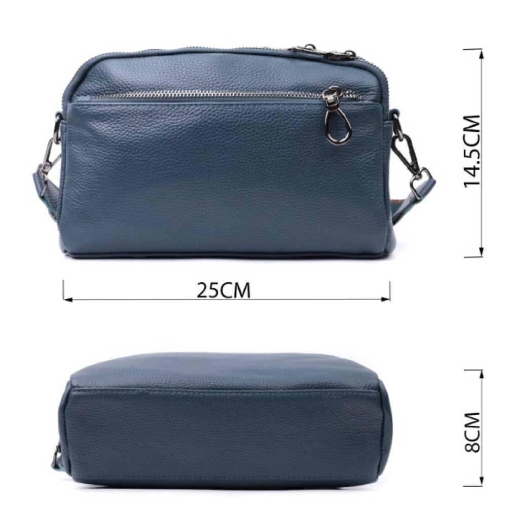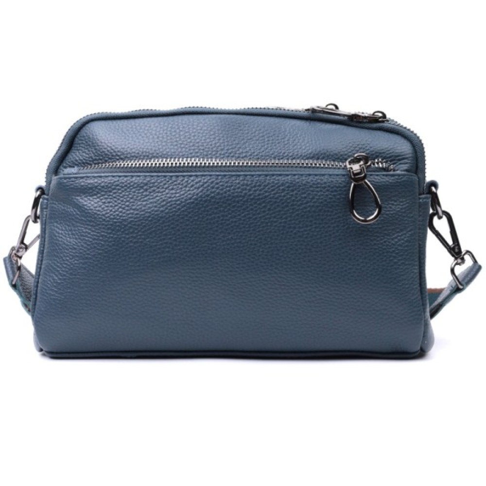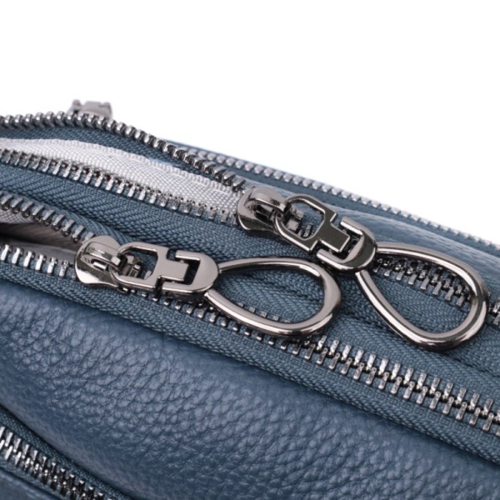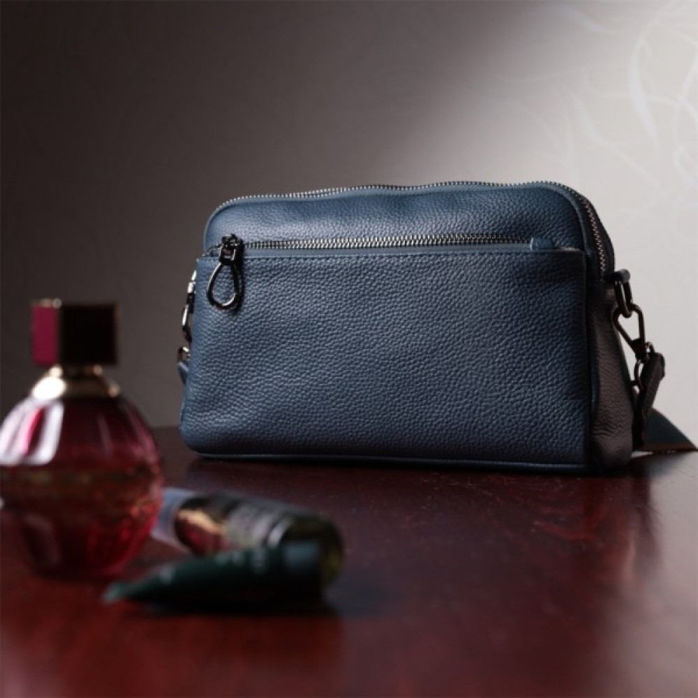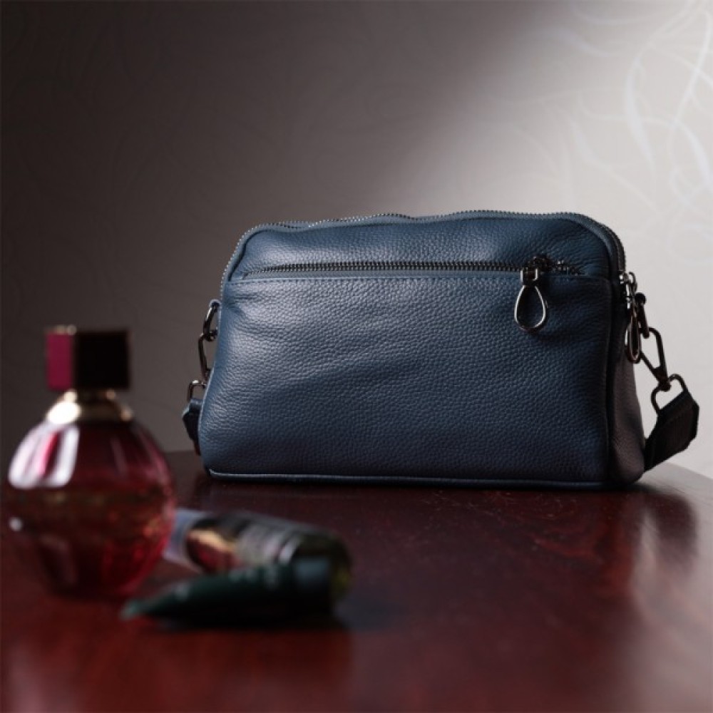 Практична жіноча сумка на всі випадки із натуральної шкіри флотар, яка має зернисту фактуру. У виробі використано шкіру синього кольору. Аксесуар складається з двох відділень, які закриваються на блискавці, потайної кишені на блискавці та кишені відкритого типу, а також двох кишень зовні на лицьовій та тильній стороні. Носити сумку можна в руці, під рукою, на плечі і через плече, для цього є текстильний ремінь, що знімається. В аксесуарі використано якісну фурнітуру кольору темного срібла. Відмінний варіант для подарунка близьким та дорогим дівчатам та жінкам.