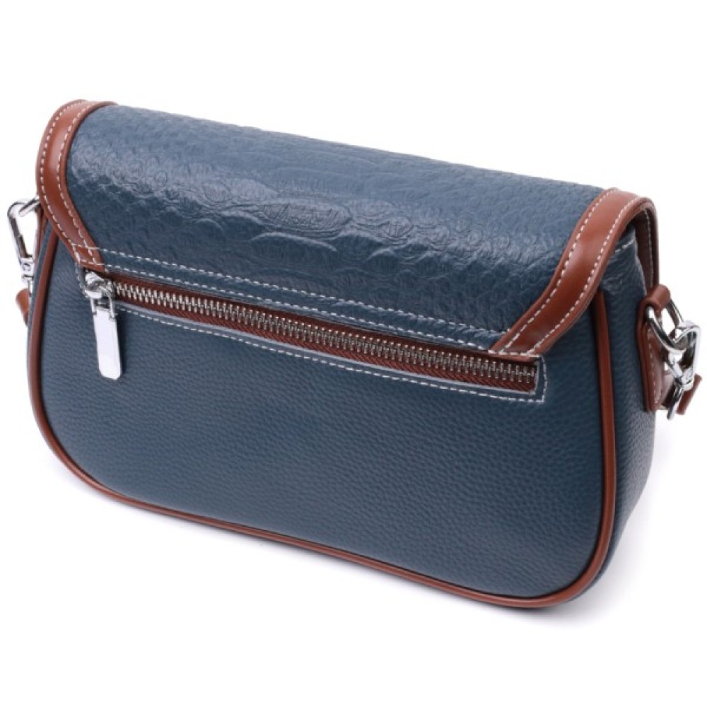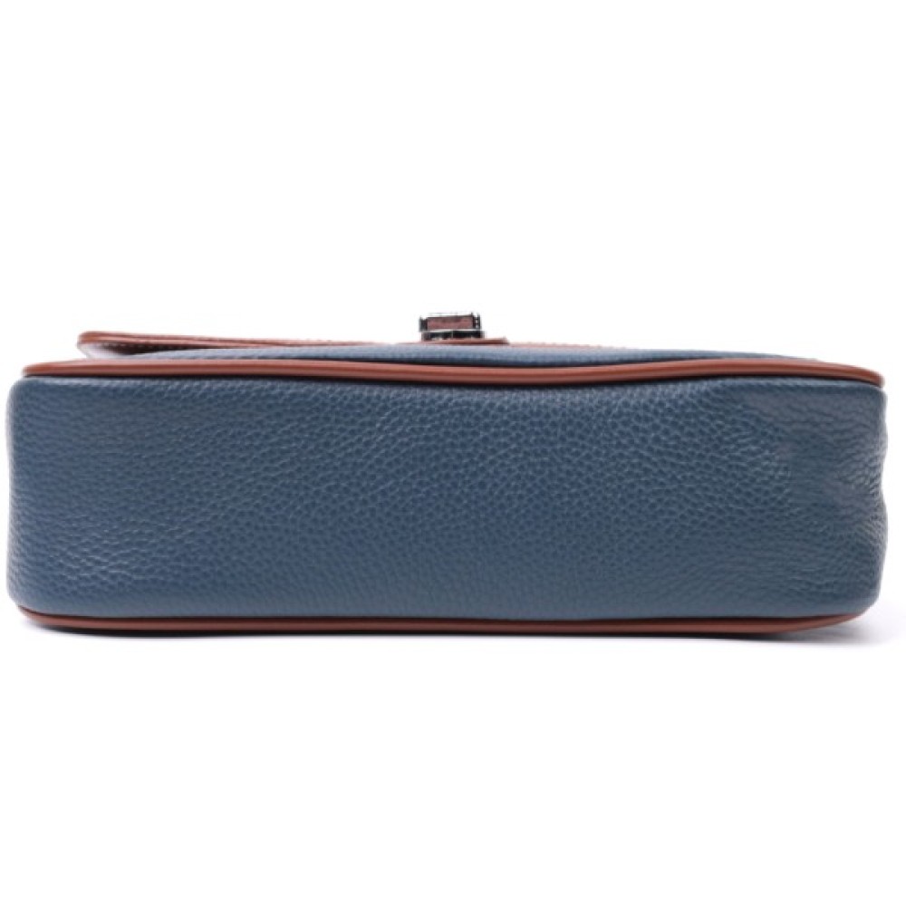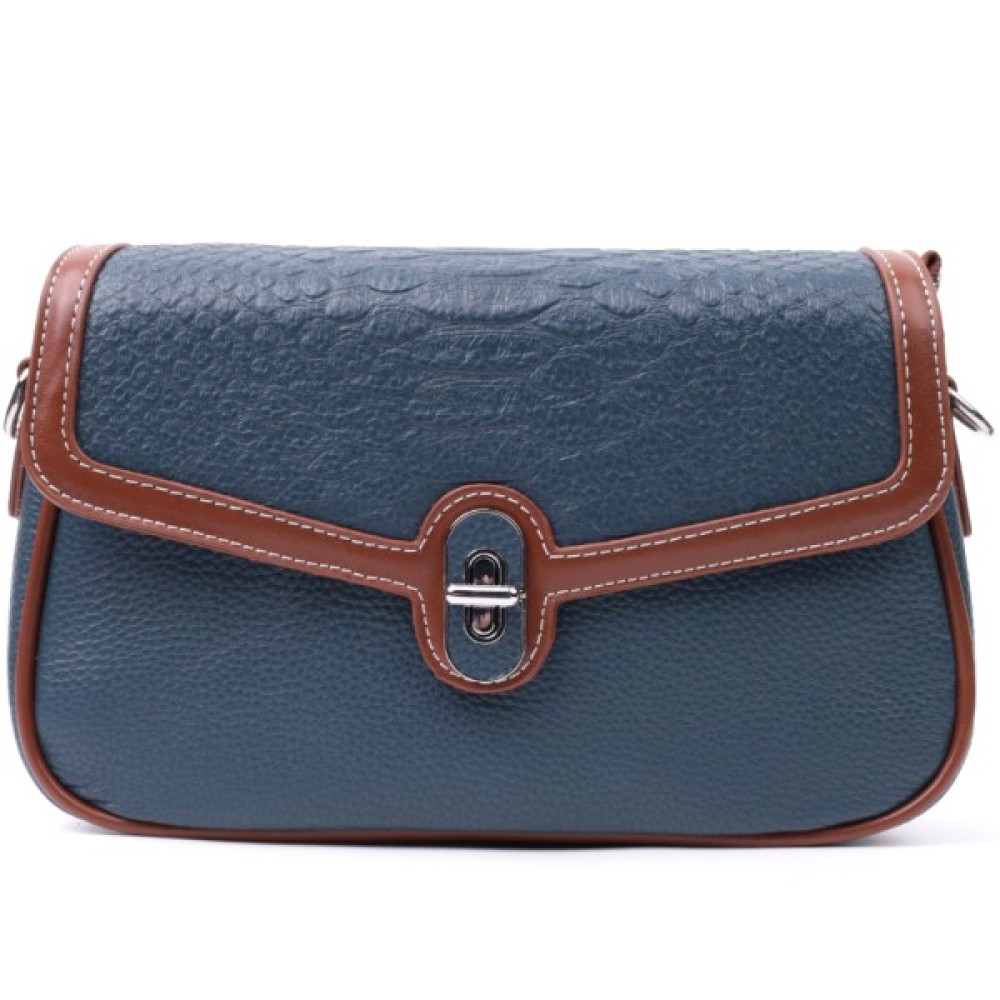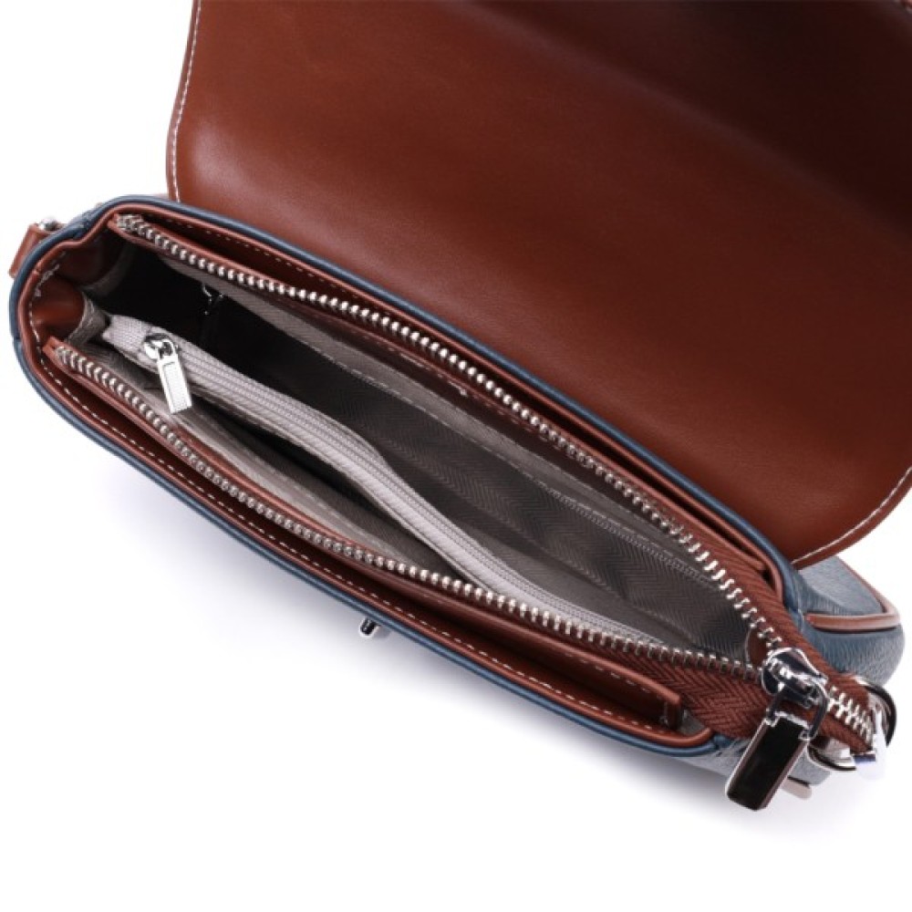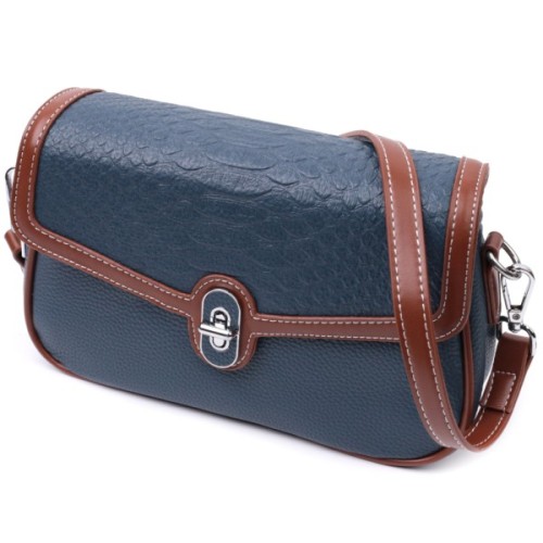 Практична каркасна жіноча сумка з натуральної шкіри. У виробі використано шкіру синього та коричневого кольору. Притягує погляд фактурний клапан із тисненням під змію та витончена механічна клямка.