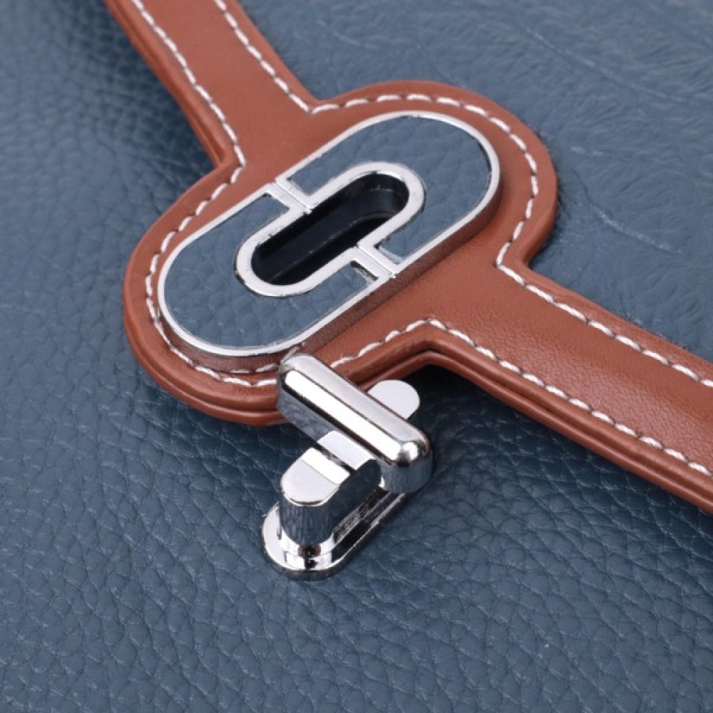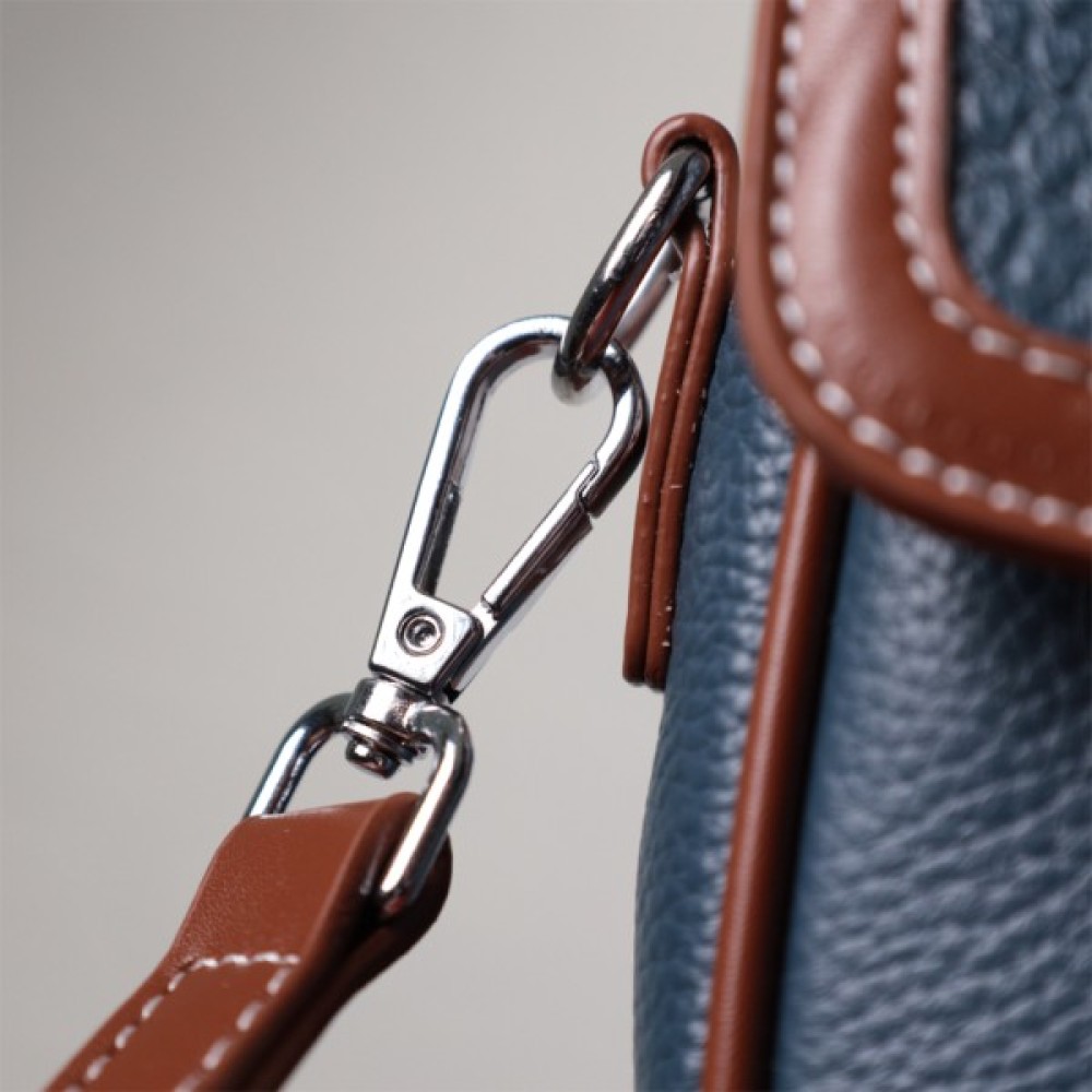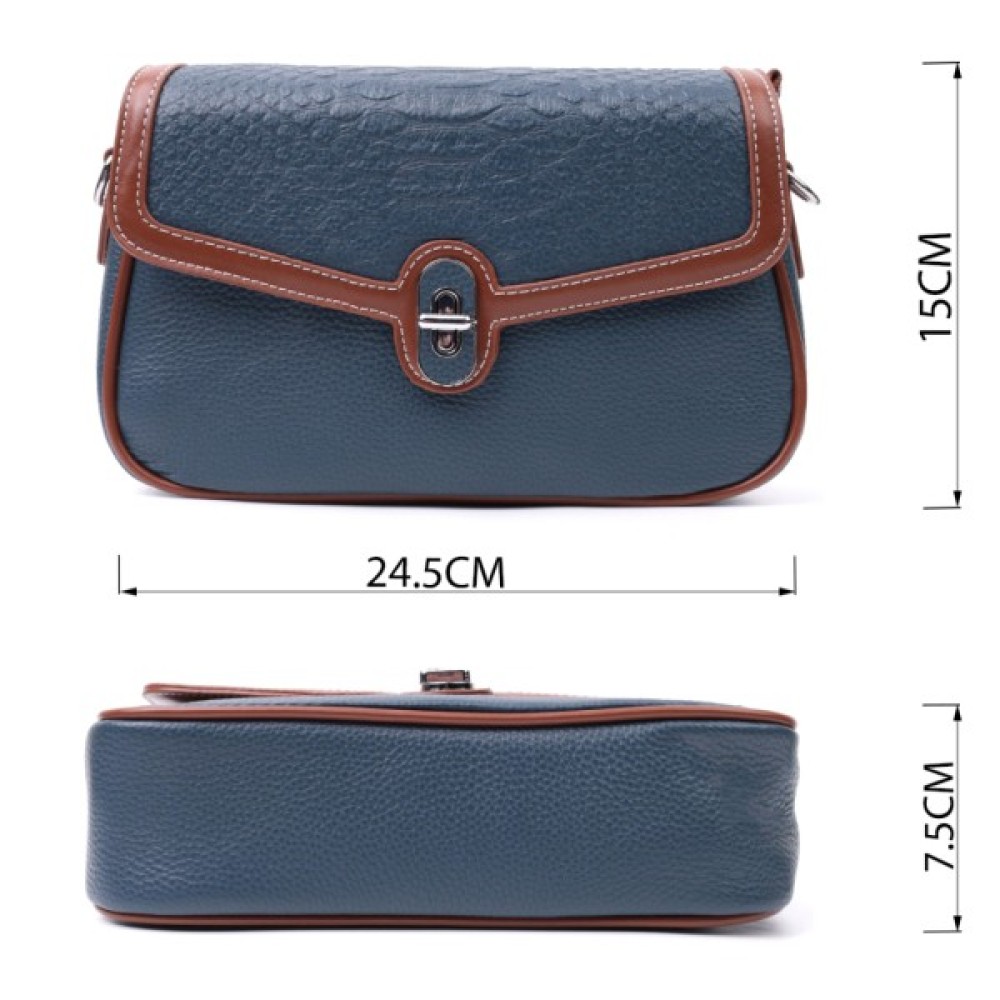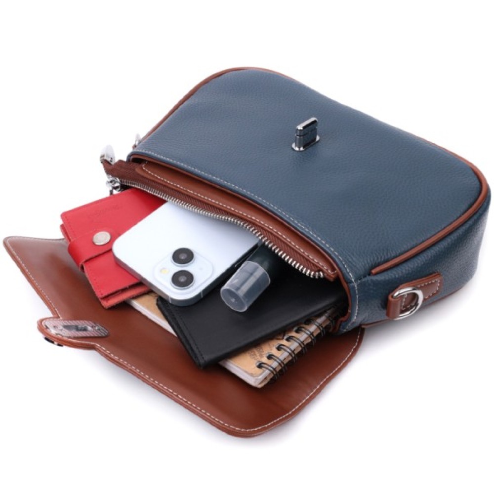 Практична каркасна жіноча сумка з натуральної шкіри. У виробі використано шкіру синього та коричневого кольору. Притягує погляд фактурний клапан із тисненням під змію та витончена механічна клямка.