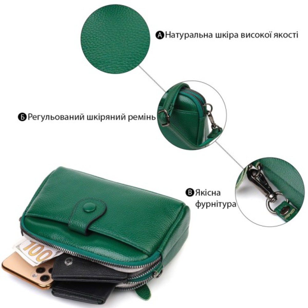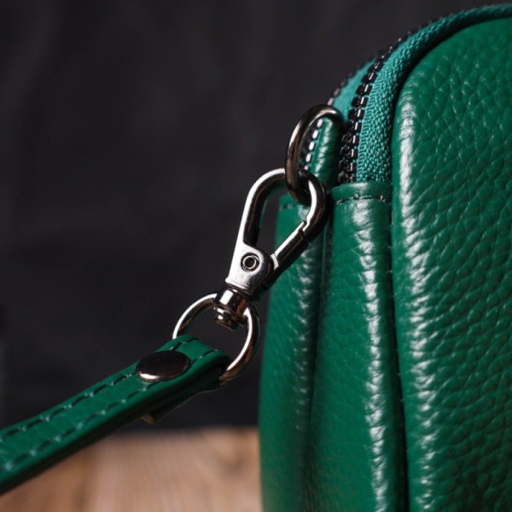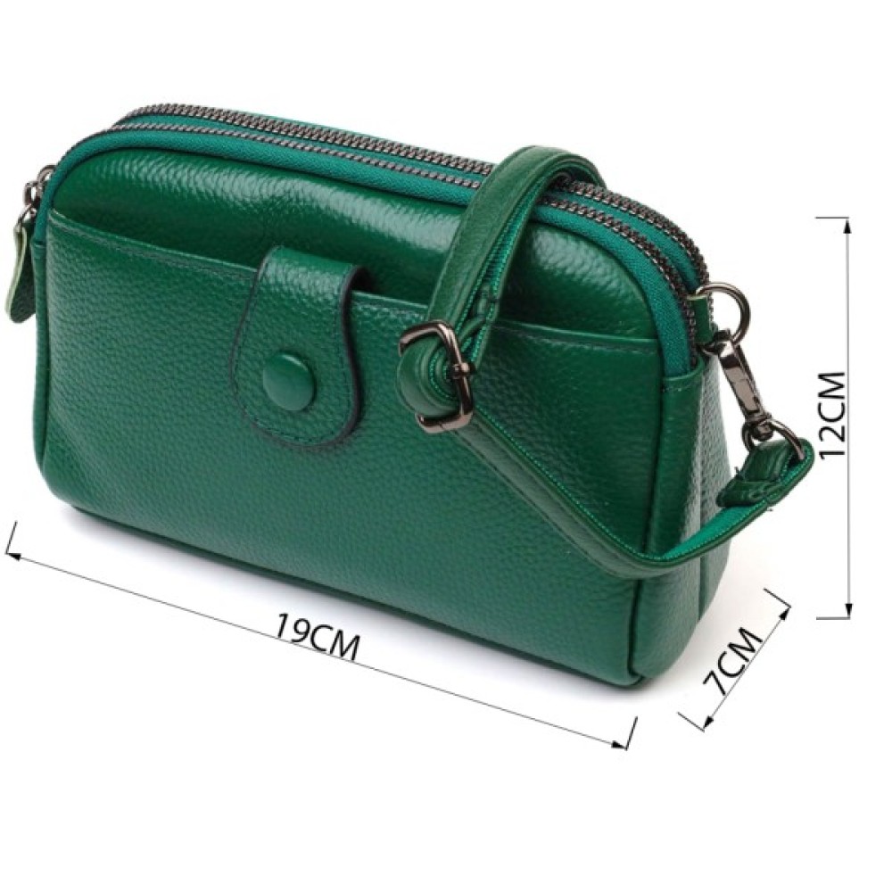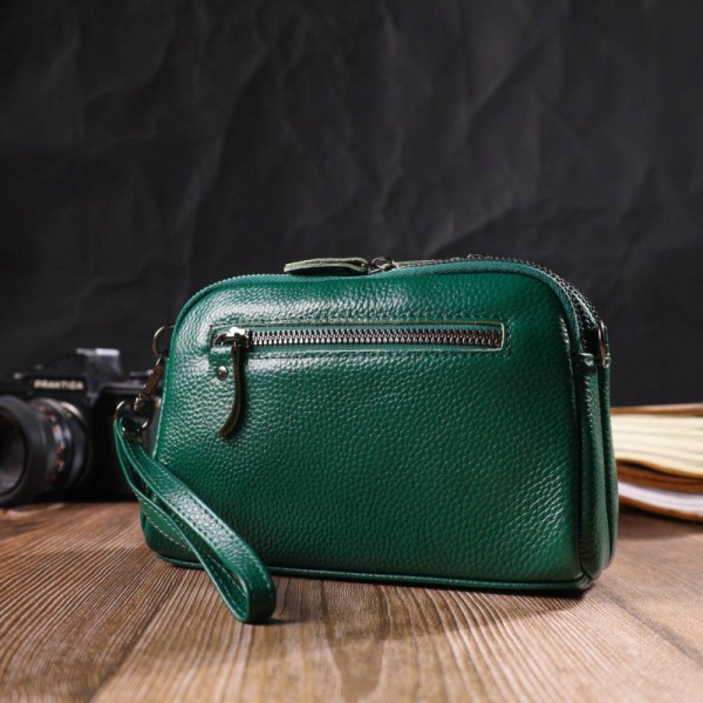 Чудова невелика сумка-клатч із натуральної м'якої шкіри високої якості. Виріб дуже зручний — можна носити на плечі, через плече, під рукою та на кисті. Модель доповнена фурнітурою кольору темного срібла. Аксесуар має два основні відділення на блискавках, в яких дві кишеньки — на блискавці та одна відкритого типу, також зовні знаходяться дві кишені. У комплекті до сумки йде знімний плечовий ремінь та знімний кистьовий ремінь. Модель закривається на блискавку.