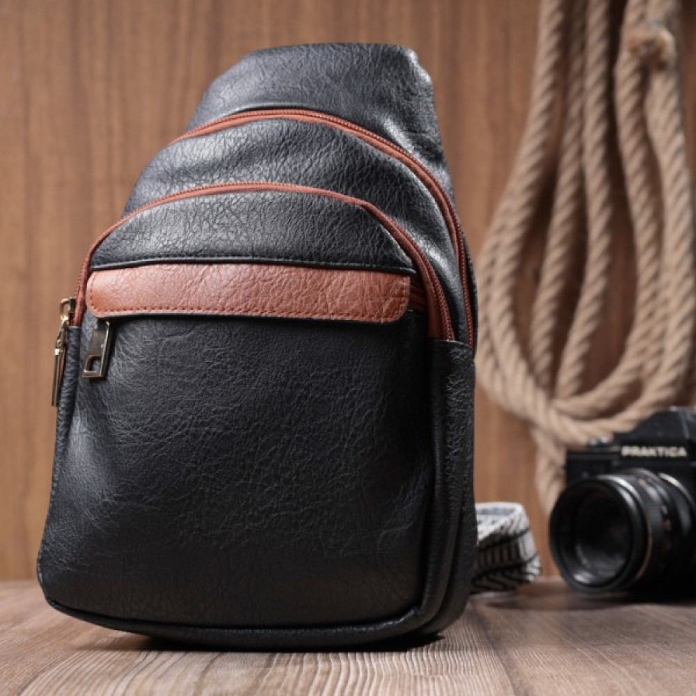 Оригінальний варіант сумки для жінок на кожен день з якісної екошкіри, яка є альтернативою натуральній шкірі. Дана модель складається з одного основного відділення, яке закривається на блискавку і в якому знаходиться кишеня на блискавці і три кишені для кредитних карток усередині, а також трьох кишень зовні та одного отвори для кабелю або навушників, що дуже зручно в сучасному світі. Акцентом даної моделі є зручний регульований плечовий ремінець у етнічному стилі, що дуже модно вже кілька сезонів. Екошкіра - високоякісна альтернатива натуральному матеріалу, яка дуже стійка до тертя, до низьких температур, відмінно носиться на відміну від інших штучних матеріалів, а також має гіпоалергенний склад на відміну від натуральної шкіри. Мода не стоїть на місці, на зміну класичним сумкам приходять нові моделі, які обумовлені сучасним часом, саме такою є слінг сумка - зручна, практична, невелика, але містка і головне якісна.