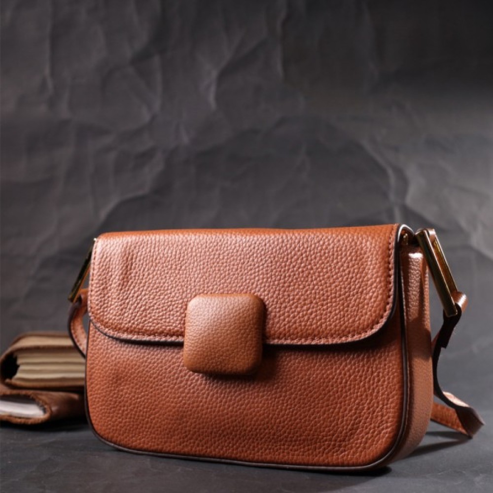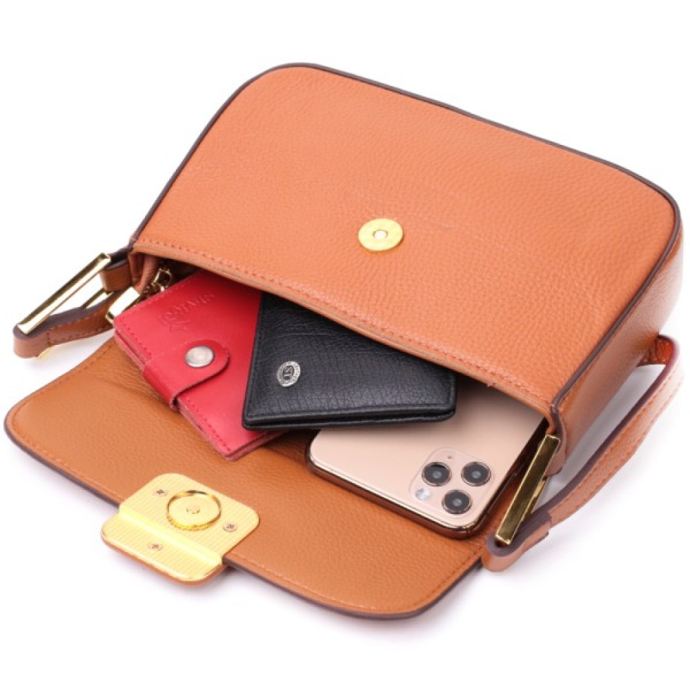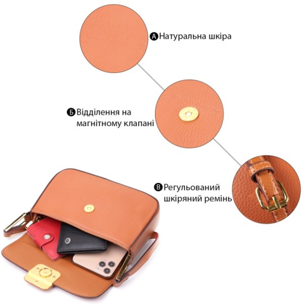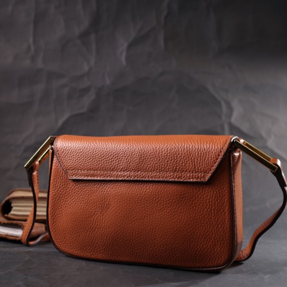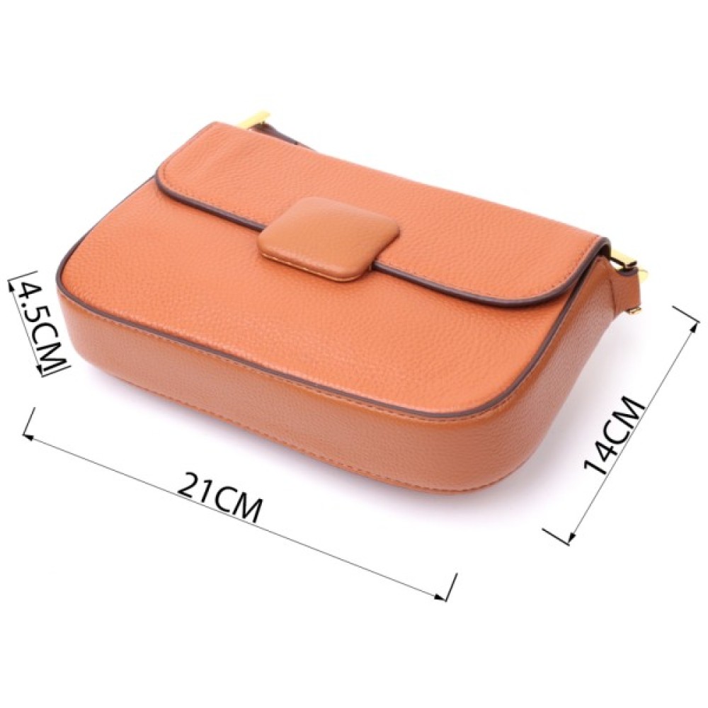 Модна жіноча сумка у стильному теракотовому кольорі з твердим каркасом із натуральної шкіри з високим показником якості та зносостійкості. Аксесуар складається з основного відділення, що закривається на блискавку та клапаном на магніт, усередині якого знаходиться потайна кишеня на блискавці та кишеня відкритого типу. Носити сумку можна на плечі, через плече для цього є незнімний шкіряний ремінь, що регулюється, а також як клатч під рукою. У виробі використано якісну фурнітуру кольору жовтого золота.