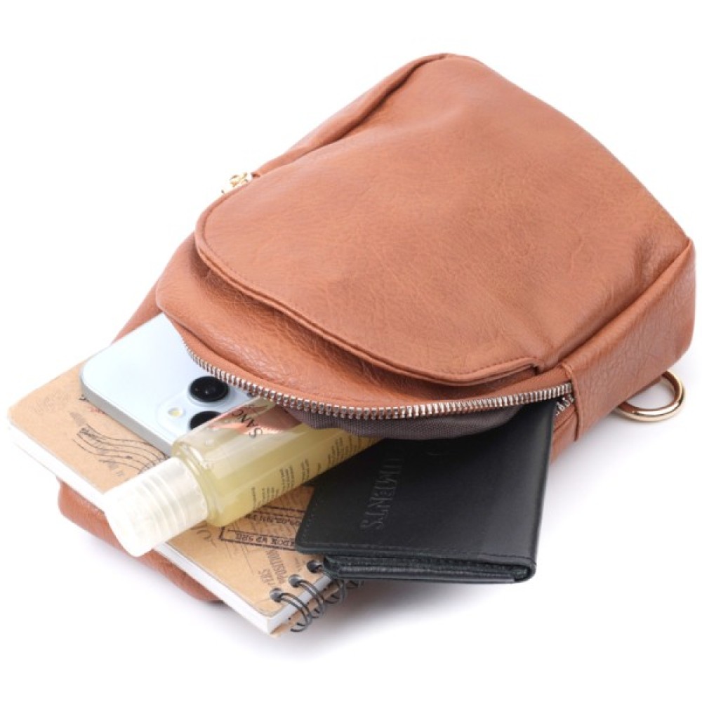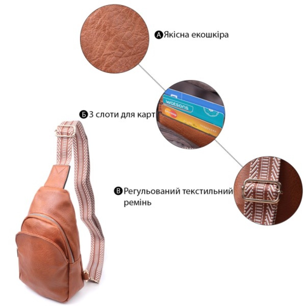 Жіноча сумка через плече із якісної екошкіри в цікавому рудому кольорі. Дана модель складається з одного основного відділення, яке закривається на блискавку і в якому знаходиться потайна кишеня на блискавці і три осередки для кредитних карток усередині, а також однієї кишені зовні, на лицьовій стороні. Акцентом даної моделі є зручний регульований плечовий ремінець у етнічному стилі, що дуже модно вже кілька сезонів. Екошкіра – високоякісна альтернатива натуральному матеріалу, яка дуже стійка до тертя, до низьких температур, відмінно носиться на відміну від інших штучних матеріалів, а також має гіпоалергенний склад на відміну від натуральної шкіри. Практичний варіант сумки, який порадує будь-яку дівчину, тому що всі речі під рукою та в безпеці.