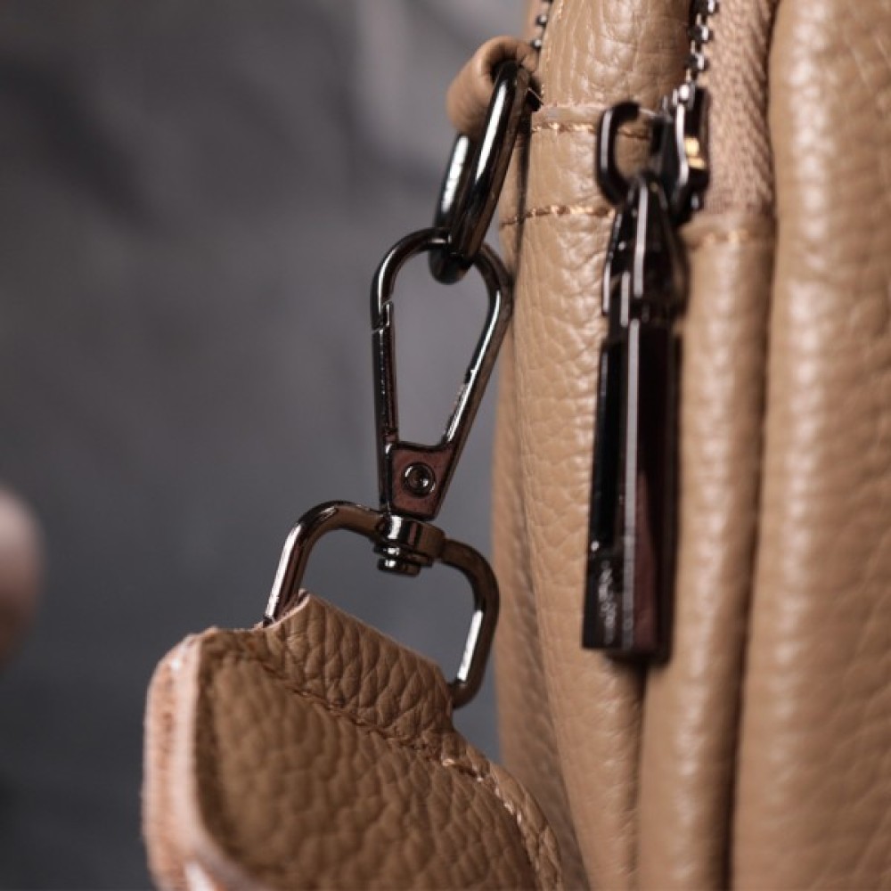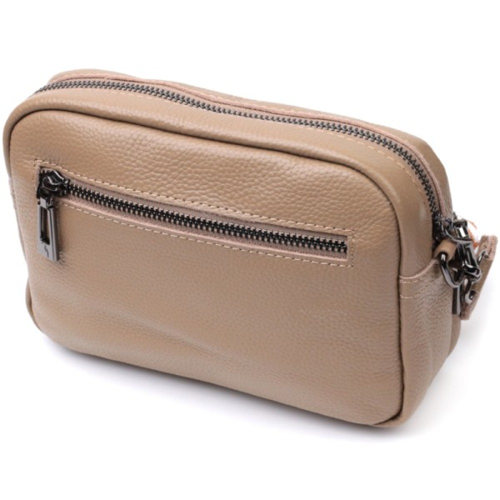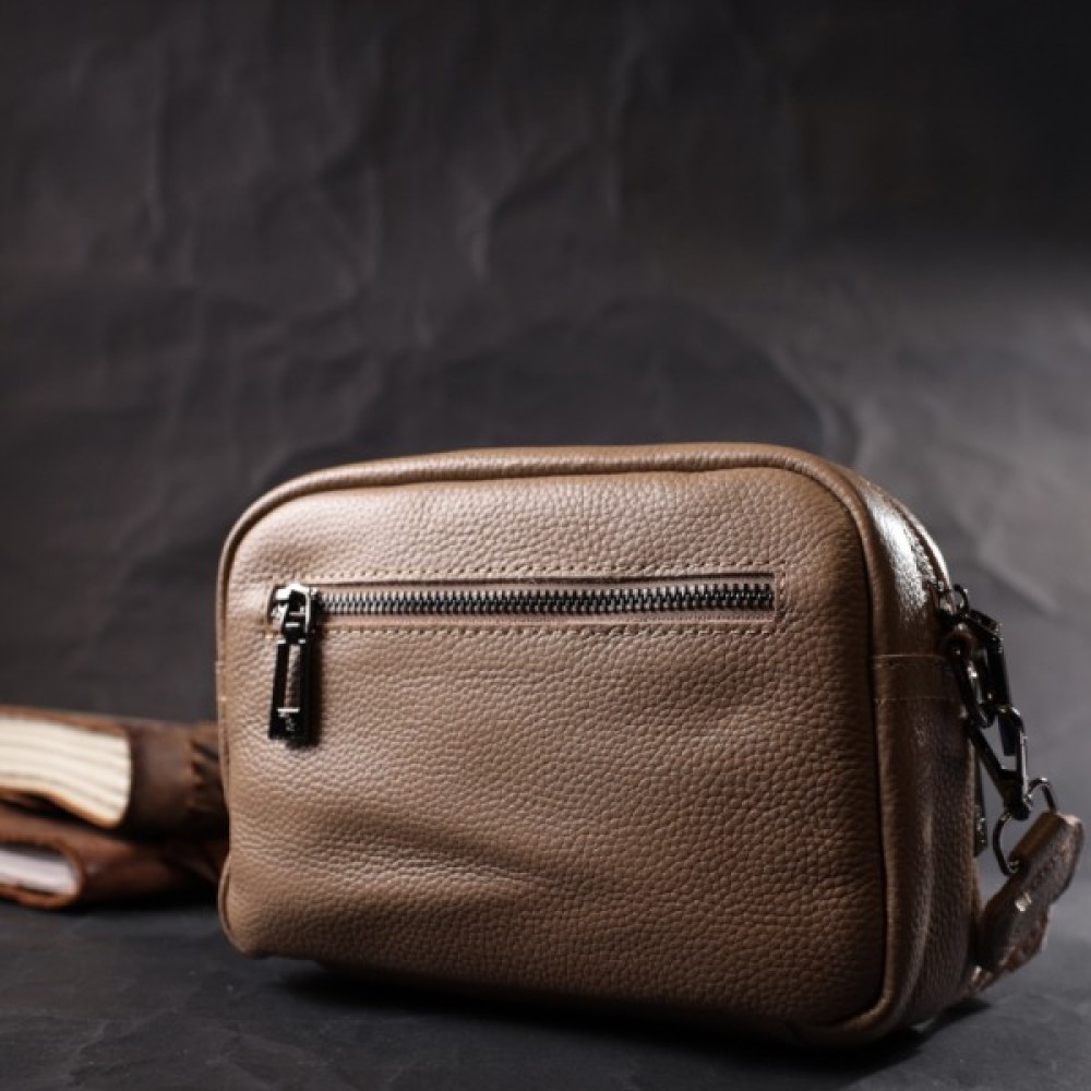Цікава жіноча сумка з накладною кишенею на лицьовій стороні. Виріб пошитий з якісної натуральної шкіри, яка довго носиться і не втрачає свого первісного вигляду. Аксесуар складається з одного основного відділення всередині якого розташована кишеня відкритого типу і кишеня на блискавці, також зовні розташована кишеня на блискавці, на тильній стороні та накладна кишеня на блискавці, на лицьовій стороні. Носити сумку можна в руці як клатч, на плечі та через плече, для цього є текстильний ремінь, що знімається. У виробі використано якісну фурнітуру кольору темного срібла. Універсальний варіант сумки як на вечір так і як сумочка на кожен день.
