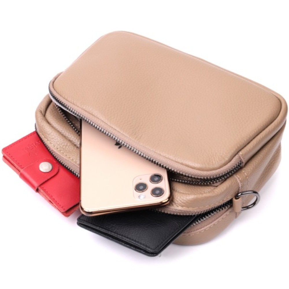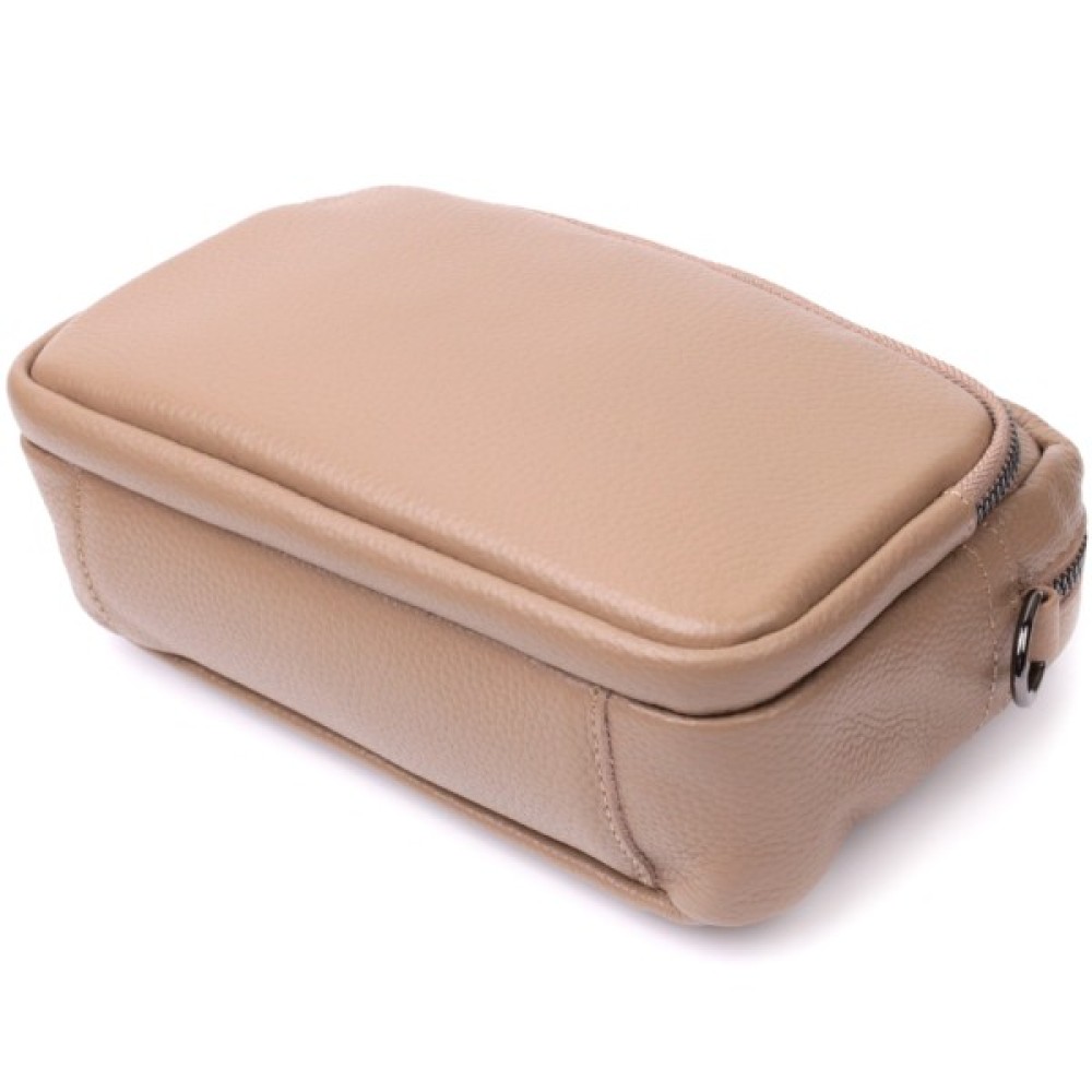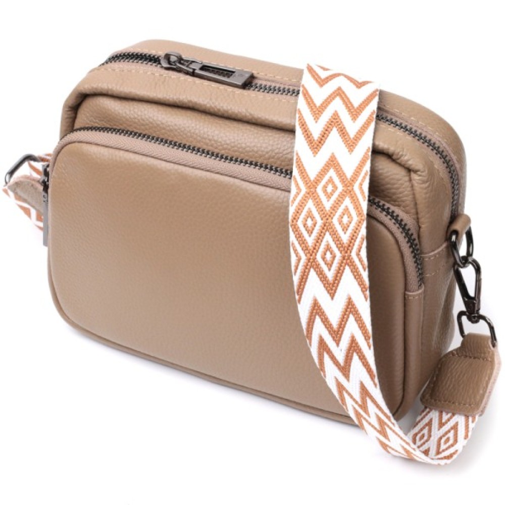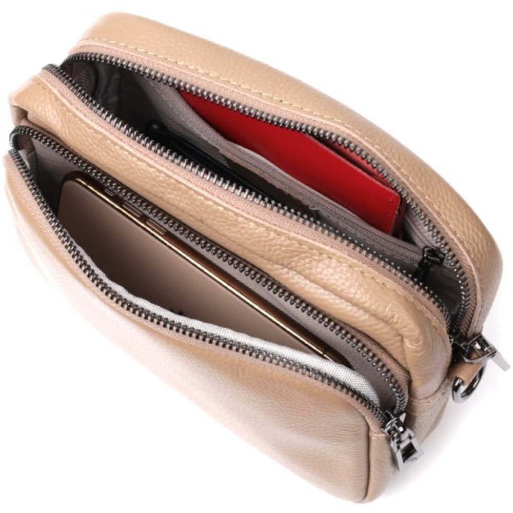 Цікава жіноча сумка з накладною кишенею на лицьовій стороні. Виріб пошитий з якісної натуральної шкіри, яка довго носиться і не втрачає свого первісного вигляду. Аксесуар складається з одного основного відділення всередині якого розташована кишеня відкритого типу і кишеня на блискавці, також зовні розташована кишеня на блискавці, на тильній стороні та накладна кишеня на блискавці, на лицьовій стороні. Носити сумку можна в руці як клатч, на плечі та через плече, для цього є текстильний ремінь, що знімається. У виробі використано якісну фурнітуру кольору темного срібла. Універсальний варіант сумки як на вечір так і як сумочка на кожен день.