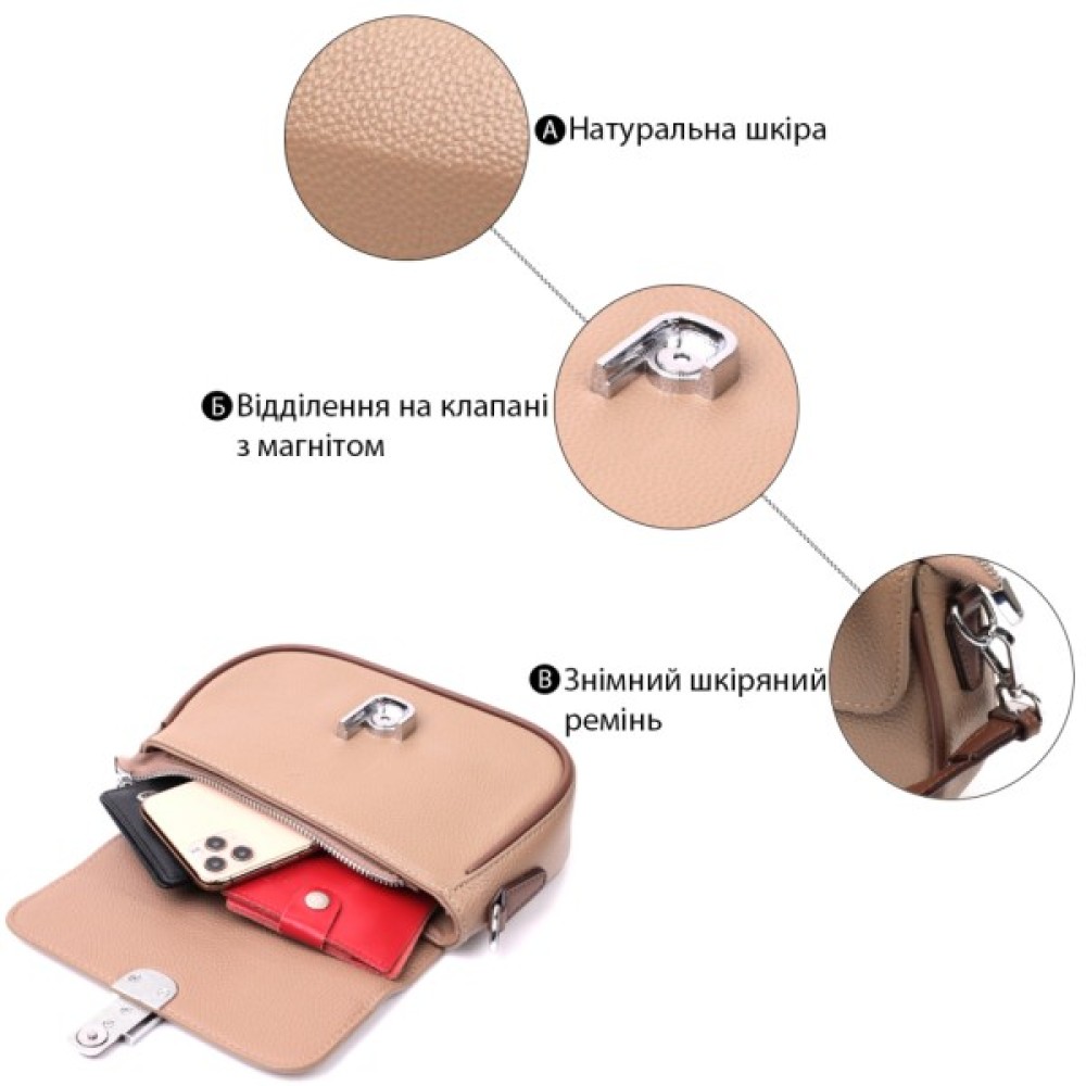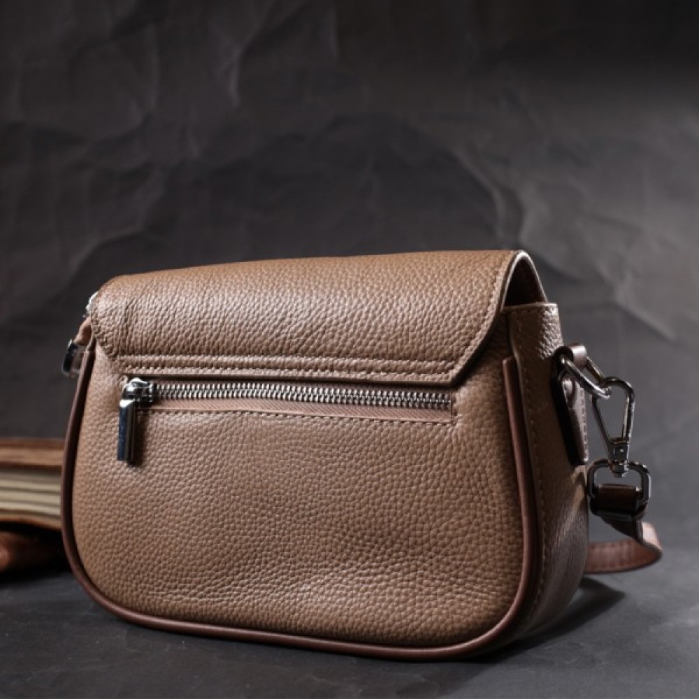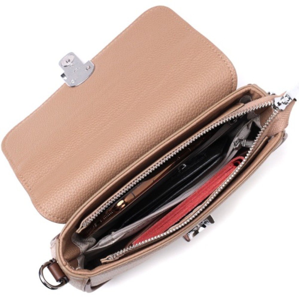 Цікава жіноча сумка з якісної натуральної шкіри, яка довго носиться і не втрачає свого первісного вигляду. Аксесуар складається з одного основного відділення всередині якого потайна кишеня на блискавці, кишеня відкритого типу та кишеня-перегородка, а зовні, на тильній стороні розташована кишеня на блискавці. Носити сумку можна в руці, на плечі і через плече, для цього є шкіряний ремінь, що знімається. У виробі використано якісну фурнітуру срібного кольору. Універсальний варіант сумки як на вечір так і як сумочка на кожен день.