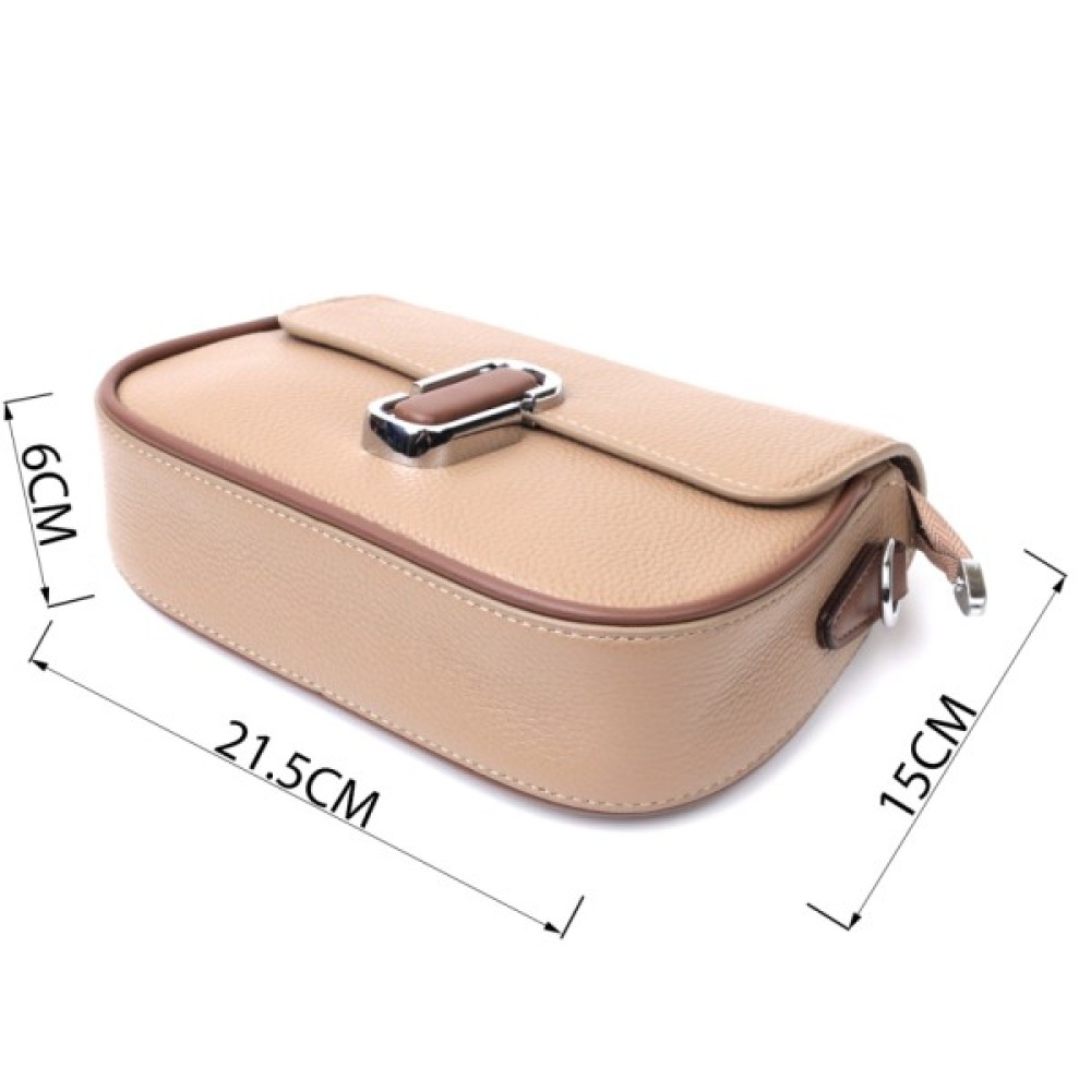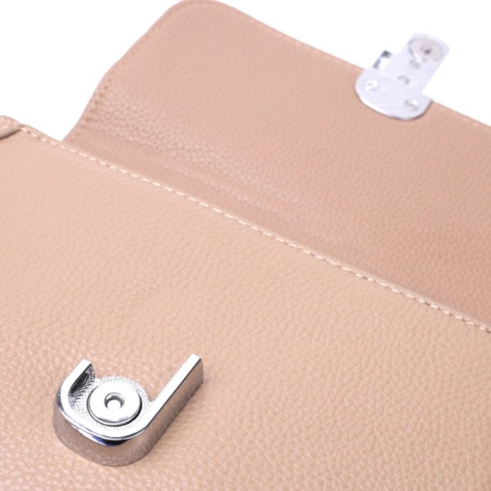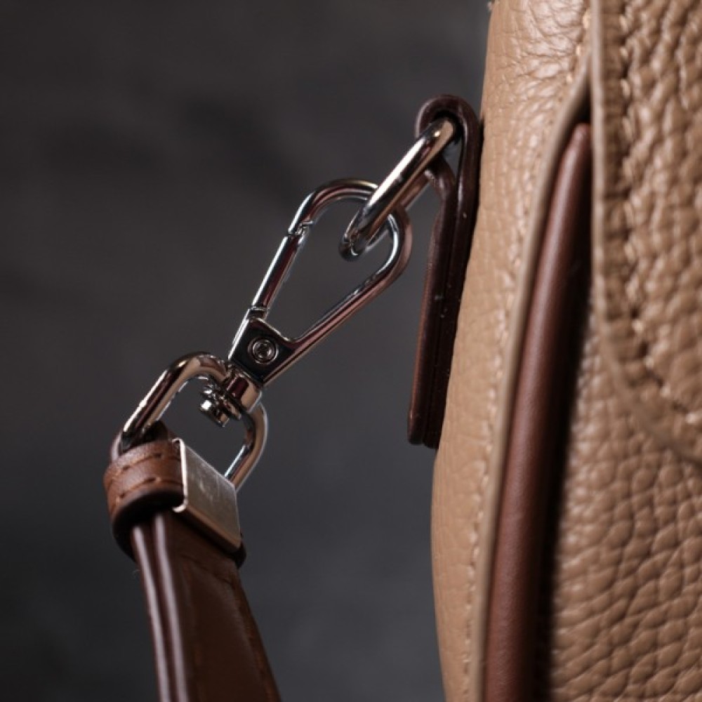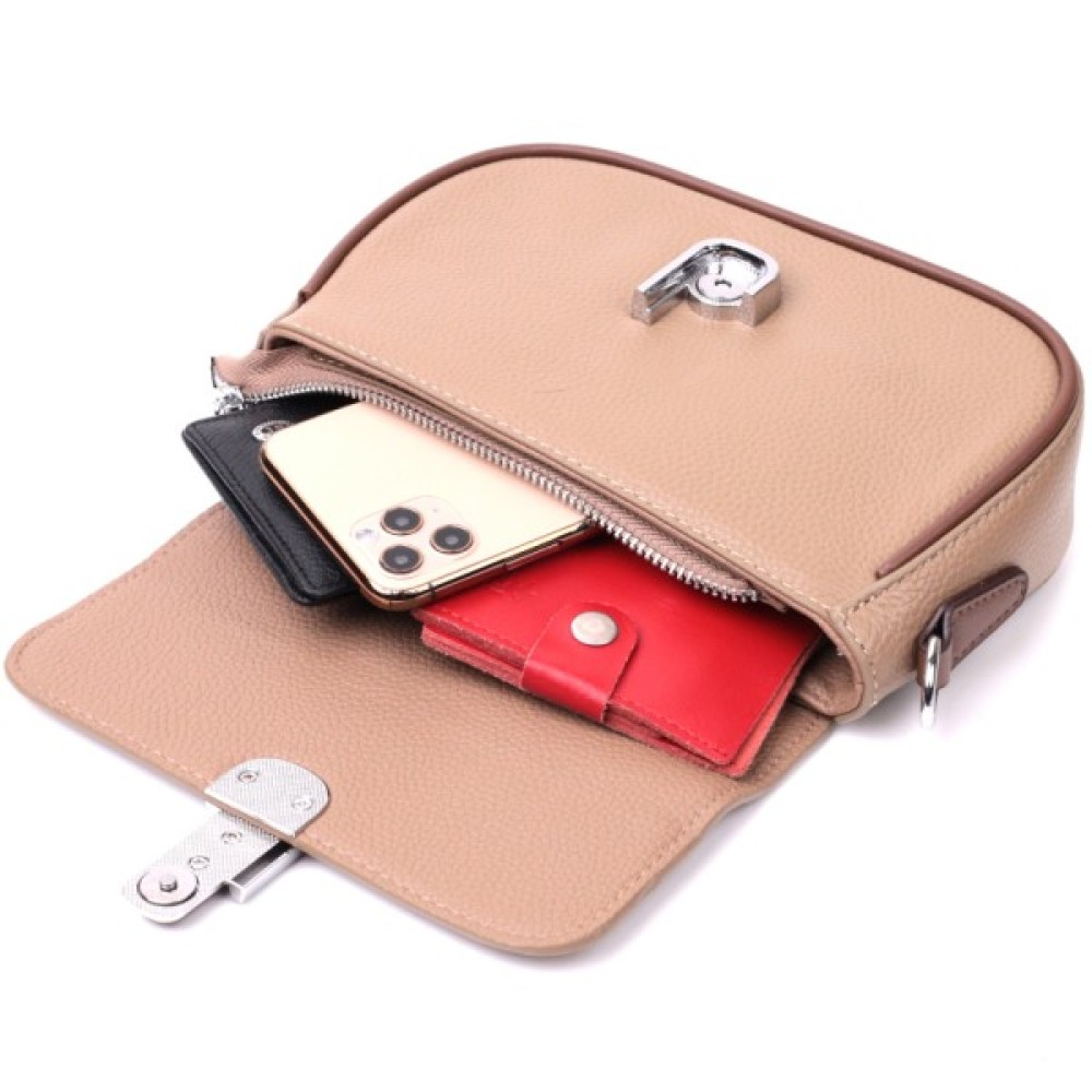 Цікава жіноча сумка з якісної натуральної шкіри, яка довго носиться і не втрачає свого первісного вигляду. Аксесуар складається з одного основного відділення всередині якого потайна кишеня на блискавці, кишеня відкритого типу та кишеня-перегородка, а зовні, на тильній стороні розташована кишеня на блискавці. Носити сумку можна в руці, на плечі і через плече, для цього є шкіряний ремінь, що знімається. У виробі використано якісну фурнітуру срібного кольору. Універсальний варіант сумки як на вечір так і як сумочка на кожен день.