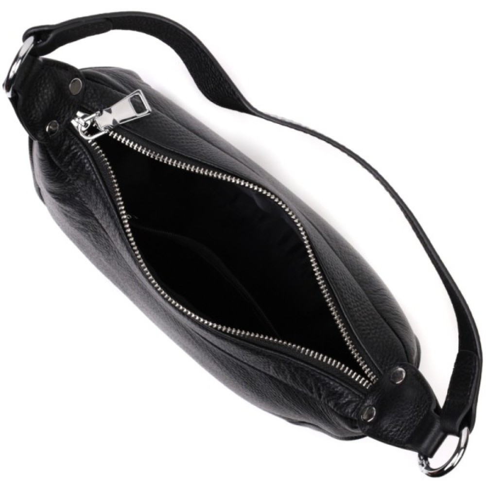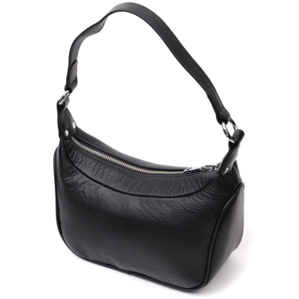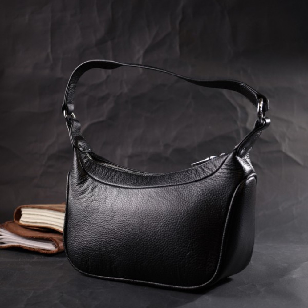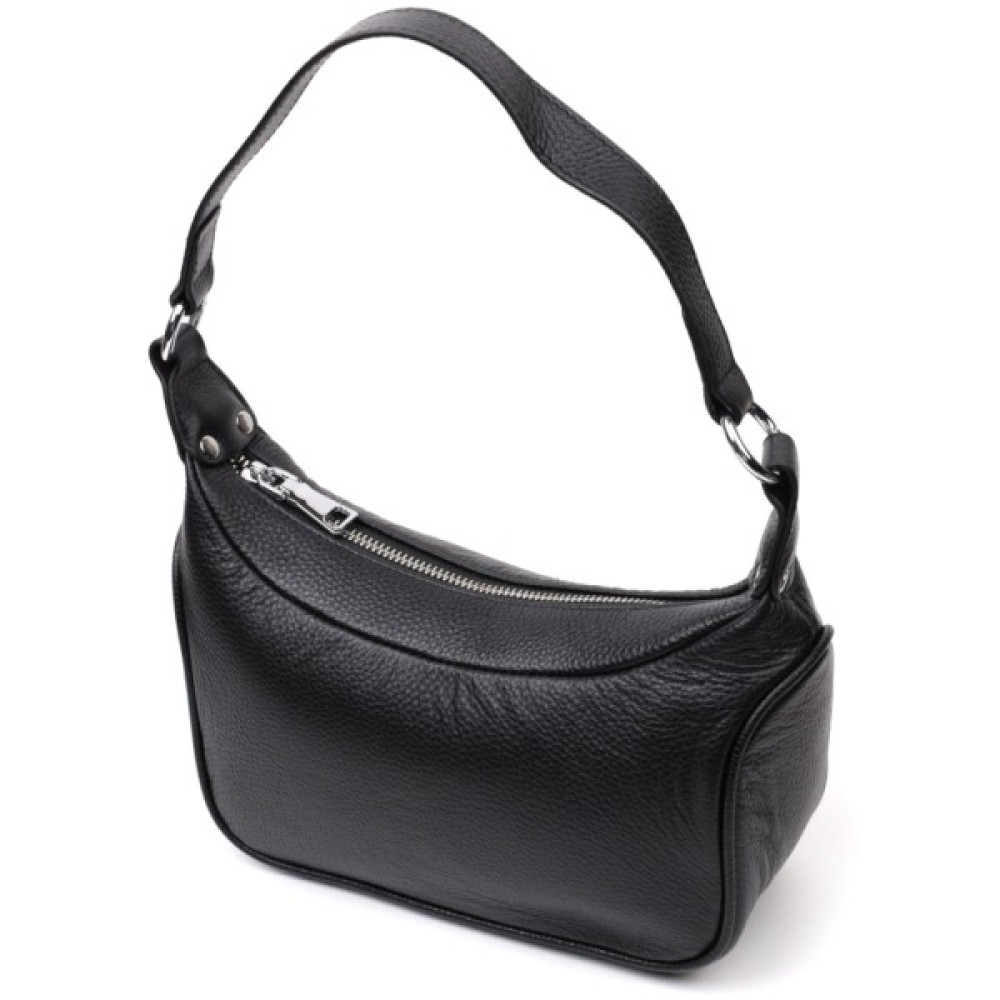 Жіноча сумка в класичному чорному кольорі з натуральної шкіри з високим показником якості та зносостійкості. Аксесуар складається з одного відділення з потайною кишенею на блискавці всередині.
