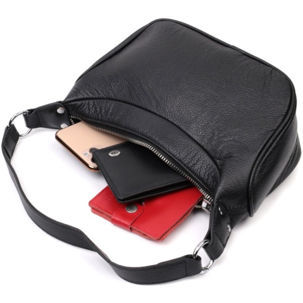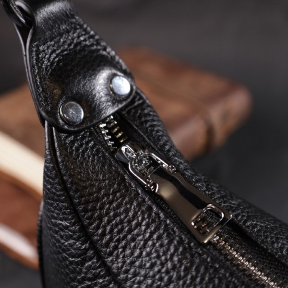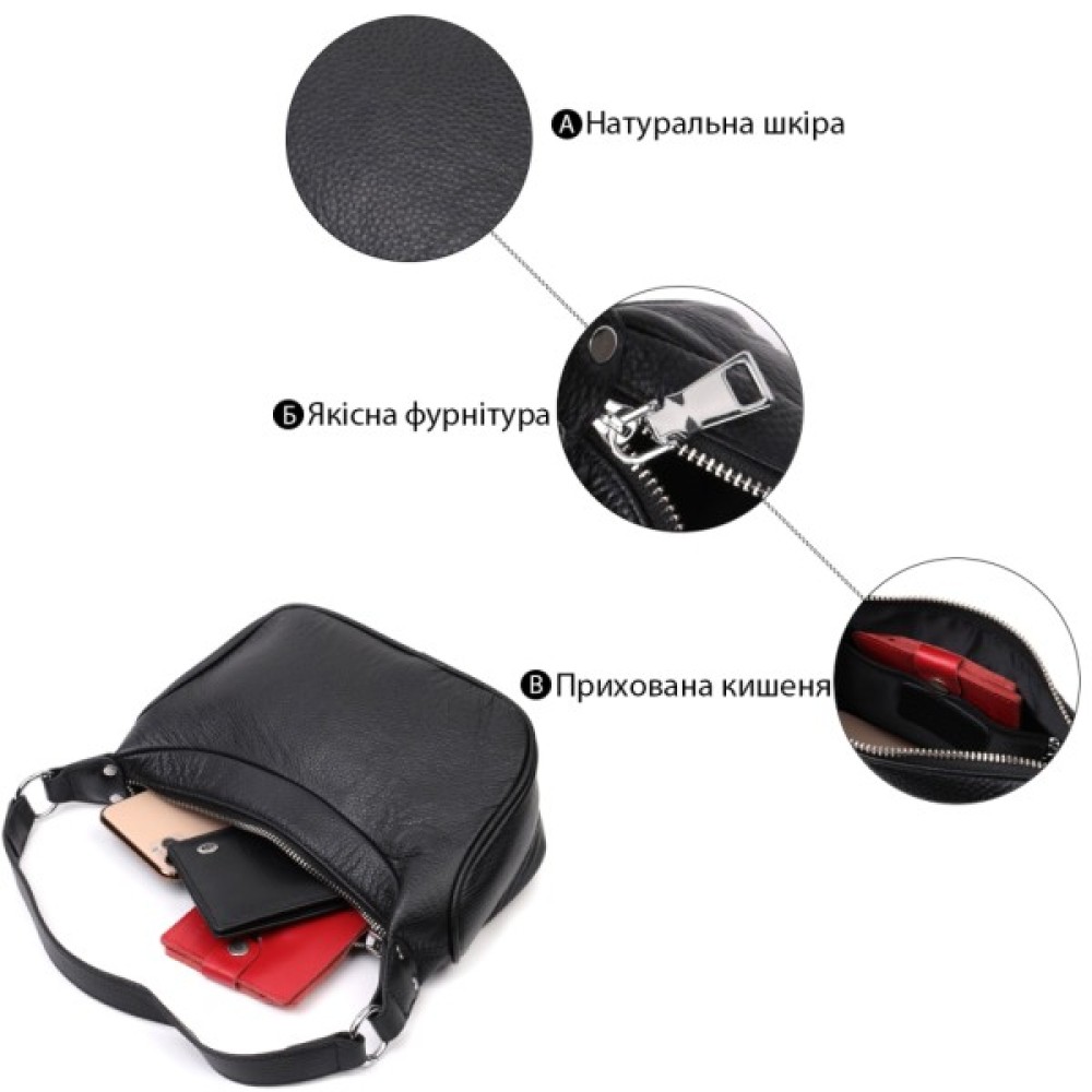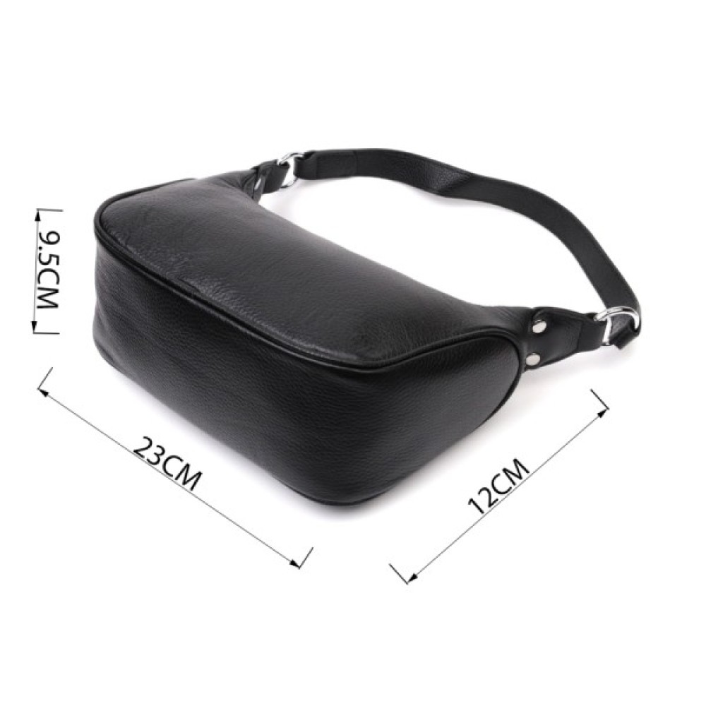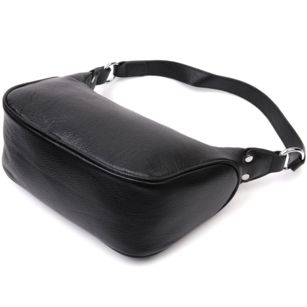 Жіноча сумка в класичному чорному кольорі з натуральної шкіри з високим показником якості та зносостійкості. Аксесуар складається з одного відділення з потайною кишенею на блискавці всередині.