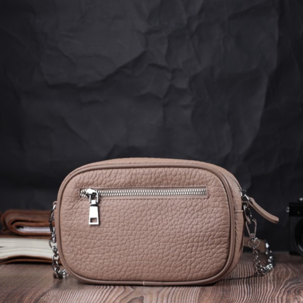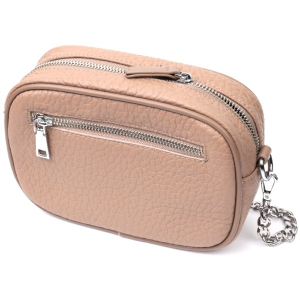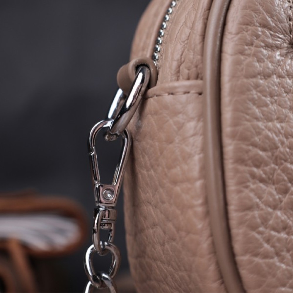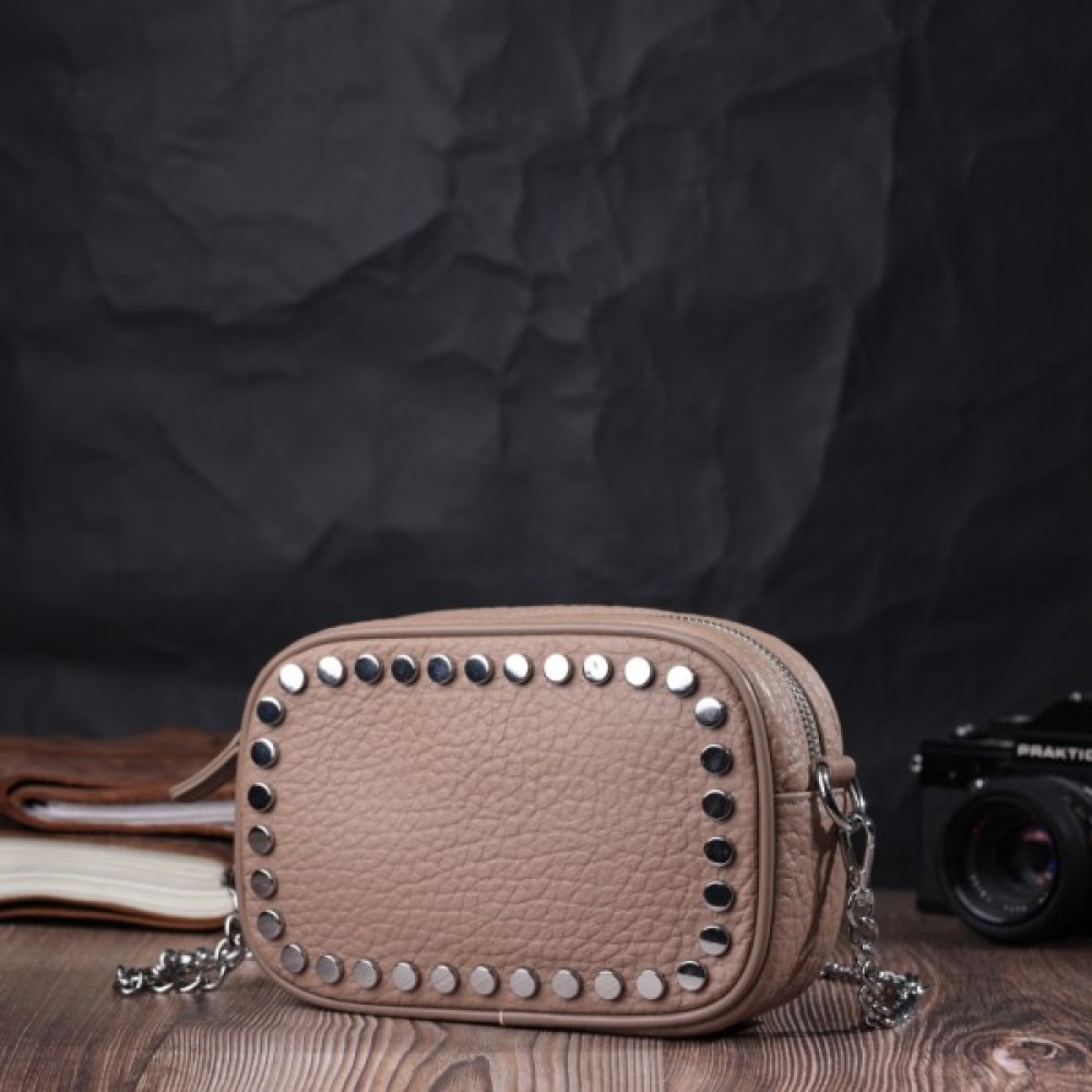 Цікава сумка жіноча з натуральної крупнозернистої шкіри, на лицьовій стороні, по краю, декорована кнопками у вигляді прямокутника. Аксесуар складається з одного основного відділення, потайної кишені на блискавці, кишені відкритого типу та кишені на блискавці зовні. Носити сумку можна в руках, на плечі і через плече, для цього є ручка для перенесення в руках і знімний ремінець з ланцюжком для переносу не плечі. У виробі використано надійну фурнітуру срібного кольору. Шкіряна сумка – найкращий подарунок для будь-якої дівчини.
