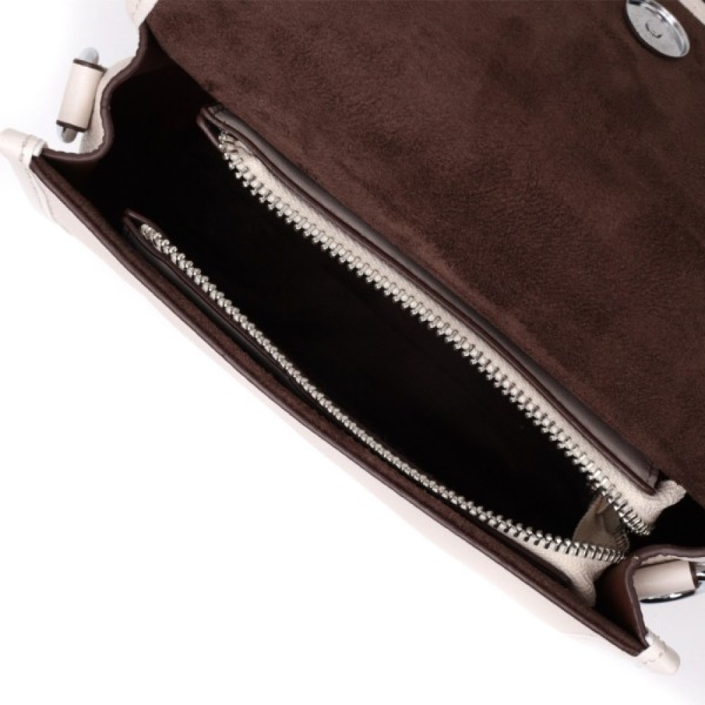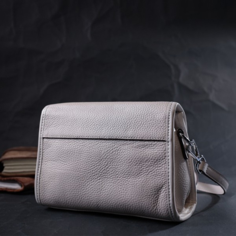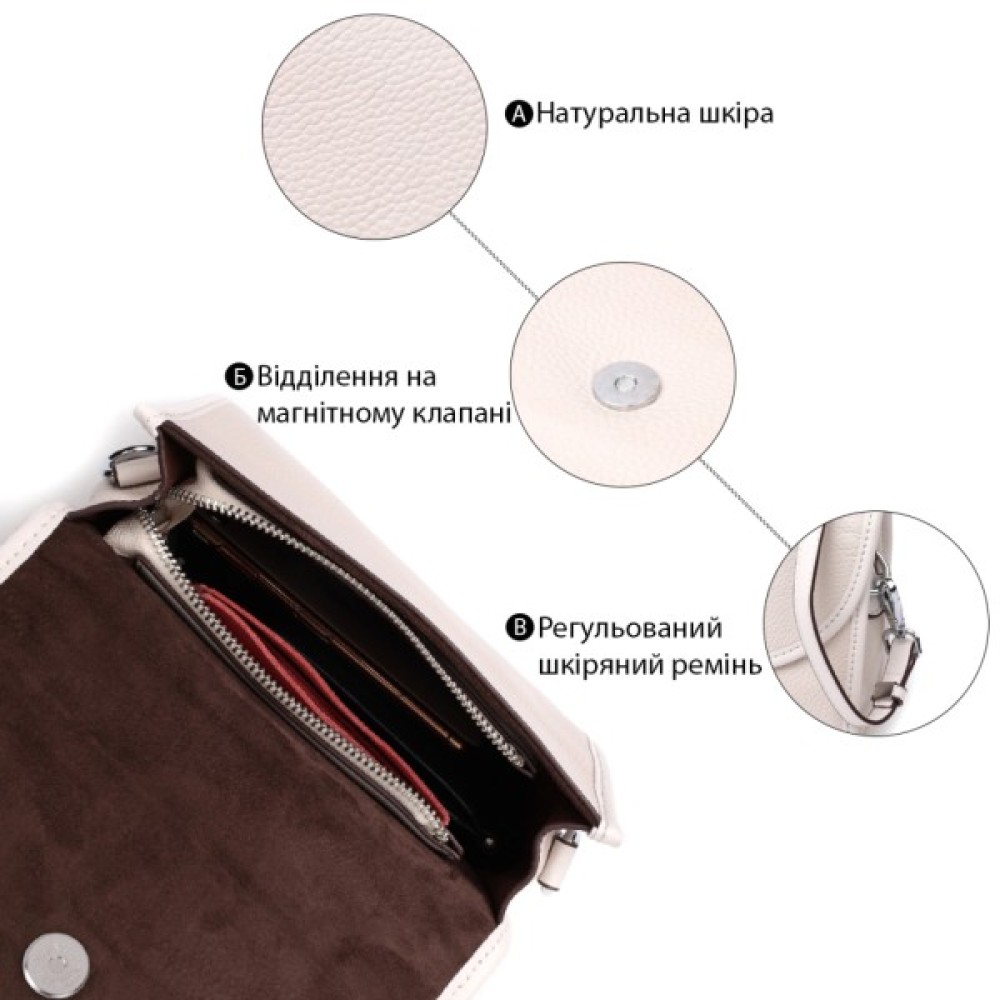 Ніжна маленька сумочка яка закривається на блискавку та стильний напівкруглий клапан на магніті. Виріб пошитий з якісної натуральної м'якої шкіри, яка довго носиться і не втрачає свого первісного вигляду. Аксесуар складається з основного відділення та потайної кишені на блискавці. Носити сумку можна під рукою, на плечі і через плече, для цього є шкіряний ремінь, що знімається регульований. У виробі використано якісну фурнітуру срібного кольору. Універсальний варіант сумки, який підійде для вечора, а також відмінно підійде на кожен день.