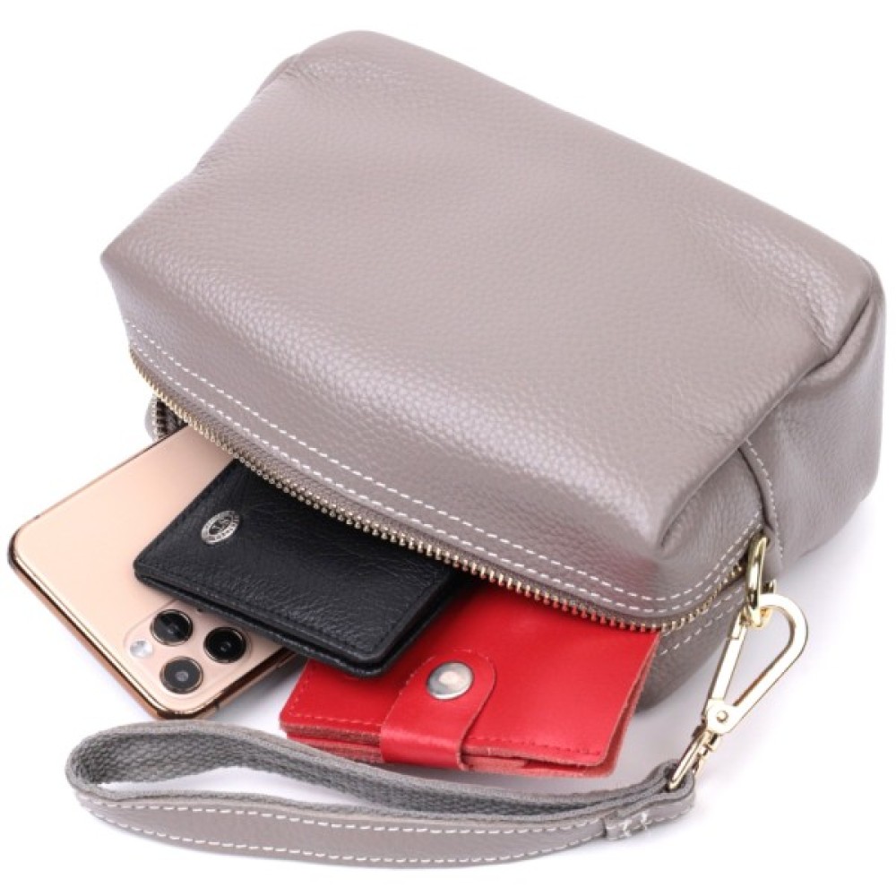 Маленька сумка-клатч із двома шкіряними ремінцями з якісної натуральної шкіри, яка довго носиться і не втрачає свого первісного вигляду. Аксесуар складається із одного основного відділення. Носити сумку можна в руці, на зап'ясті, на плечі і через плече, для цього є шкіряний знімний плечовий ремінь, а також знімний шкіряний кистьовий ремінь. У виробі використано якісну фурнітуру кольору жовтого золота. Універсальний варіант сумки як на вечір так і як сумочка на кожен день.