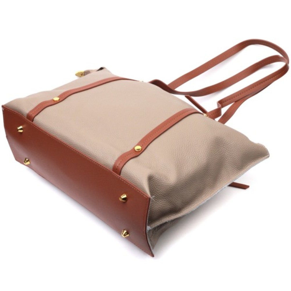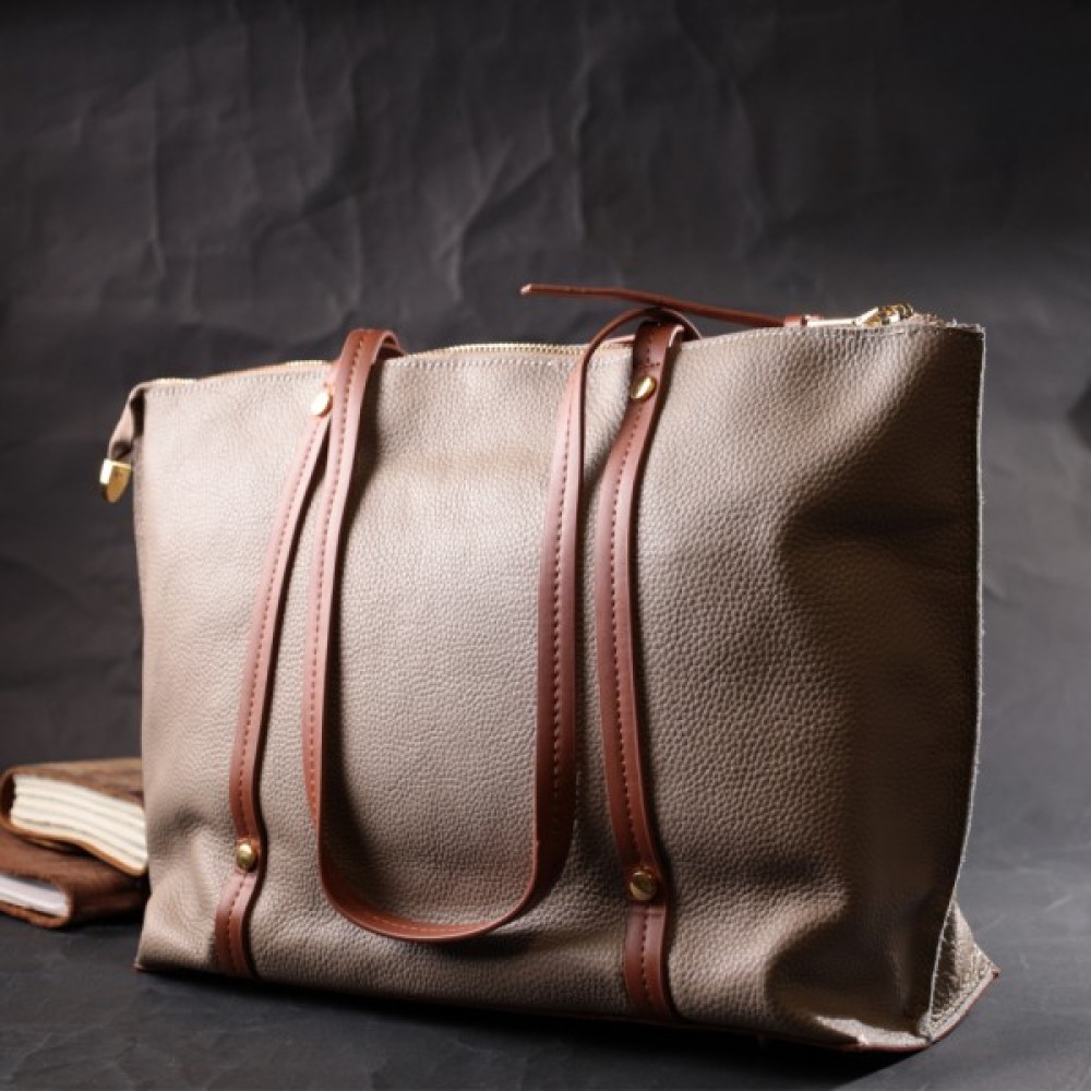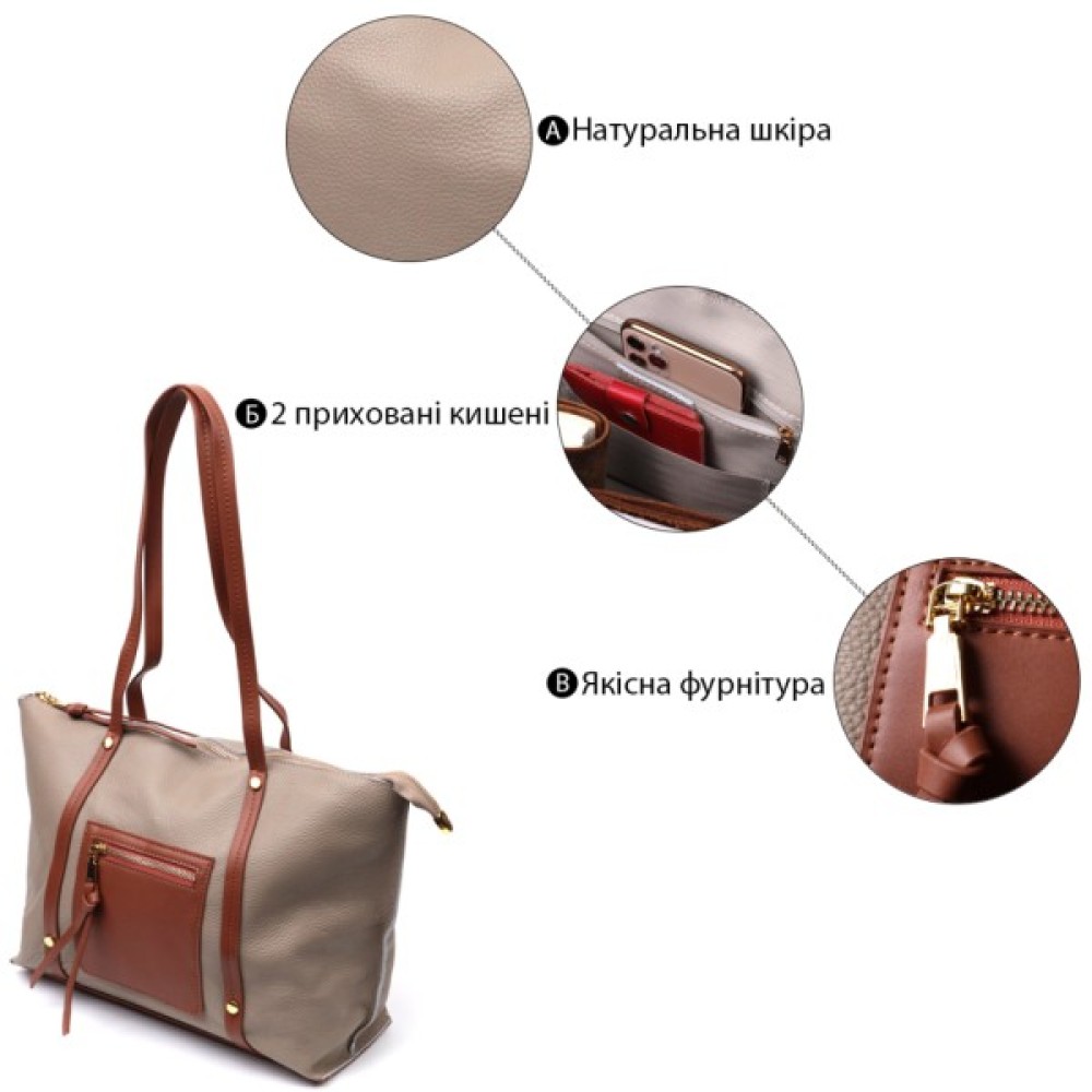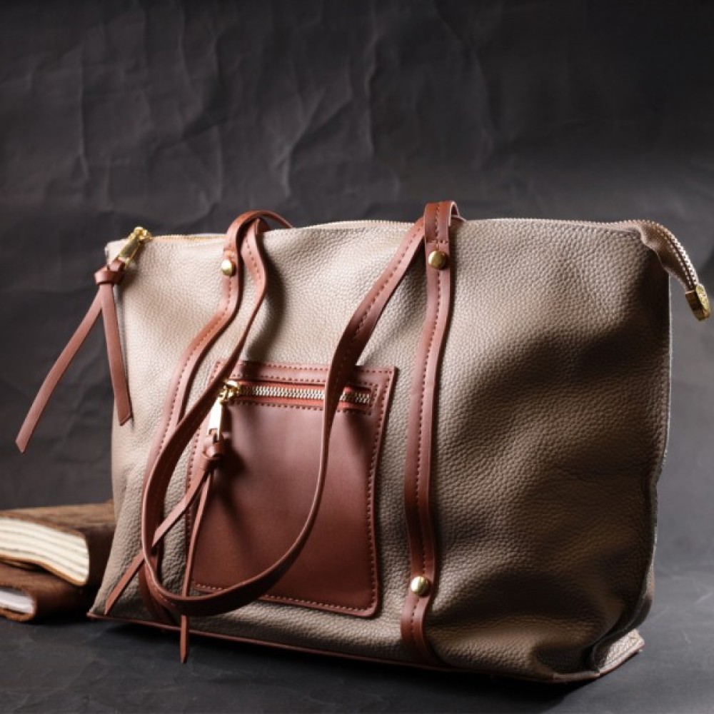 Велика жіноча сумка, у поєднанні двох кольорів бежевого та коричневого. Пошито виріб з натуральної шкіри флотар, яка невибаглива у догляді та довго носиться.