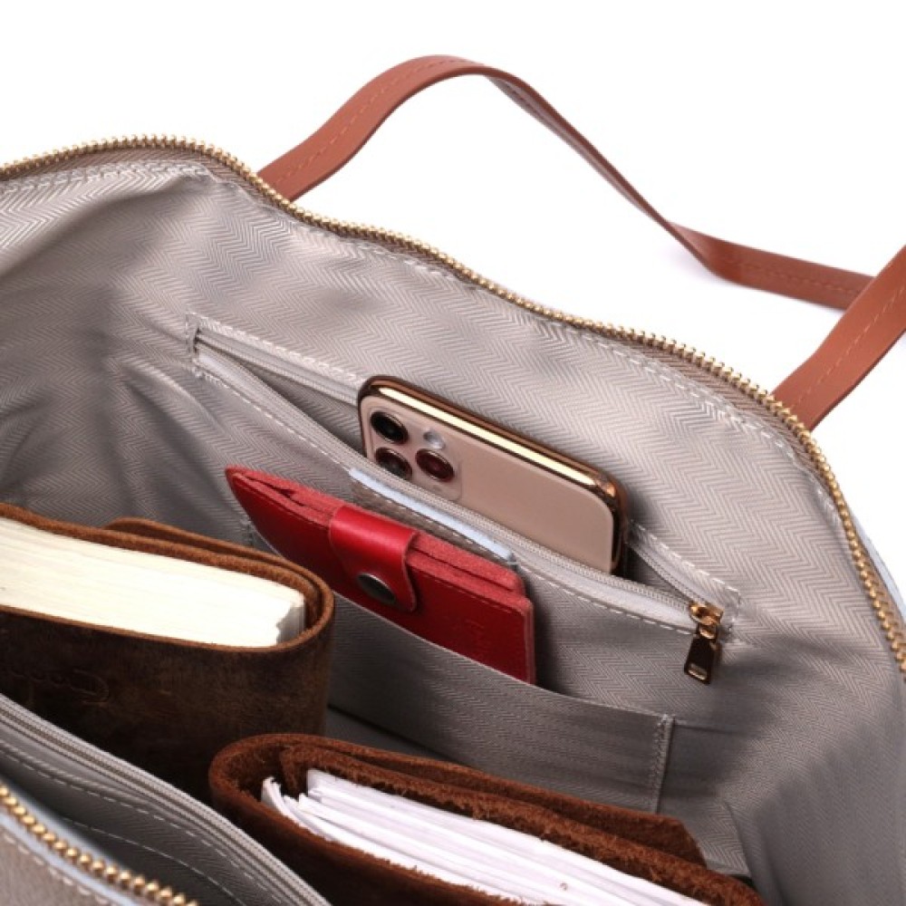Носити сумку можна на плечі та в руках, для цього є подовжені шкіряні ручки.