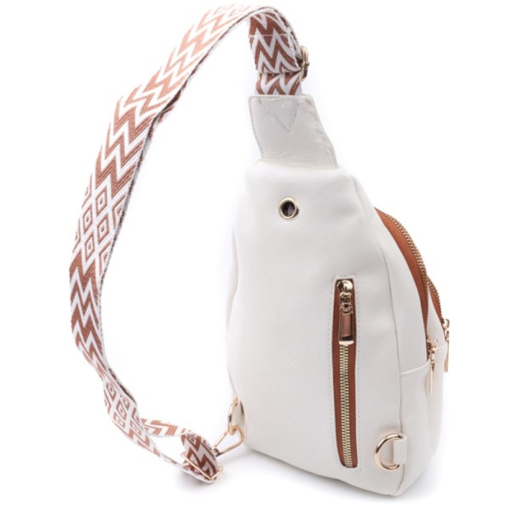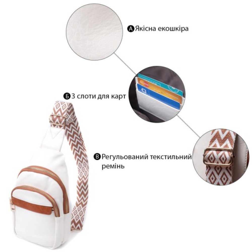 Зручна слінг сумка для жінок з гладкої екошкіри. Дана модель складається з одного основного відділення, яке закривається на блискавку і в якому знаходиться кишеня на блискавці і три кишені для кредитних карток усередині, а також трьох кишень зовні та одного отвору для кабелю або навушників, що дуже зручно в сучасному світі. Акцентом даної моделі є зручний регульований плечовий ремінець у етнічному стилі, що дуже модно вже кілька сезонів. Екошкіра - високоякісна альтернатива натуральному матеріалу, яка дуже стійка до тертя, до низьких температур, відмінно носиться на відміну від інших штучних матеріалів, а також має гіпоалергенний склад на відміну від натуральної шкіри.