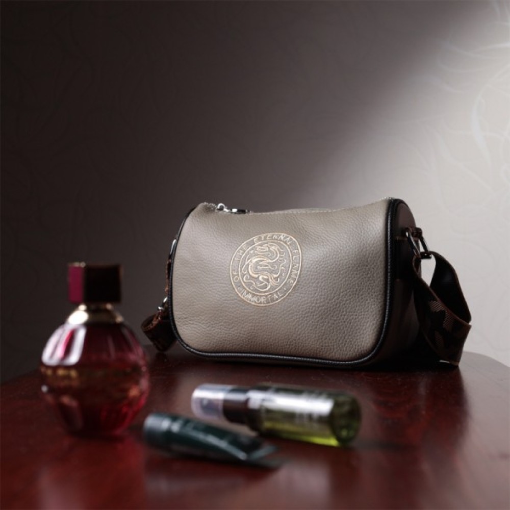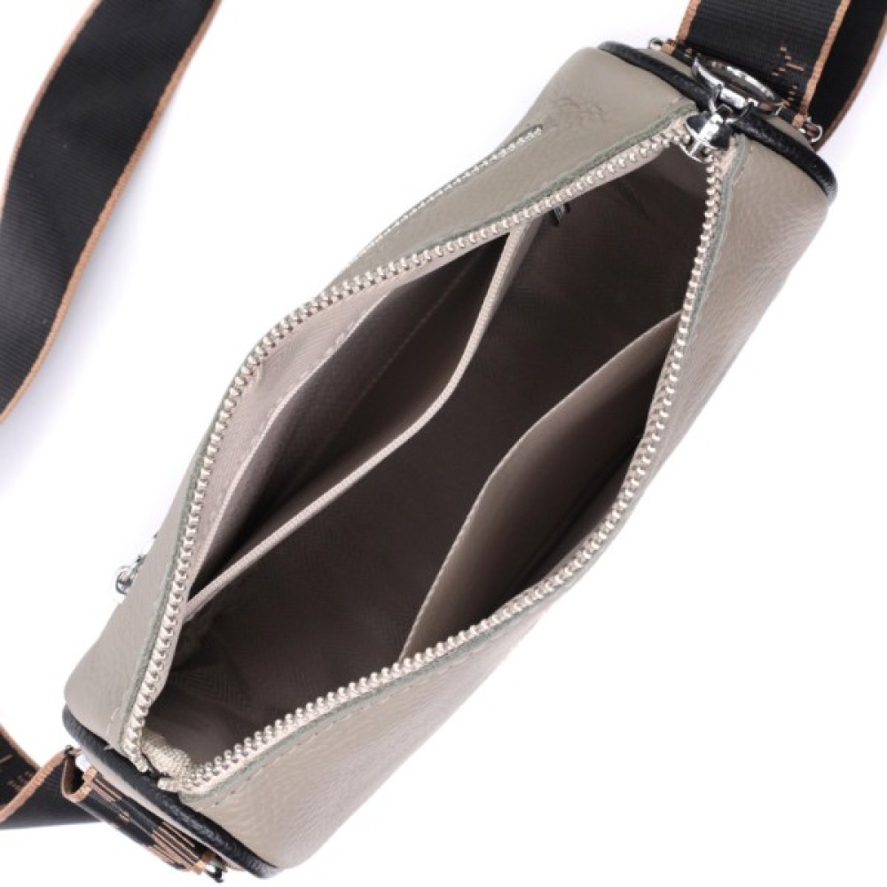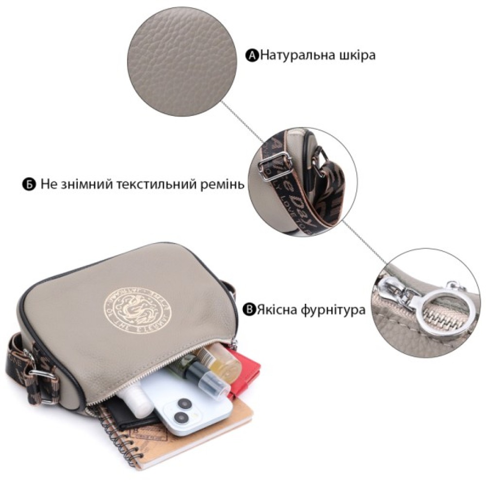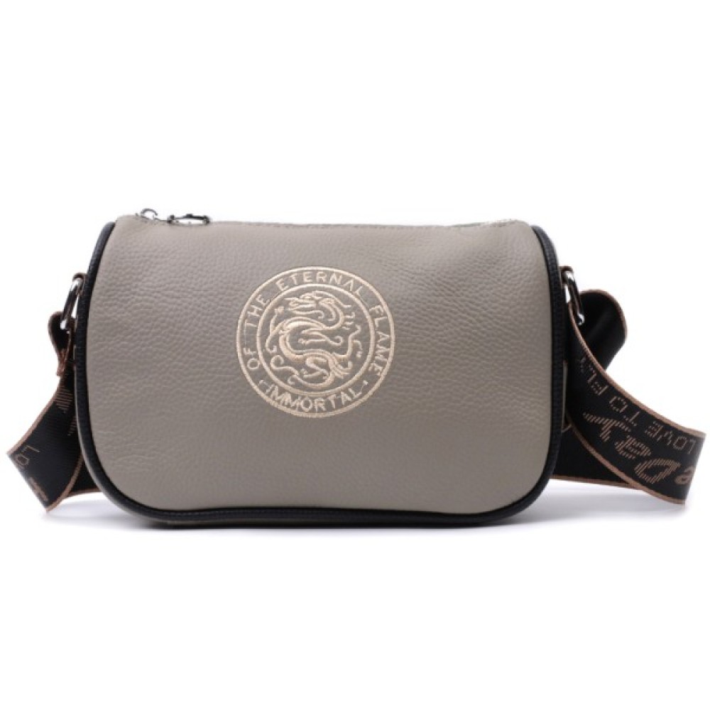 Стильна жіноча сумка з вишивкою по центру з натуральної якісної шкіри. Аксесуар складається з основного відділення, яке закривається на блискавку, потайної кишені на блискавці та кишені відкритого типу всередині, а також кишені на блискавці зовні на тильній стороні. Носити сумку можна в руці, під рукою, на плечі та через плече, для цього є не знімний текстильний ремінь. В аксесуарі використано якісну фурнітуру кольору срібла.