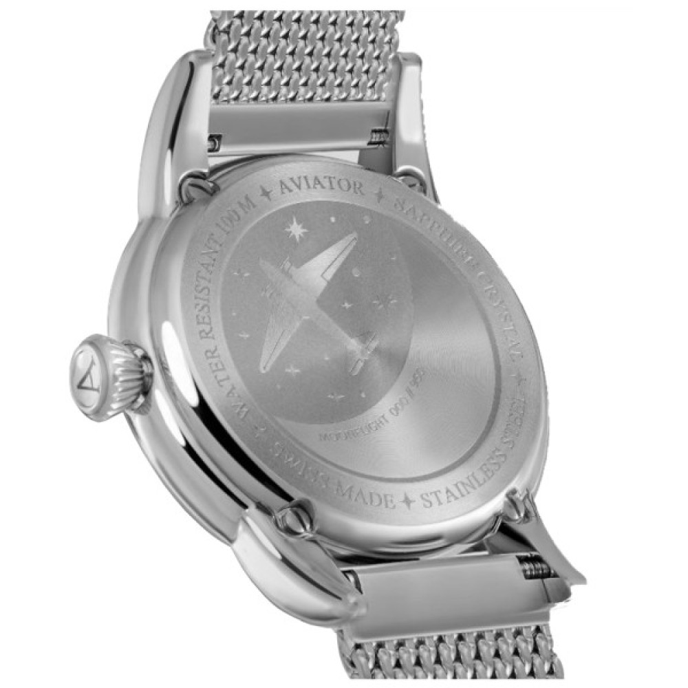 Кожна модель AVIATOR має свою історію. Погляньте на кришку корпусу годинника MoonFlight та побачите вигравіроване зображення літака Douglas DC-3 у таємничому місячному світлі. Зображення оживає завдяки застосуванню безлічі технік обробки, а саме гравірування трохи втиснуте в кришку, що надає їй додаткової витонченості. Кришка надійно закріплена на корпусі сталевими гвинтами, а значить, ви можете почати з занурення у воду, де виглядатимете не менш елегантно, адже годинник водонепроникний на глибині до 100 метрів.