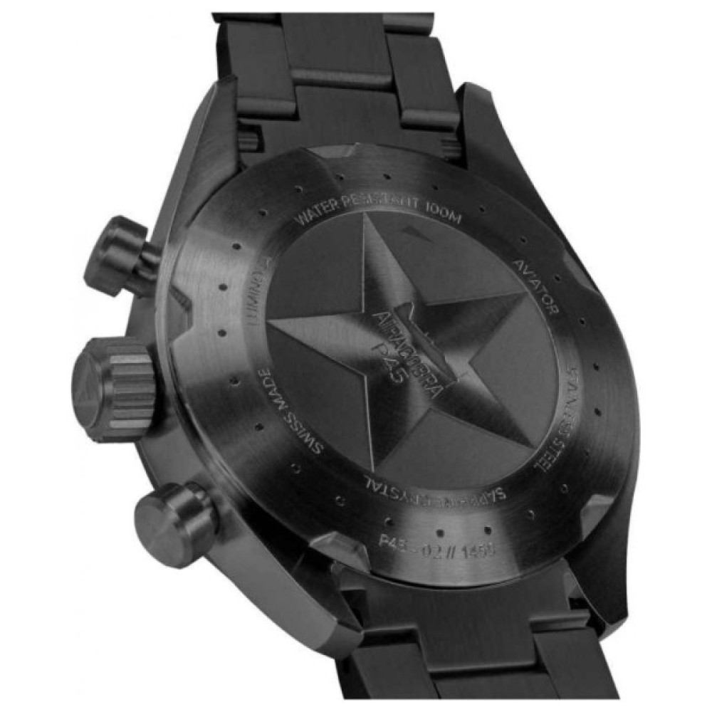 Під час Другої світової війни забезпечення авіаційної підтримки літаками Airacobra було запорукою успіху сухопутних операцій. Годинник AVIATOR Airacobra P45 Chrono своїм інструментальним виглядом не поступається авіаційному прототипу і вселяє впевненість. Як і легендарний військовий літак, вони витримані у ретро-стилі. При створенні AVIATOR Airacobra P45 Chrono використовуються найкращі матеріали, що забезпечує годиннику військову точність та класичний вигляд. Своєю високою контрастністю стрілки та годинникові мітки нагадують оформлення кабіни пілота. Форма корпусу у годинника завжди буде актуальною, а виконаний в стилі крокодилової шкіри ремінець вносить елемент розкоші. Всі години AVIATOR властива виняткова надійність і прагнення увічнити пам'ять про віхи в історії авіації.