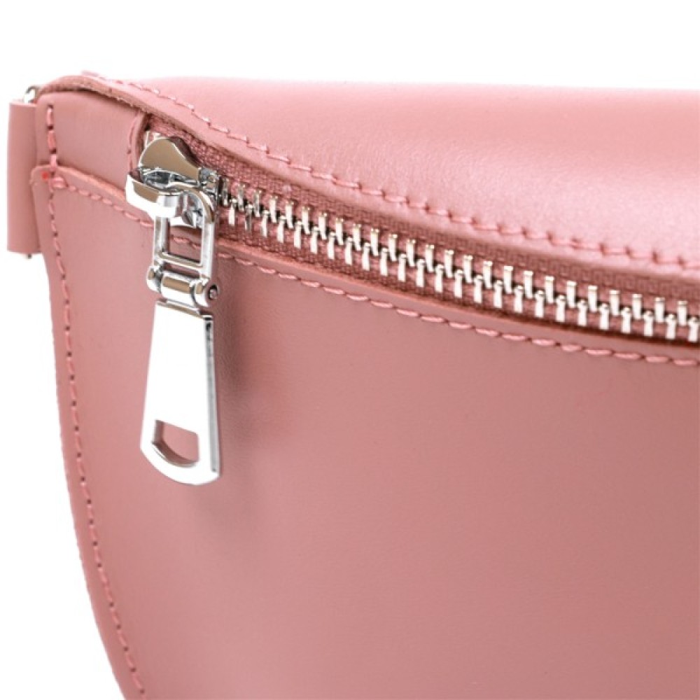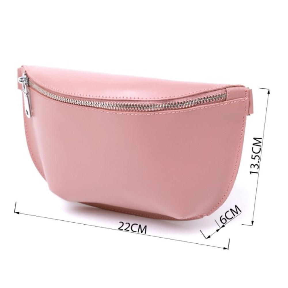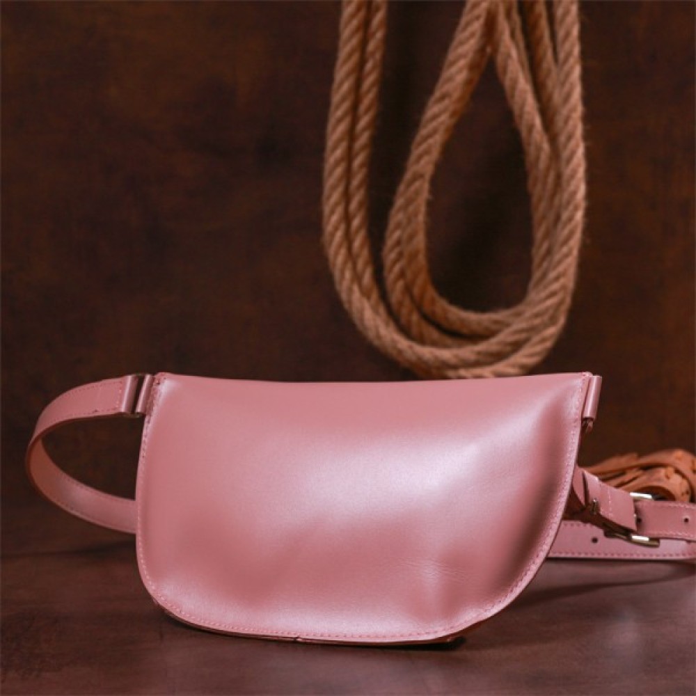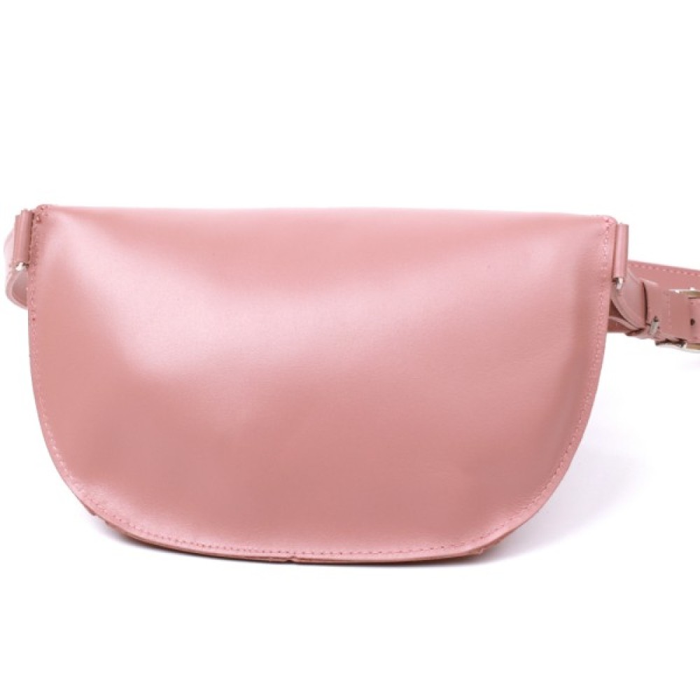 Чудова жіноча сумка на пояс у красивому та модному дизайні від українського виробника. Матеріал виготовлення – натуральна шкіра високого класу із відмінними експлуатаційними характеристиками. Колір виробу – ніжно-рожевий, фактура – гладка та приємна на дотик. Ремінь виконаний також із натуральної шкіри та може регулюватися по довжині.