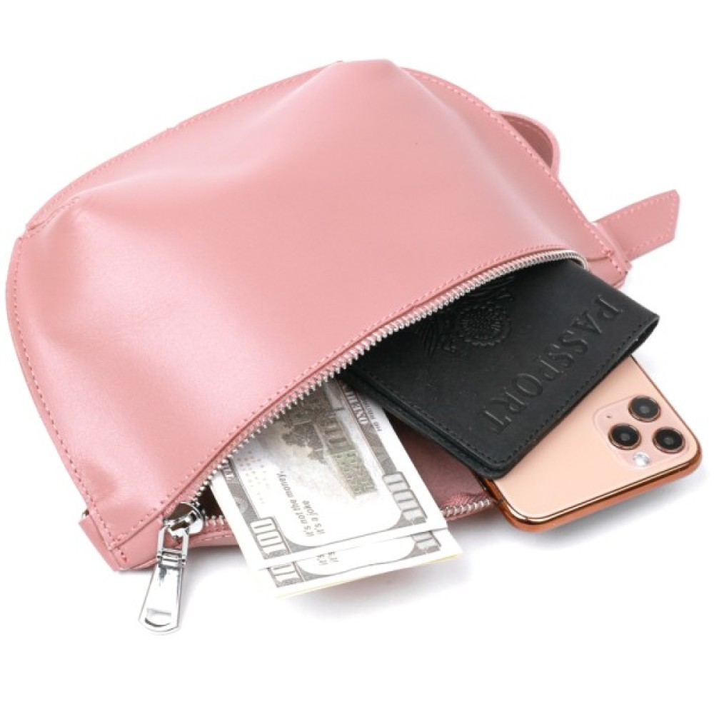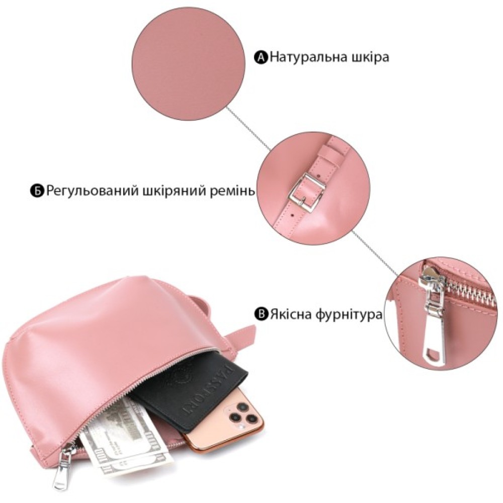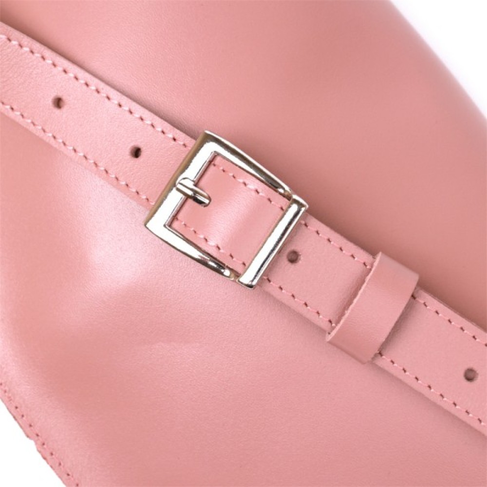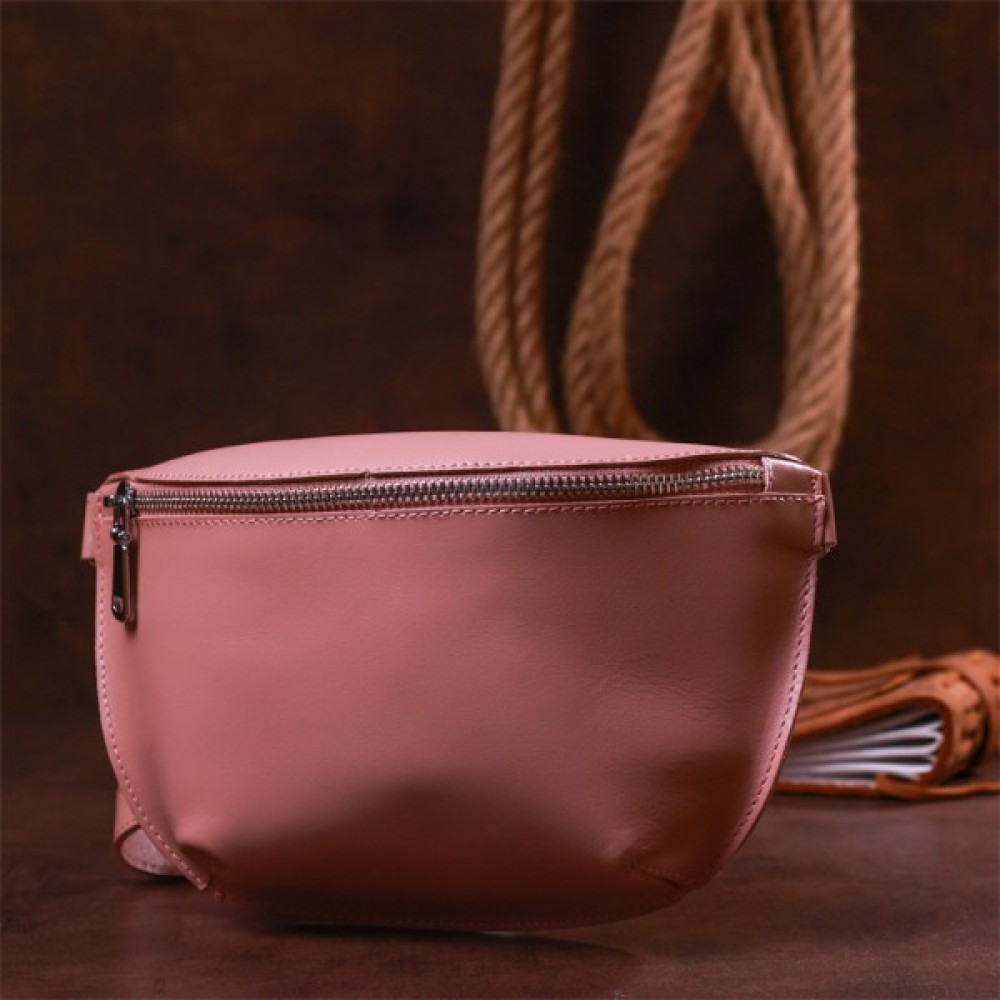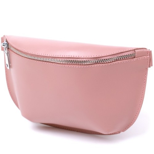 Чудова жіноча сумка на пояс у красивому та модному дизайні від українського виробника. Матеріал виготовлення – натуральна шкіра високого класу із відмінними експлуатаційними характеристиками. Колір виробу – ніжно-рожевий, фактура – гладка та приємна на дотик. Ремінь виконаний також із натуральної шкіри та може регулюватися по довжині.