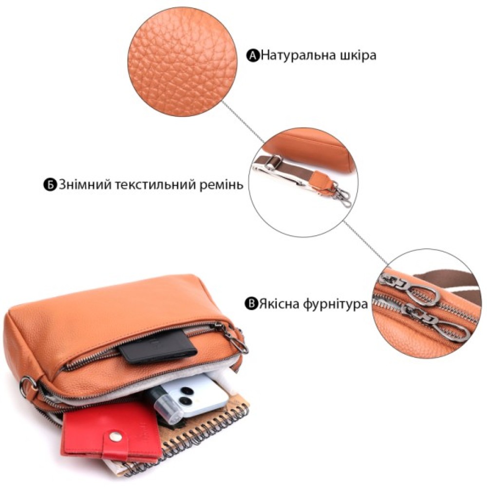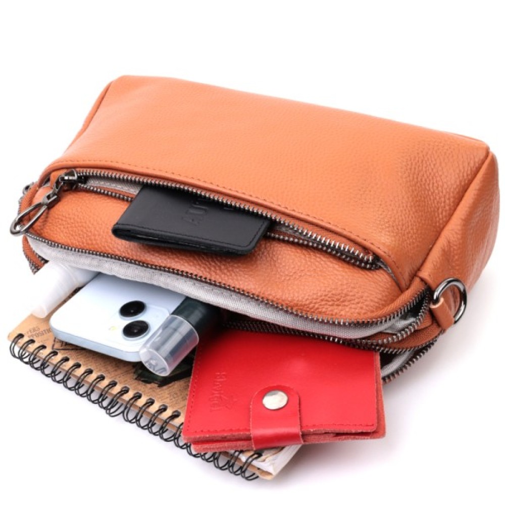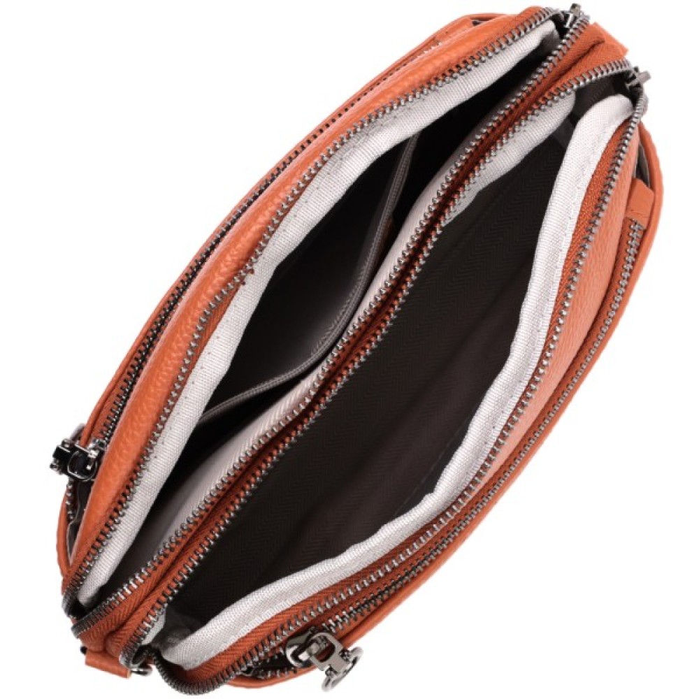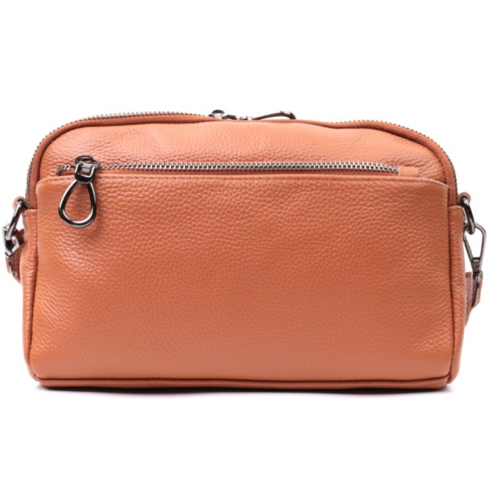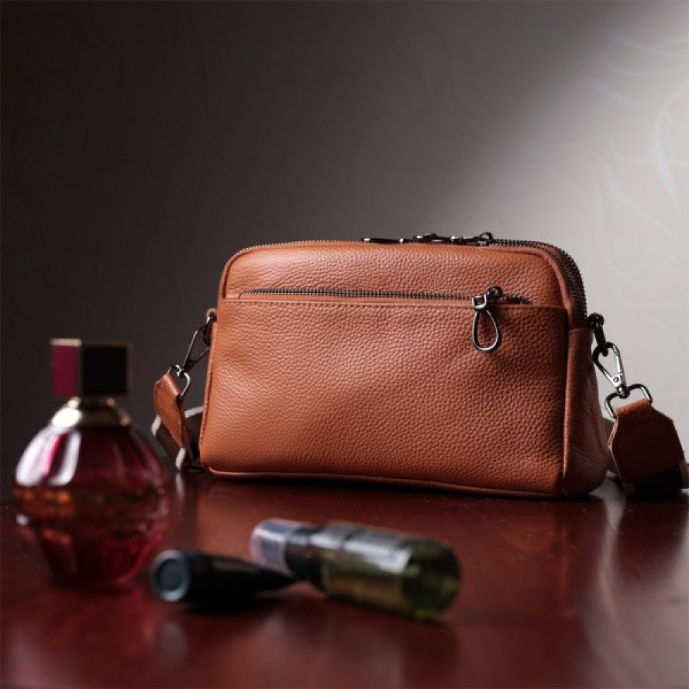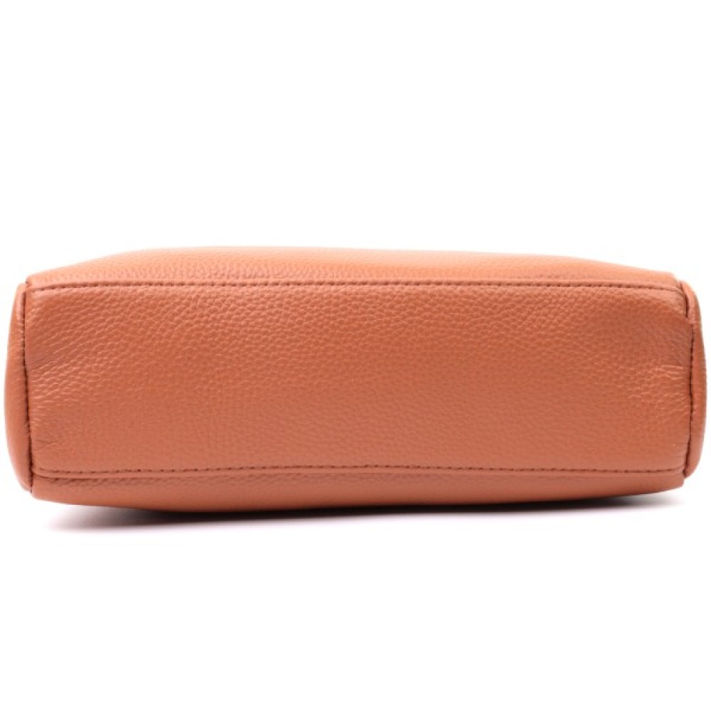 Зручна жіноча сумка на всі випадки із натуральної шкіри флотар, яка має зернисту фактуру. У виробі використано шкіру коричневого кольору. Аксесуар складається з двох відділень, які закриваються на блискавці, потайної кишені на блискавці та кишені відкритого типу, а також двох кишень зовні на лицьовій та тильній стороні. Носити сумку можна в руці, під рукою, на плечі та через плече, для цього є текстильний ремінь, що знімається. В аксесуарі використано якісну фурнітуру кольору темного срібла. Відмінний варіант для подарунка близьким та дорогим дівчатам та жінкам.