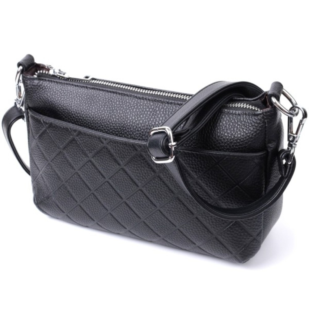 Прямокутна сумка для жінок у класичному чорному кольорі з натуральної шкіри високої якості. Виріб дуже зручний — можна носити на плечі та в руках. На лицьовій стороні сумка декорована ромбоподібним тисненням, що надає особливого шарму виробу. Модель доповнена фурнітурою кольору срібла. Аксесуар має три відділення, і дві кишеньки — одна на блискавці та одна відкритого типу, у відділенні, що посередині. Ідеальний варіант сумки на кожен день.