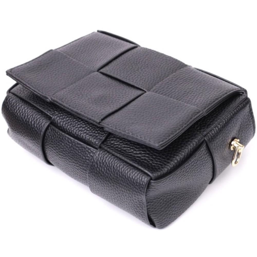 Приваблива жіноча сумка з переплетеної шкіри та кишенею-косметичкою всередині. Виріб пошитий з якісної натуральної м'якої шкіри, яка довго носиться і не втрачає свого первісного вигляду. Аксесуар складається з одного відділення, в якому пристібається кишеня косметичка на блискавці. Носити сумку можна під рукою, на плечі та через плече, для цього є текстильний ремінь, що знімається. У виробі використано якісну фурнітуру кольору жовтого золота. Універсальний варіант сумки як на вечір так і як сумочка на кожен день.