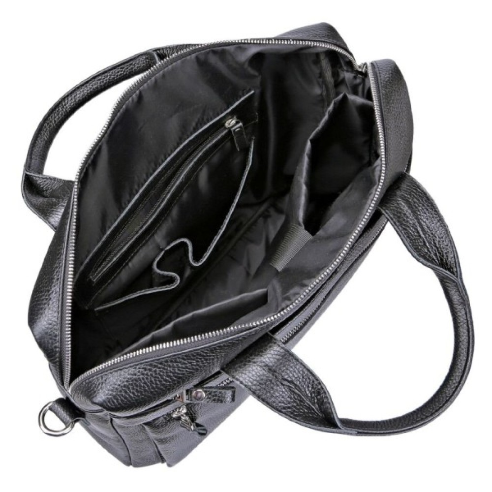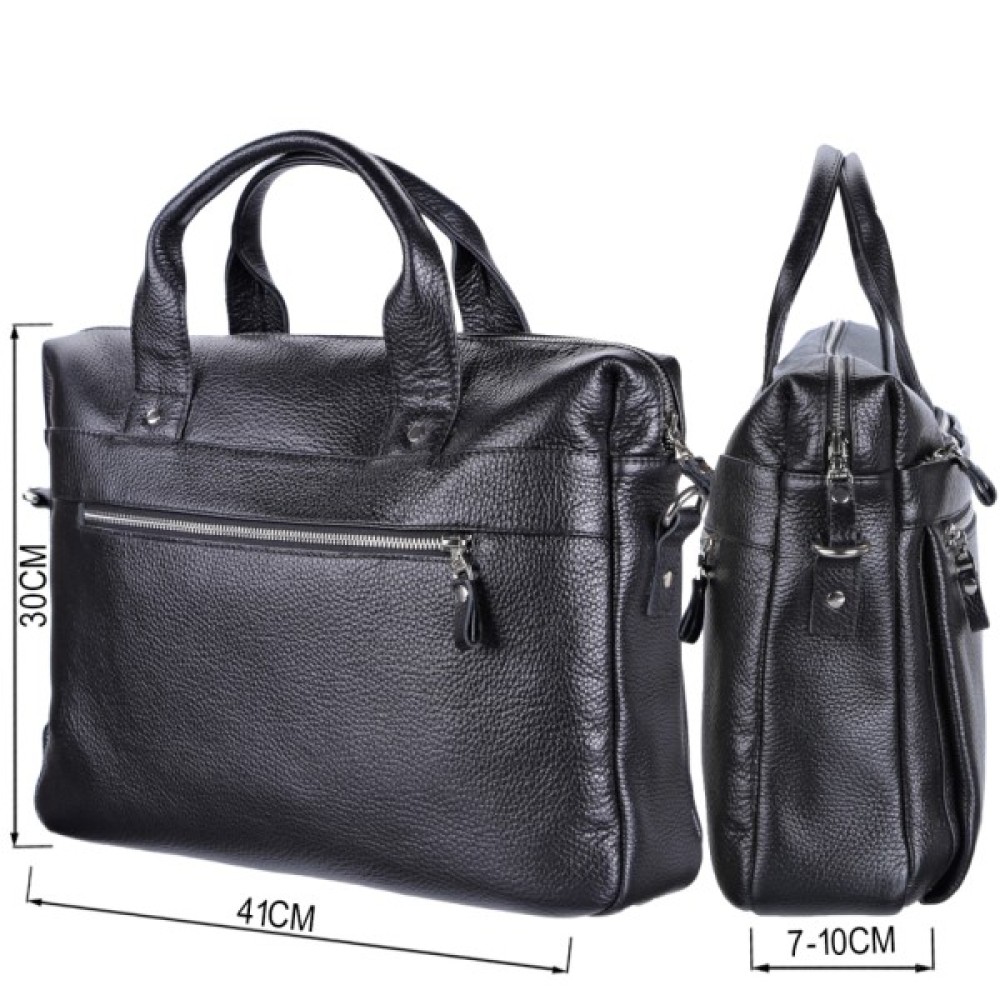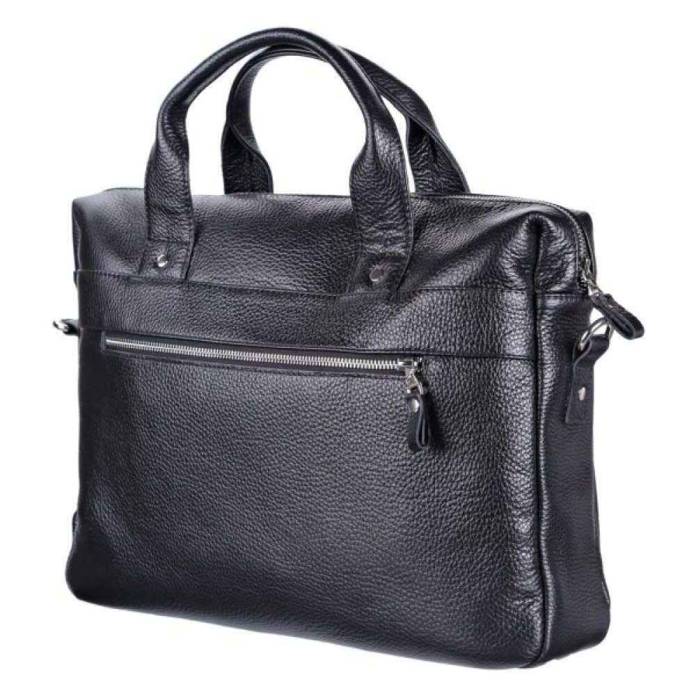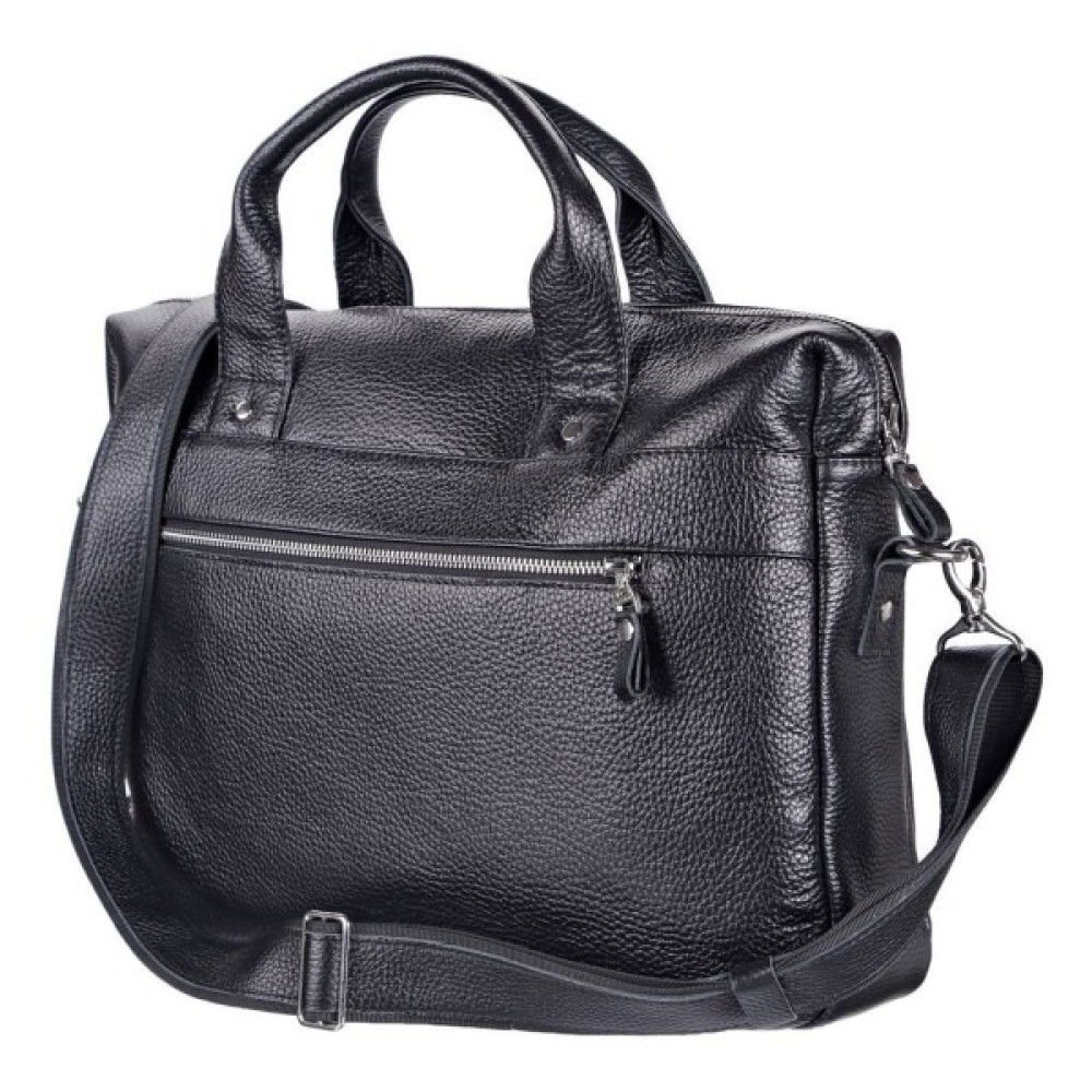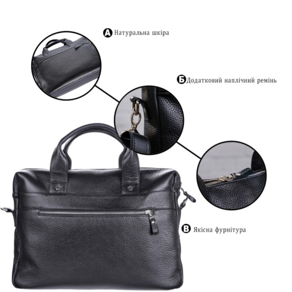 Особливості на тильній стороні кишеня на блискавці; дві шкіряні ручки; кишеня на блискавці, на лицьовій стороні; вміщує формат А4; знімний регульований плечовий ремінь; для ноутбука; для планшета