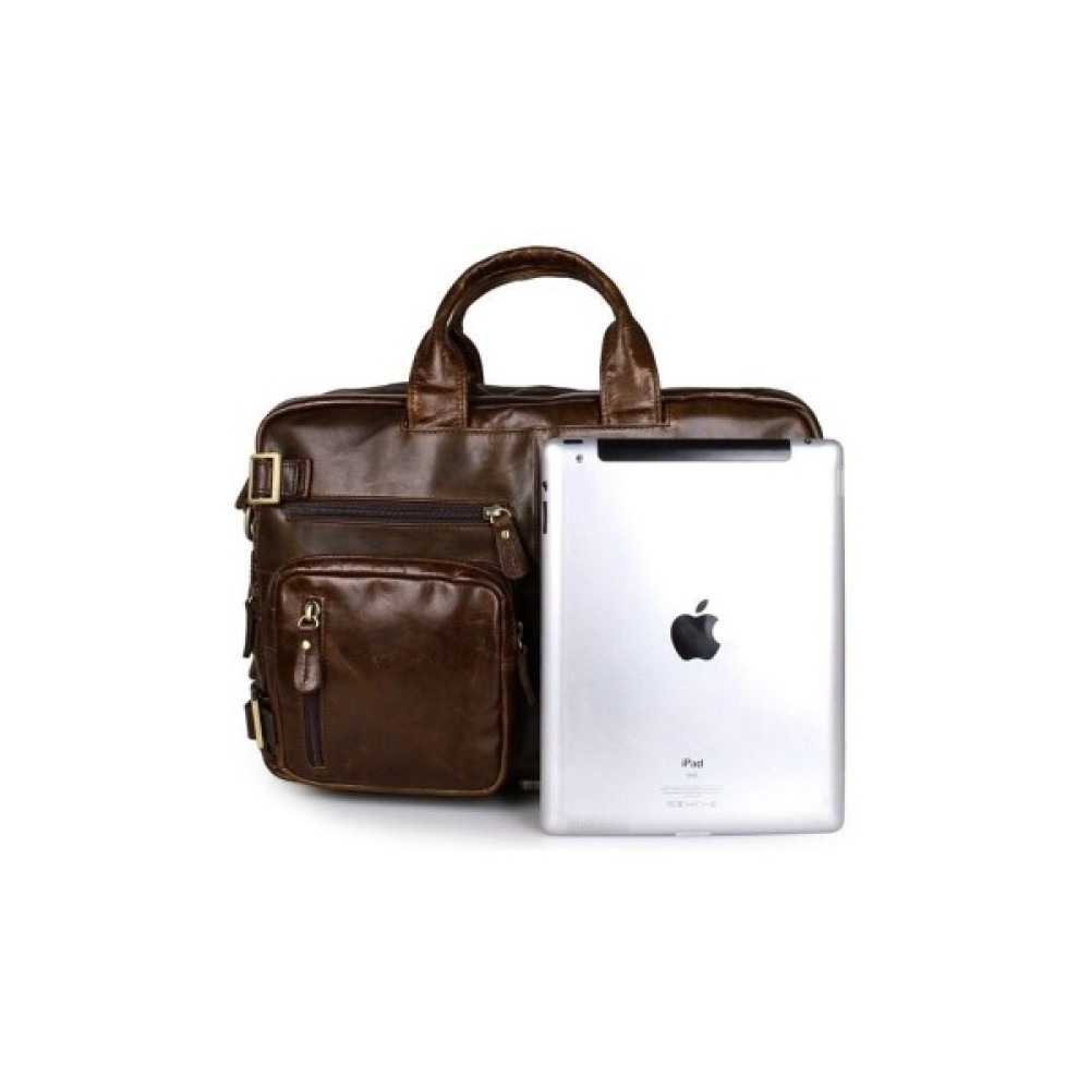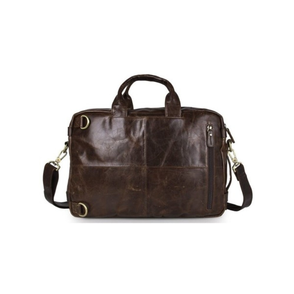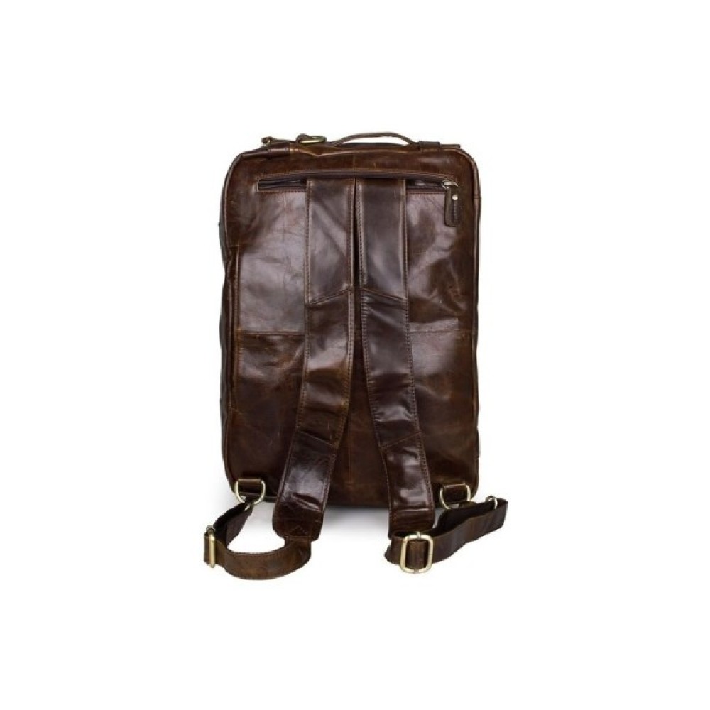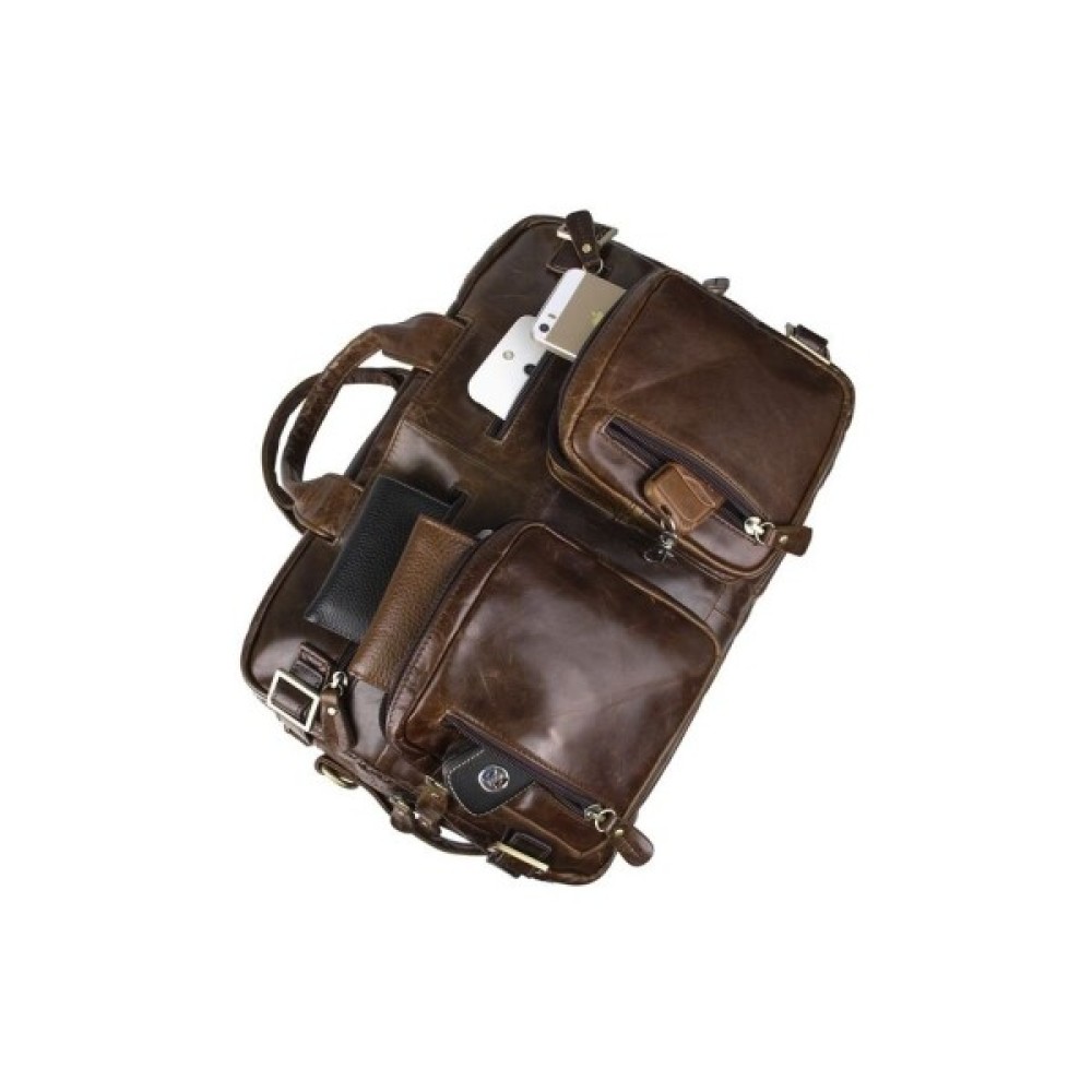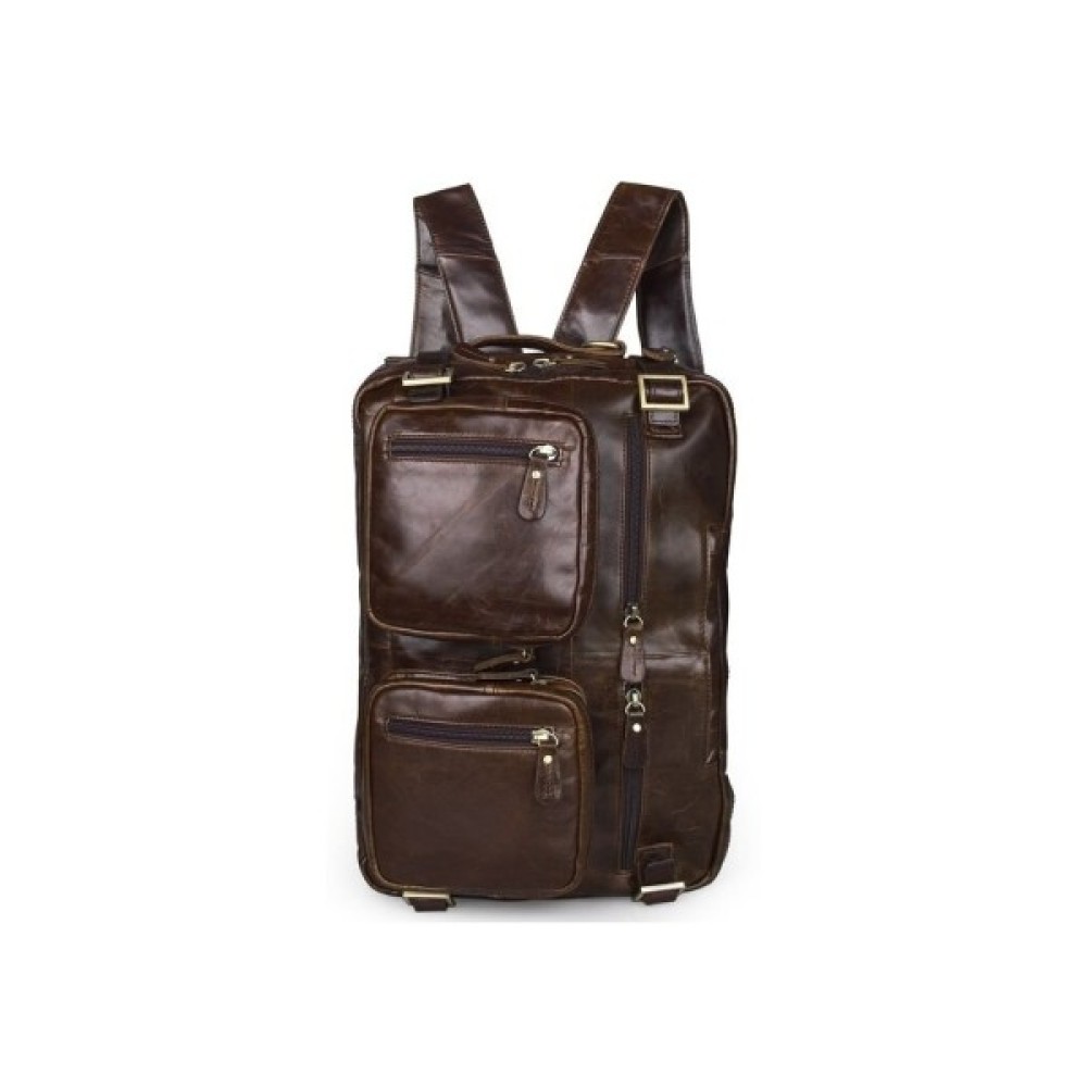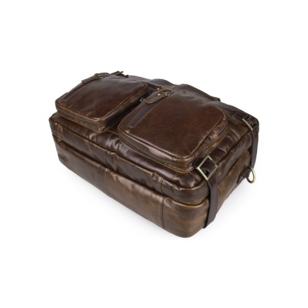 Ексклюзивна сумка-трансформер з натуральної вінтажної шкіри коричневого кольору. Аксесуар надзвичайно зручний, практичний і функціональний. Така сумка, безсумнівно, повинна сподобатися сучасній людині. Аксесуар має безліч кишень, його можна носити в руці, через плече, а також як рюкзак.