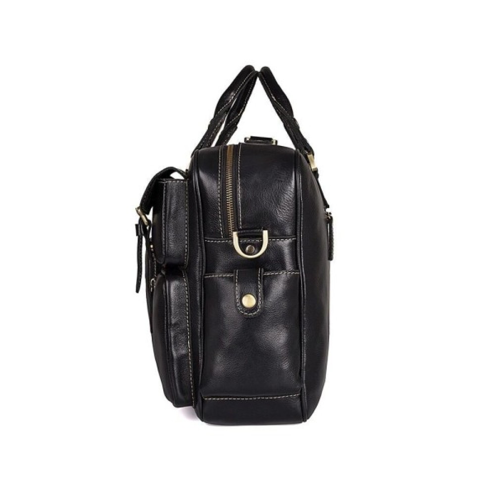 Багатофункціональна чоловіча шкіряна сумка з натуральної високоякісної шкіри. Аксесуар прошитий міцною ниткою білого кольору. Колір фурнітури: мідь. Сумка виглядає дуже стильно і красиво. Вона має безліч кишень і відділень, що надзвичайно важливо для сучасної людини. Носити сумку можна за допомогою зручних шкіряних ручок в руці, а також через плече за допомогою плечового ременя. Завдяки своїй високій якості носитися сумка буде довго і при цьому збереже свій презентабельний зовнішній вигляд. Особливості: - одне відділення на блискавці; - всередині є кишені для мобільного і кишеня на блискавці; - на задній панелі - кишеня на блискавці; - з боків сумки є кишені, хлястик на магніті; - на передній стінці - 2 кишені на магнітах і 3 кишені на блискавці; - в комплекті зручний плечовий ремінь; - є дві шкіряні ручки; - також є ручка на верхній стороні сумки.