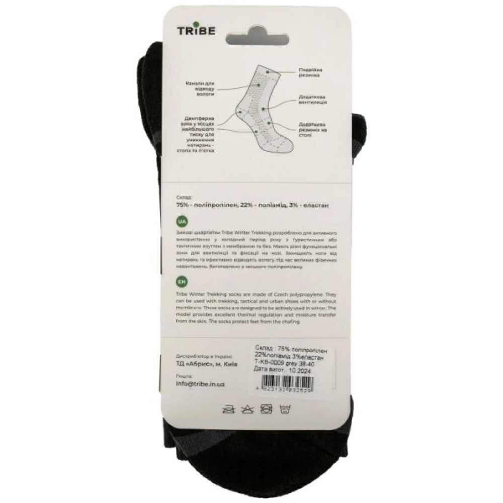 Зимові термошкарпетки Tribe Trekking Winter розроблено для активного використання у холодний період року з туристичним або тактичним взуттям з мембраною та без. Мають різні функціональні зони для вентиляції та фіксації на нозі. Захищають ноги від натирань та ефективно відводять вологу під час значних фізичних навантажень.