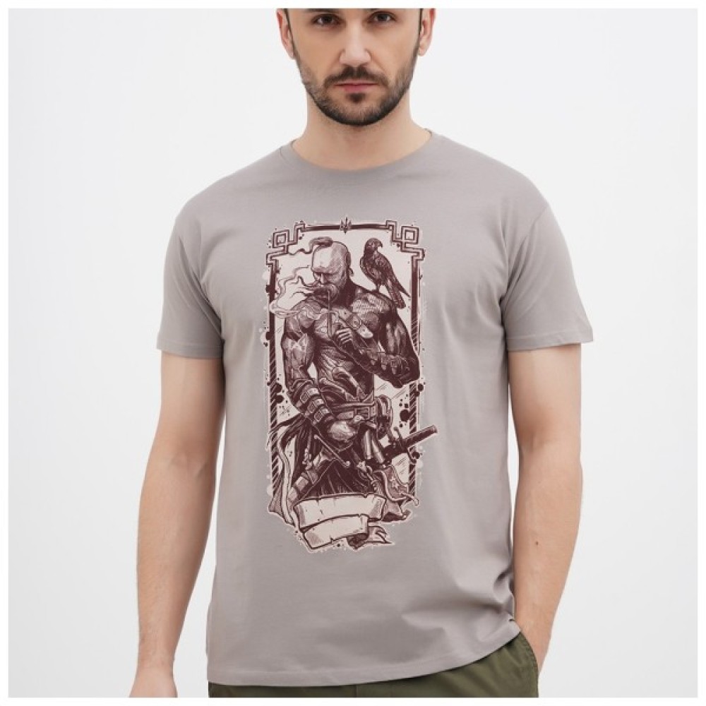 Футболка чоловіча зі стильним принтом "Козак з яструбом", горловина з круглим вирізом, колір світло-сірий, від французького бренду Sols.