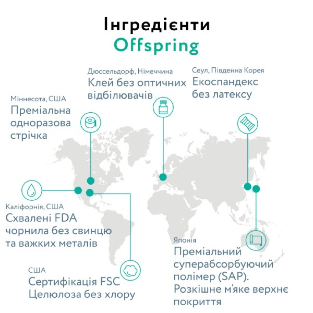 Батьки можуть бути впевнені, що продукт є гіпоалергенним і позбавленим шкідливих хімічних речовин, що знижує ймовірність висипів та подразнень. Унікальний дизайн підгузків не лише привабливий, але й відповідає всесвітньо визнаним сертифікатам безпеки для навколишнього середовища і здоров'я вашої дитини. Вибираючи Offspring, ви обираєте турботу, комфорт і надійність, підтверджені міжнародними стандартами.