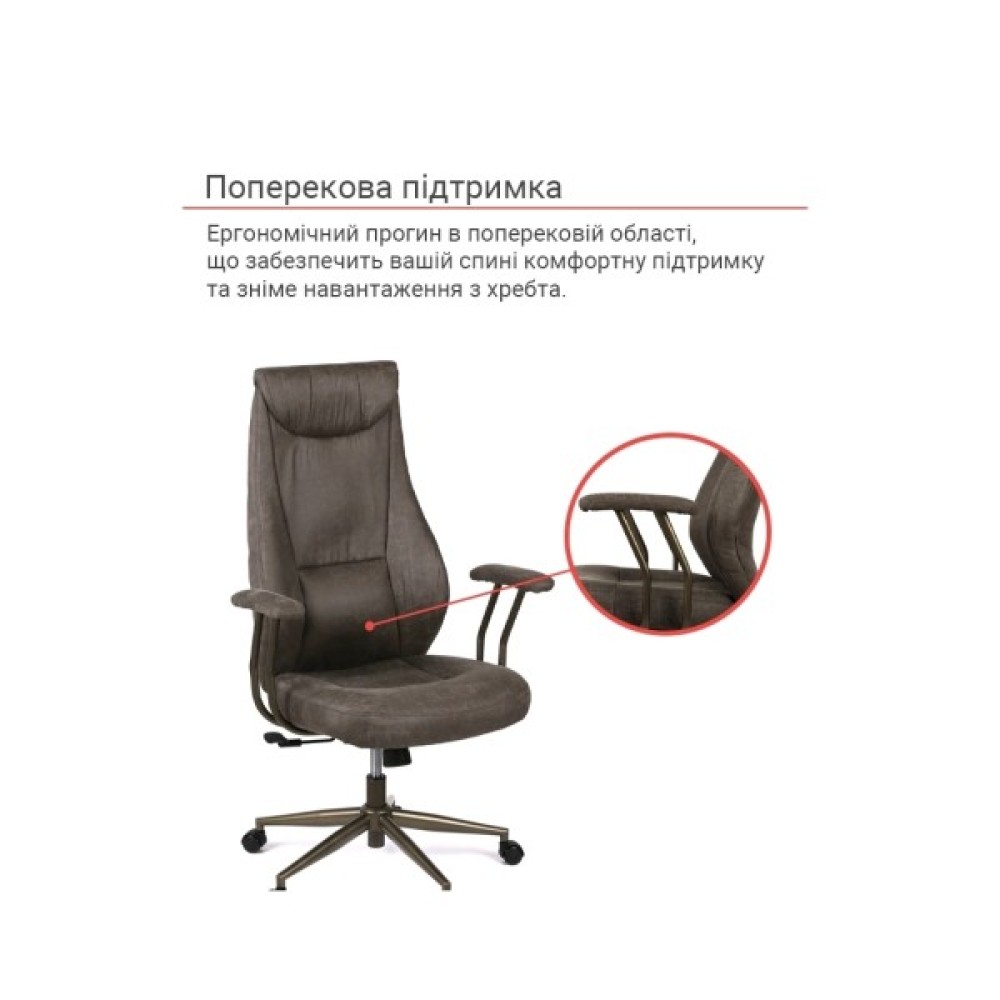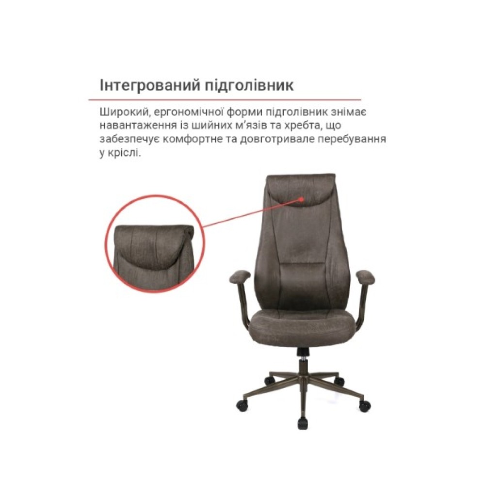 Особливості. Крісло має анатомічний вигин спинки. Особлива увага приділена підтримці поперекового відділу, що критично важливо для здоров'я спини. Інтегрований підголівник не просто прикріплений зверху, а є частиною конструкції, що забезпечує підтримку шиї без зайвих щілин.