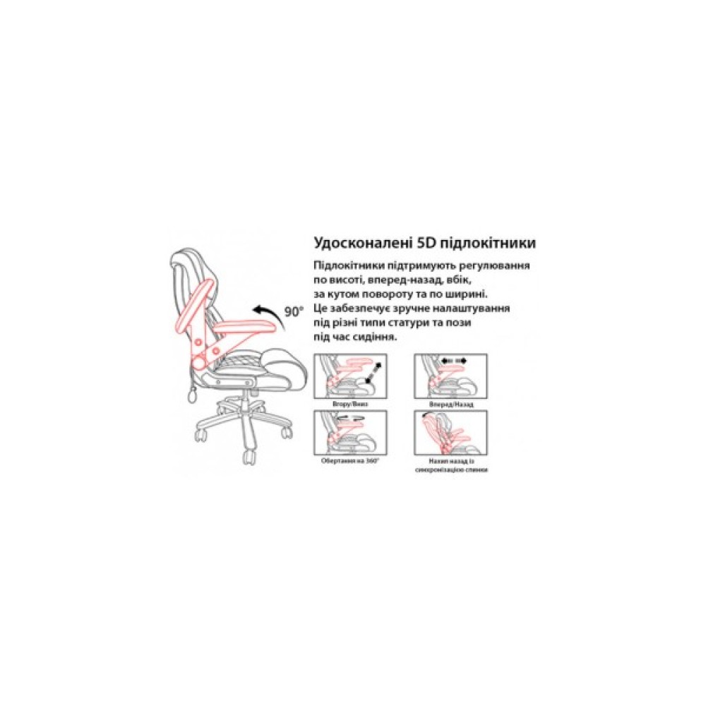 Підлокітники 5D мають м’які накладки та забезпечують зручну підтримку рук, знижують навантаження на плечі й шию під час роботи з клавіатурою чи мишкою. Для більш ближчої посадки за столом їх можна відкинути назад. Конструкція передбачає підтримку для користувачів великої комплекції чи високого зросту — кресло підійде тим, кому важливо комфортне, стабільне і просторне сидіння. Механізм Tilt дозволяє плавно погойдуватися та фіксувати крісло у робочому вертикальному положенні, допомагаючи розслабити м’язи спини й покращити комфорт під час пауз між задачами. Інтенсивність гойдання також можна регулювати ручкою під сидінням.